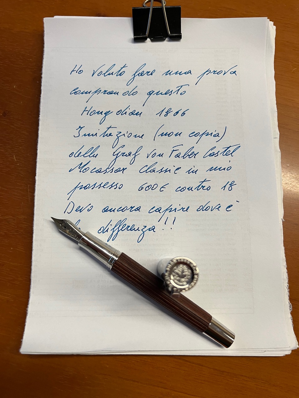 Ora non dico che sia uguale perché delle differenze ovviamente ci sono nei particolari e nella finiture, in particolare la clip dell’originale è un capolavoro al quale la cinese neanche si avvicina ma per il resto è una bella penna, godibilissima che scrive benissimo con il suo pennino F.