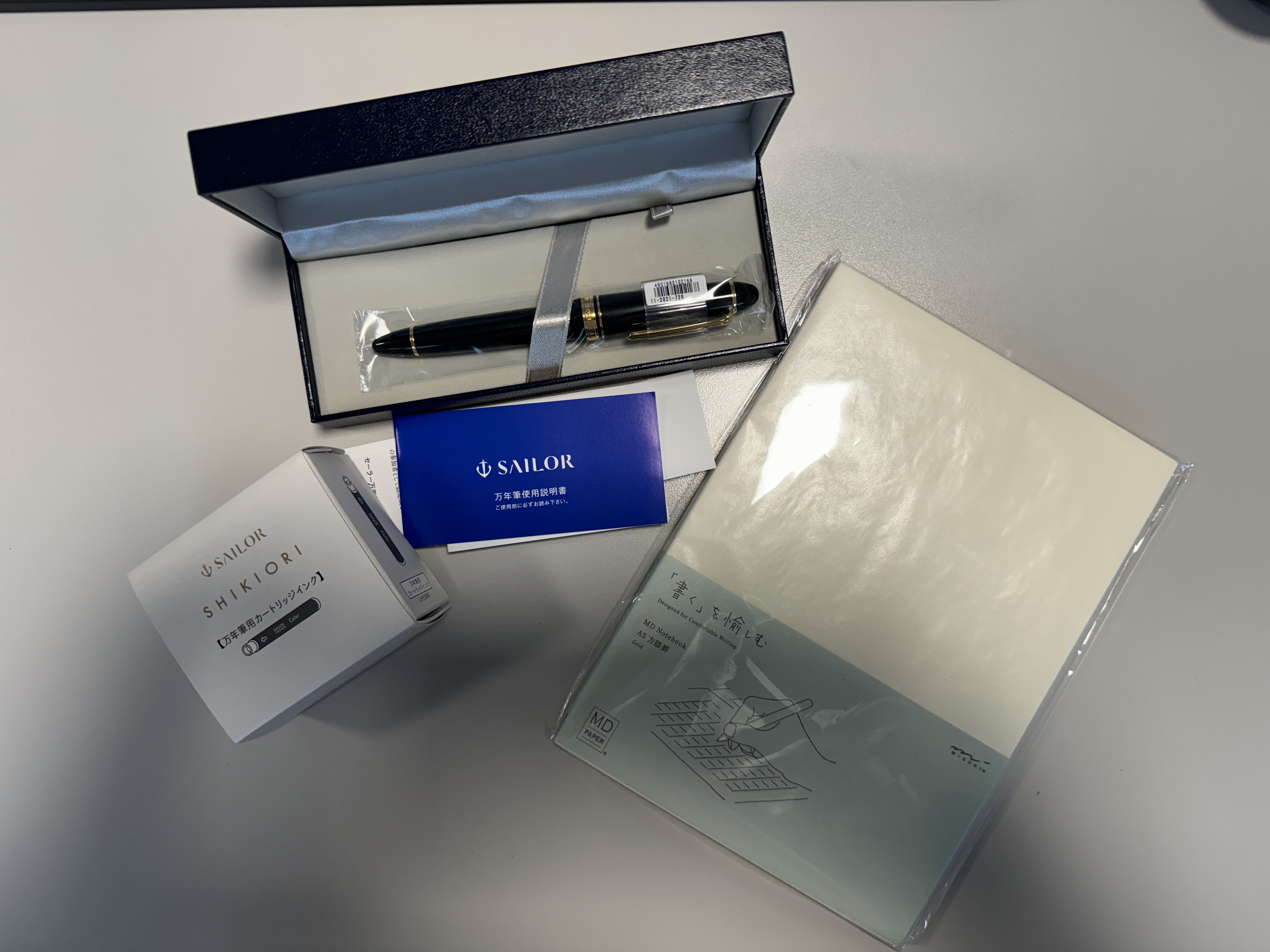 Dopo un periodo di relativa calma stilografica, non ho resistito...avevo questo tarlo di non avere ancora una Sailor nel mio parco penne... Fatti arrivare, direttamente dal Giappone (con un risparmio esorbitante), una 1911 large (credo...il pennino è a 21kt e se non sbaglio lo montano le large) con pennino Zoom, un quaderno Midori e un bellissimo set misto di cartucce Sailor Shikiori (5 colori, 3 cartucce per colore). 3 giorni tra ordine e ricevimento.