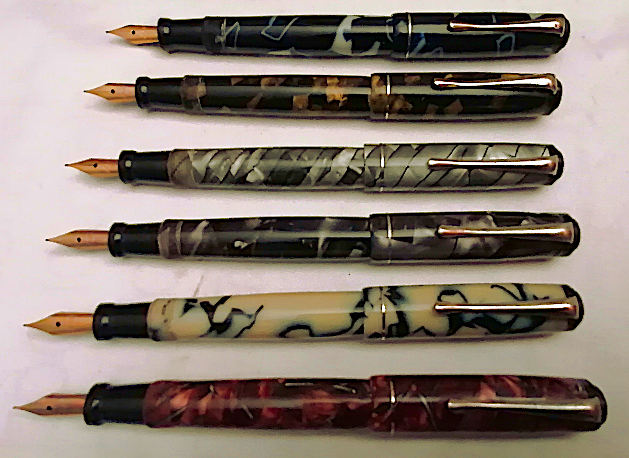 Buongiorno, come mia abitudine domenicale ho fatto un "mercatino tour" e ho trovato un gruppo di sei Caesar (dei tardi anni trenta) nella misura piccola, con pennino dorato originale, e con celluloidi splendide per colori e disegni, tornate lucide con poca fatica.