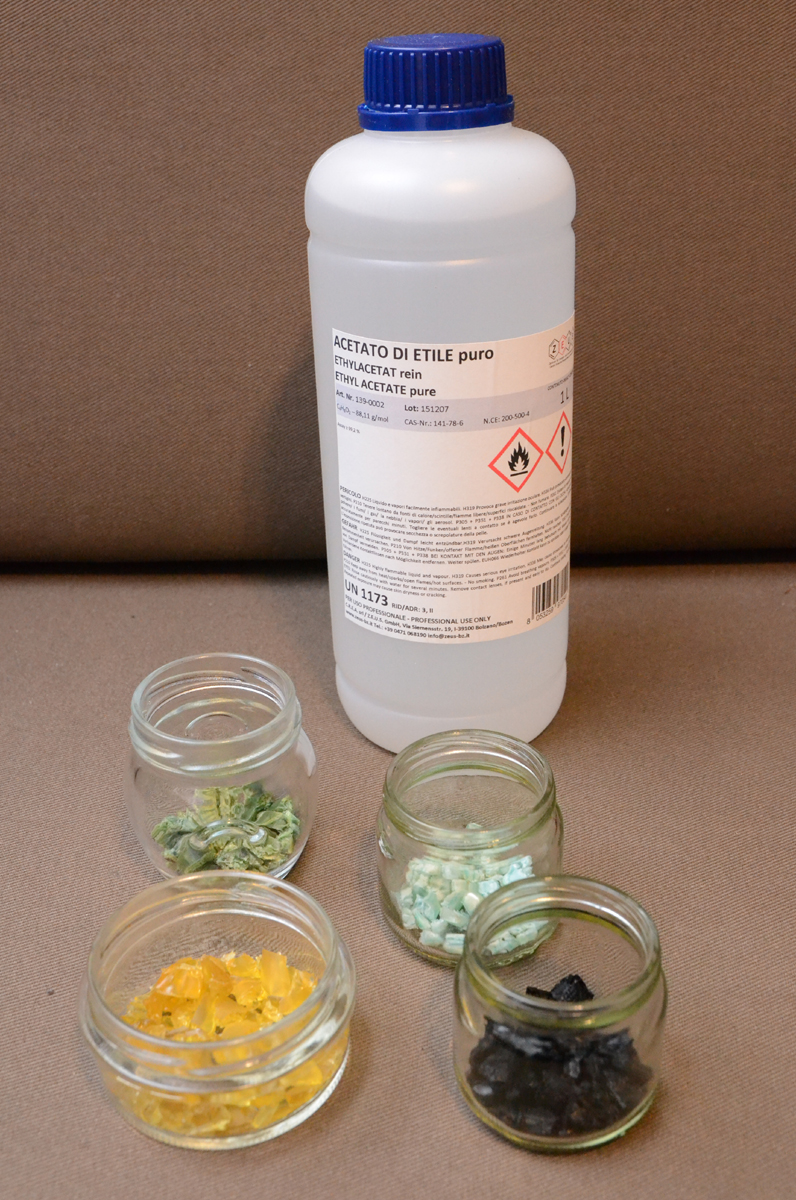 Per quello che può essere il mio modesto contributo basato su un poco di esperienza che mi sono fatto, preciso che la differenza tra l'acetato di etile puro e quello c.d. industriale risiede solo nelle specifiche descritte nell'etichetta. Ossia in quello puro (che poi puro al 100 per 100 non lo è mai) vengono descritte le varie percentuali minime di residui riscontrate. Questo perchè tale materiale viene anche utilizzato nei laboratori chimici ed è importante quali siano tali residui per poterne tenere conto quando si fanno analisi accurate. In quello industriale normalmente non vi è questa differenziazione. E' chiaro che nel nostro utilizzo non fà nessuna differenza anzi conviene utilizzare quello industriale perchè costa meno!