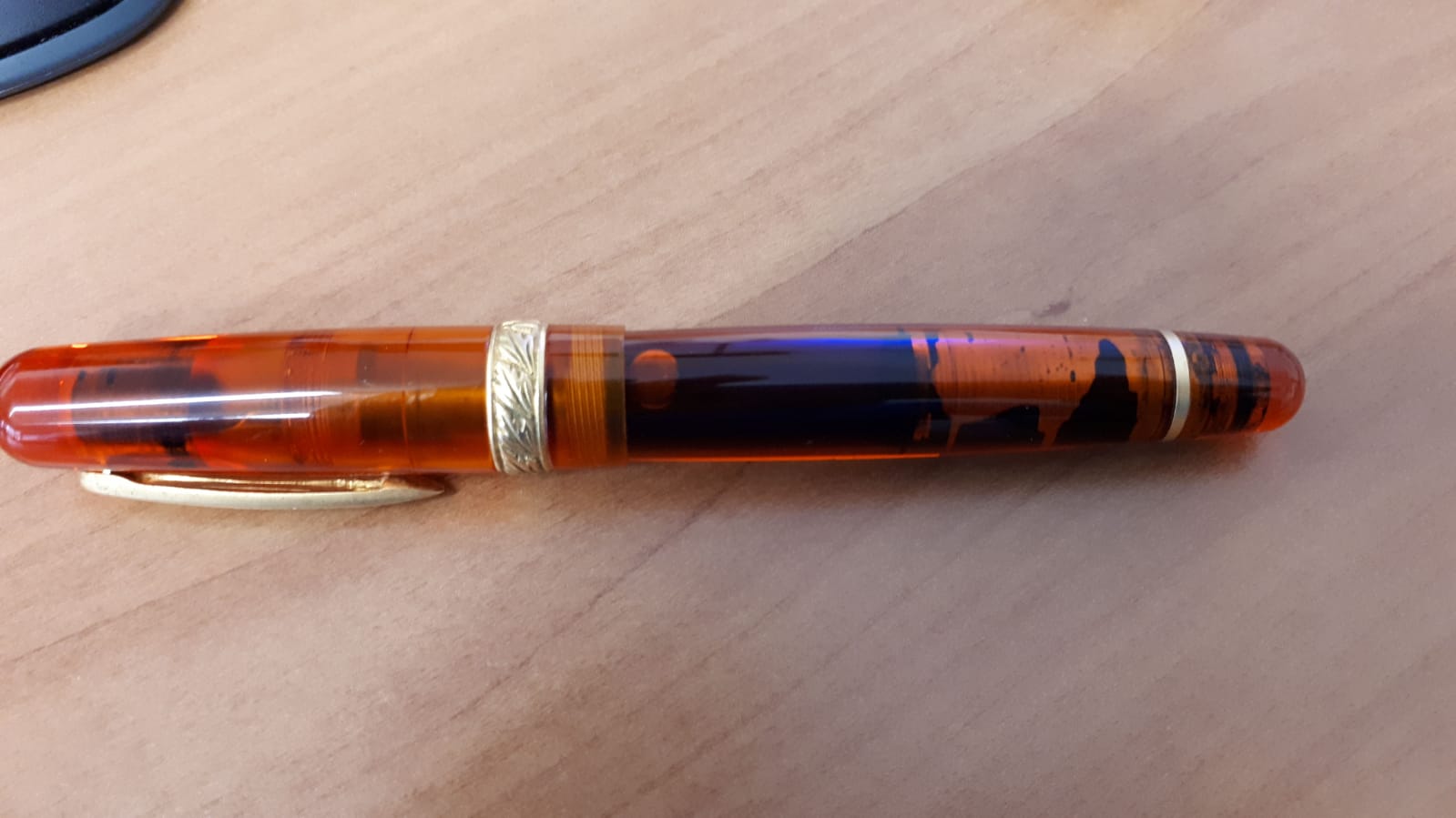La penna della foto, Stipula Etruria Rainbow, il serbatoio si è svuotato e l'inchiostro è trafilato dal serbatoio nella borsa attraverso il fondello.