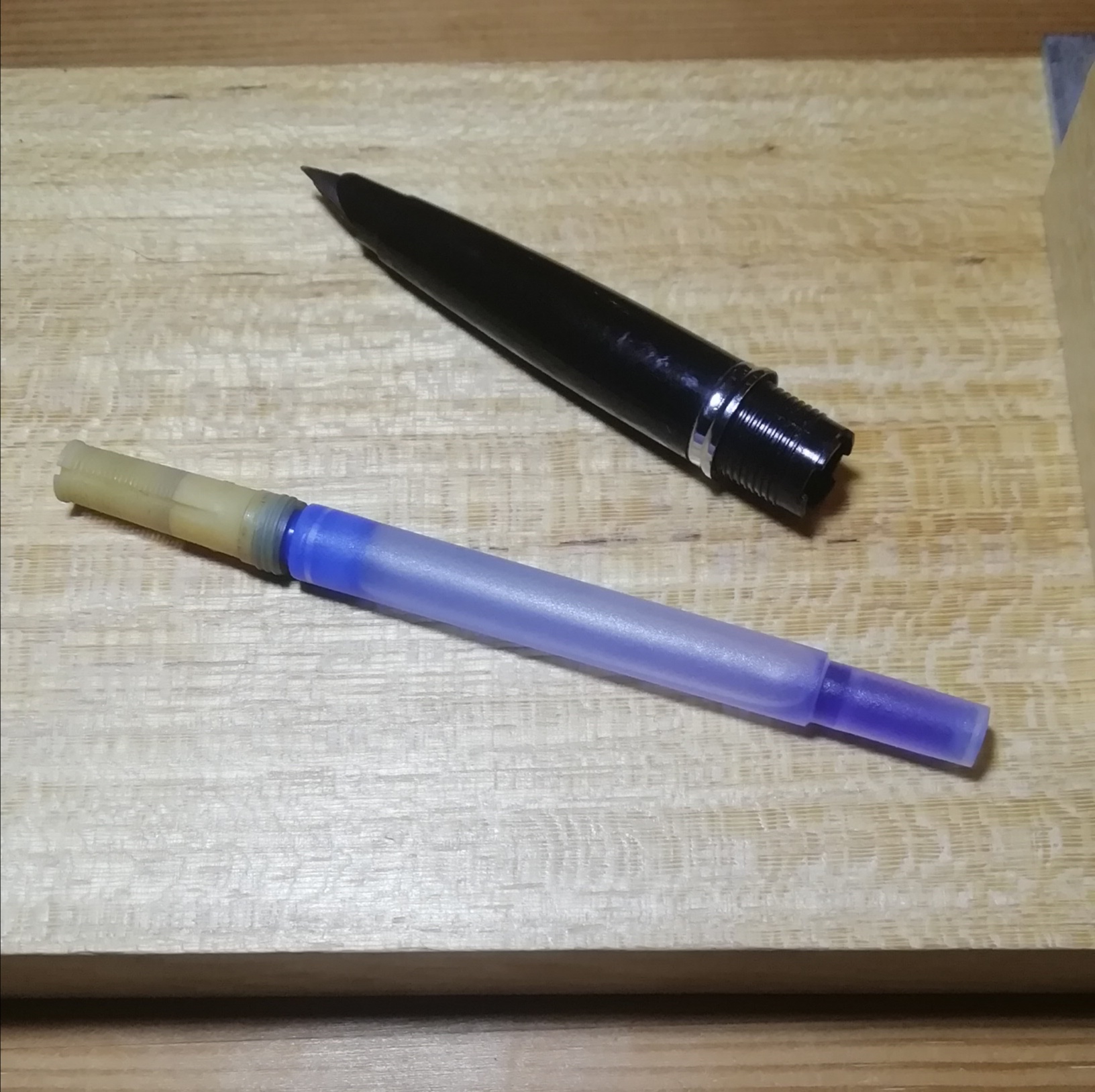 Ora, quella blu, made in france, ha un problema di gocciolamento, ovvero dopo aver messo la cartuccia (o il converter) e iniziato a scrivere, comincia ad aumentare il flusso a dismisura il flusso, fino in breve tempo a formare un bel gocciolone sulla parte inferiore del pennino.