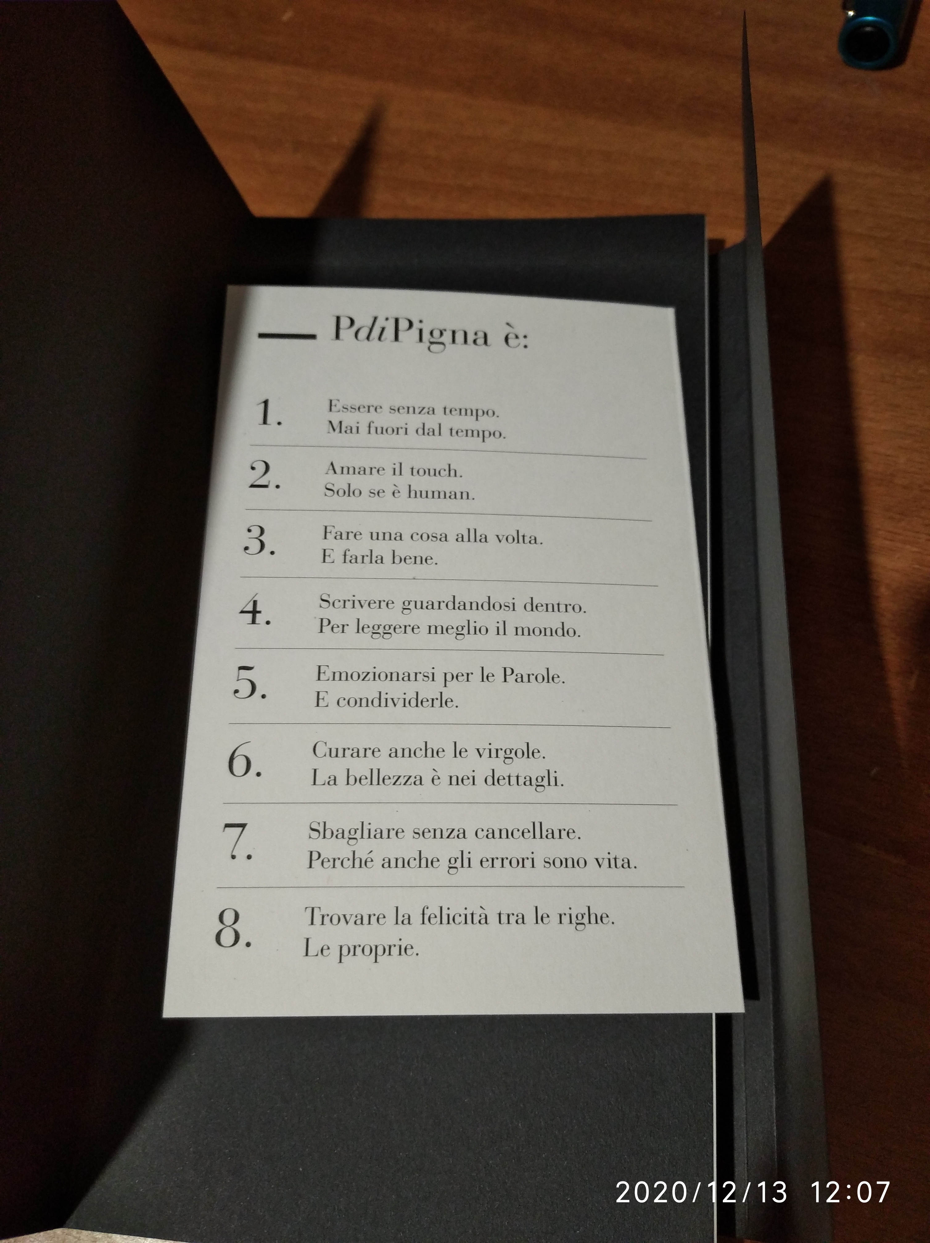 Presa anche io la PdiPigna, però quella giornaliera. Informo chi vuole fare altrettando che è un'agenda molto "scarna" dentro: non troverete cartine, rubriche, calendari riassuntivi e quant'altro. Contiene solo un frontespizio su cui inserire i propri dati, poi parte subito coi giorni dell'anno. In appendice ci sono mi sembra una decina di pagine vuote da destinare a qualunque cosa abbia in mente il possessore. Io ne ho usata una per gli indirizzi della corrispondenza, per dire. A me piace un botto, ma può non essere per tutti, specie per chi usa un'agenda per lavoro...