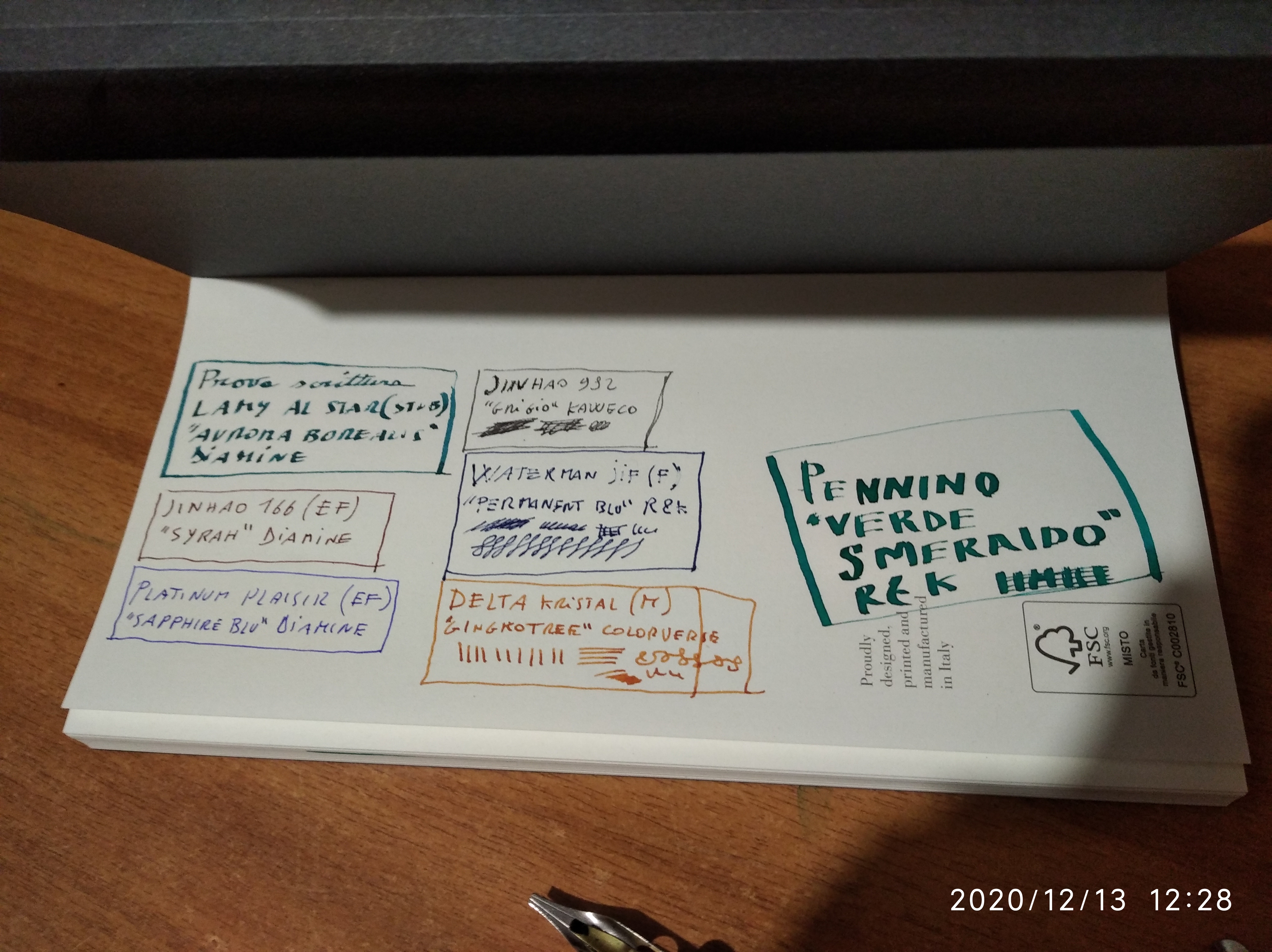 Giudizio finale: pur non essendo una carta destinata alle stilografiche, secondo me vale l'acquisto, perché ha almeno un paio di caratteristiche che la rendono valida anche per noi stilofili. Avendomi convinto quindi prenderò anche l'agenda. E non penso mi fermerò a lei...