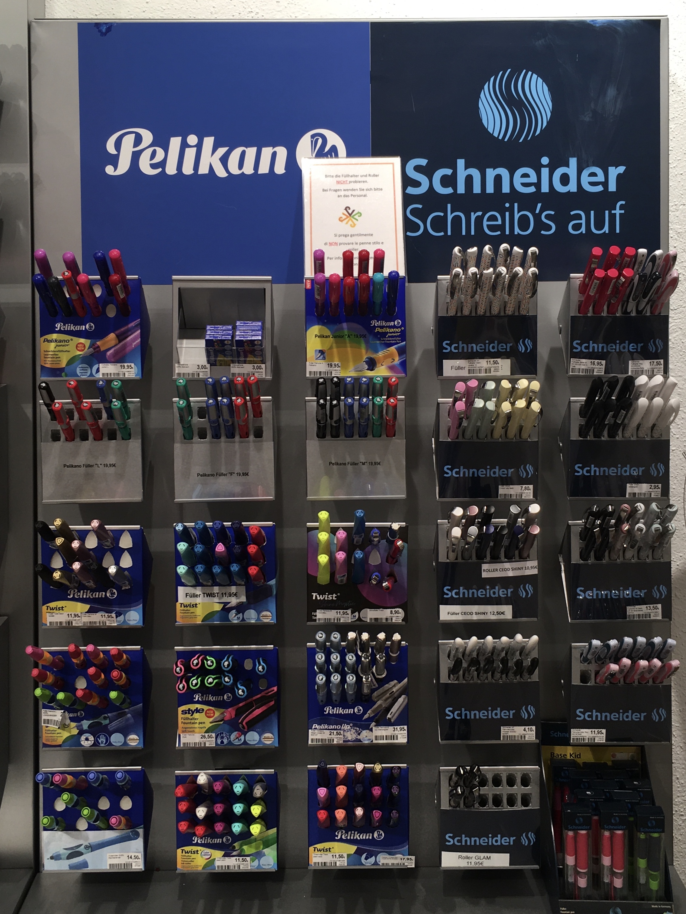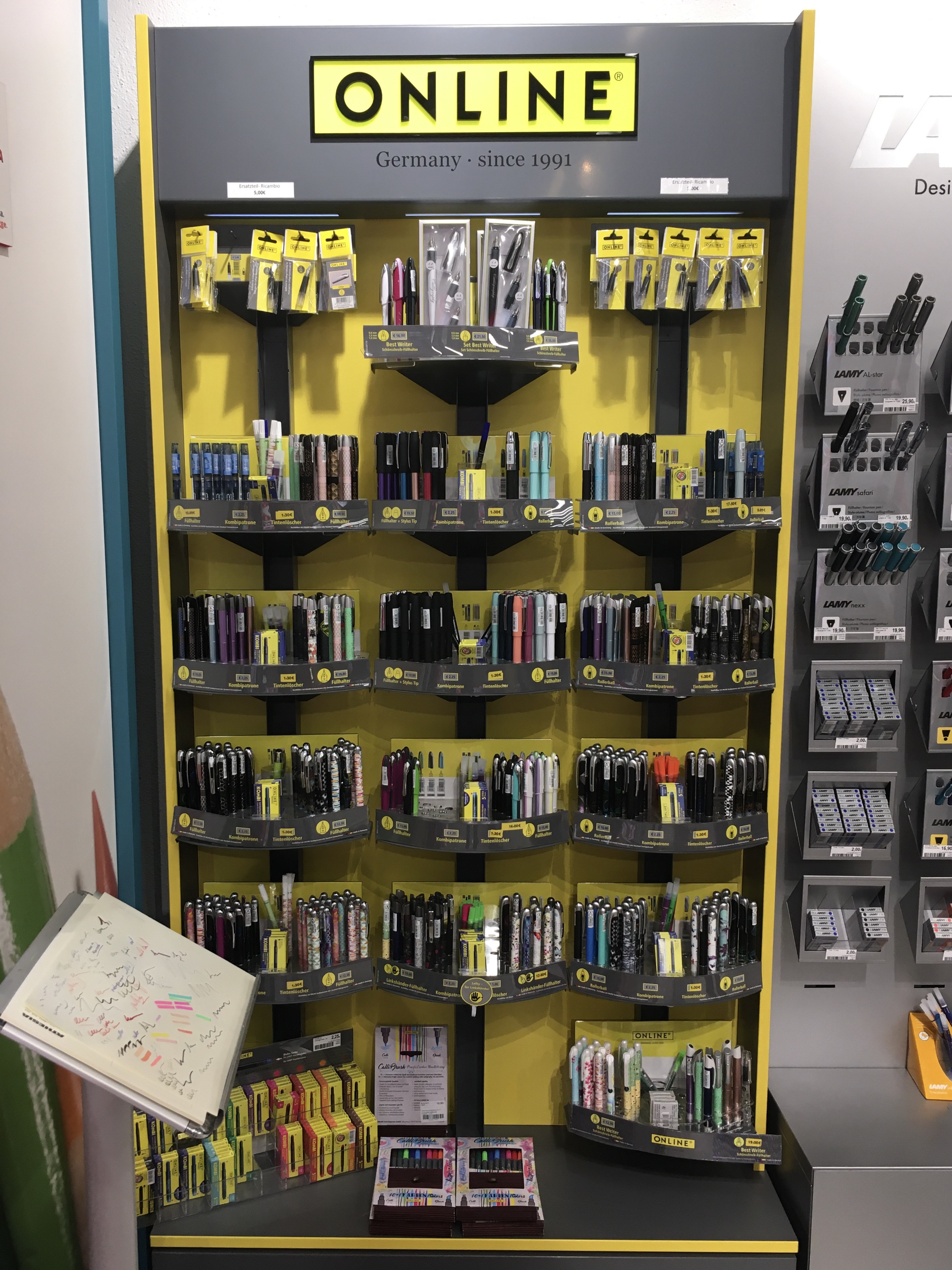 Come vi avevo promesso, ecco una foto dell’espositore Online presente nel reparto scuola di una delle principali cartolerie (riduttivo chiamarla cartoleria) di Bolzano. Come potete vedere c’è da impazzire per la scelta. Tra quelle esposte mi è piaciuta la Switch expert con il pennino stilografico, oltre che per la tipologia del pennino, perché mi dava una parvenza di qualità maggiore delle altre che sembravano (anche se dubito che lo siano) davvero di una brutta qualità di plastica.