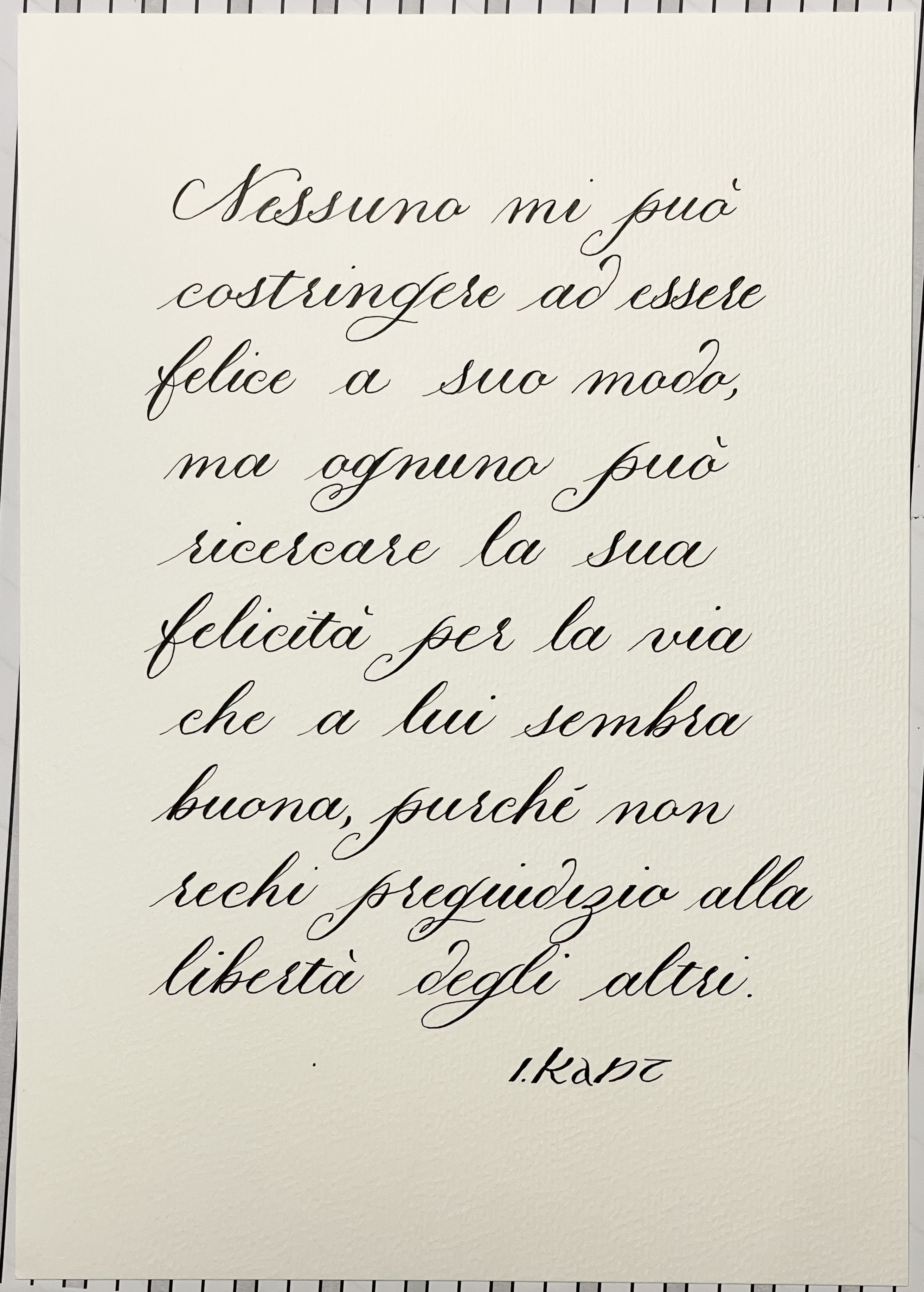 Queste due prove erano fatte con il giusto scopo di provare le varie fioriture e la composizione delle righe (in modo molto marginale visto che né il foglio, né la dimensione del corpo testo erano quelli finali). Prendo comunque nota della regola "articolo, preposizione e congiunzione sempre a capo". L'inizio con la l minuscola è stato deciso per non avere 2 maiuscole nelle prime 3 lettere, lasciando il peso sul sostantivo, un po' alla tedesca.calli1958 ha scritto: ↑domenica 13 novembre 2022, 16:54 La mancanza di spazi laterali toglie incisività alla frase (si nota la differenza con il lavoro successivo) e inoltre crea problemi alla distribuzione del testo: è opportuno valutare gli spazi necessari e/o la grandezza del carattere scelto unitamente alle dimensioni del supporto su cui realizzare lo scritto; ovvio che se ho il vincolo del supporto e della rigatura devo decidere come dividere la frase nelle varie righe per cercare la resa migliore con una cercata, più o meno approssimata, centratura delle righe (come mi pare in questo caso). Teniamo conto che, di solito e nei limiti del possibile, si evita di finire la riga con un articolo, una preposizione o una congiunzione. Tenuto conto di tutto questo una possibile suddivisione delle righe poteva essere (qui vado a occhio, necessiterebbe una prova): la Bellezza / ha / il grande potere / di / guarir l'anima. Naturalmente svolazzi, estensioni e prolungamenti di iniziali e finali possono contribuire a bilanciare gli spazi (anche scegliere se "la" farlo con la elle maiuscola o minuscola ha la sua importanza e peso).