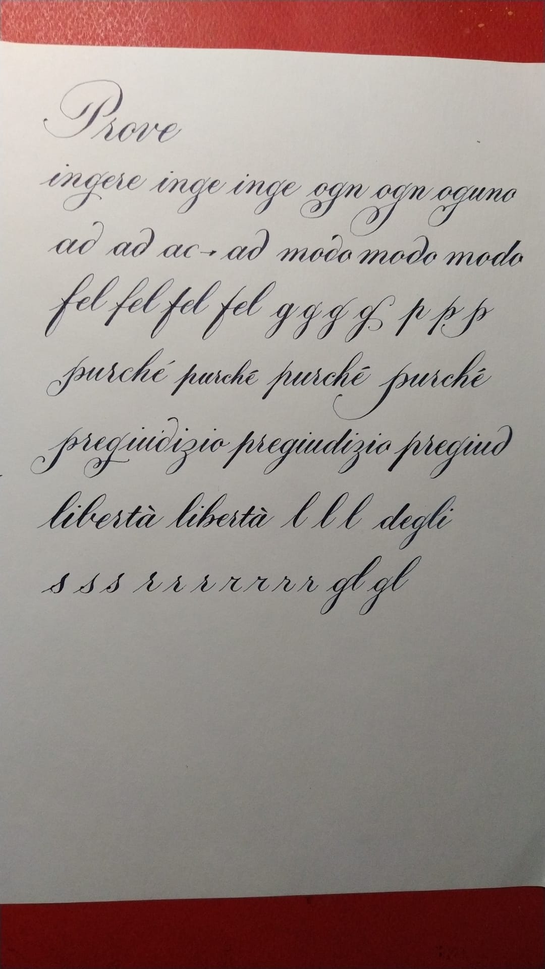 Ti ringrazio dell'analisi, come al solito, molto dettagliata (e apprezzata) e ancora dei complimenti. Mi rendo conto anche io che dopo quest'estate ho fatto un deciso passo avanti, ma che sono ancora solo alla base della scalinata (va beh dai, magari a metà). Mi sembra che stia andando meglio anche l'uniformità dell'inclinazione e delle lettere.