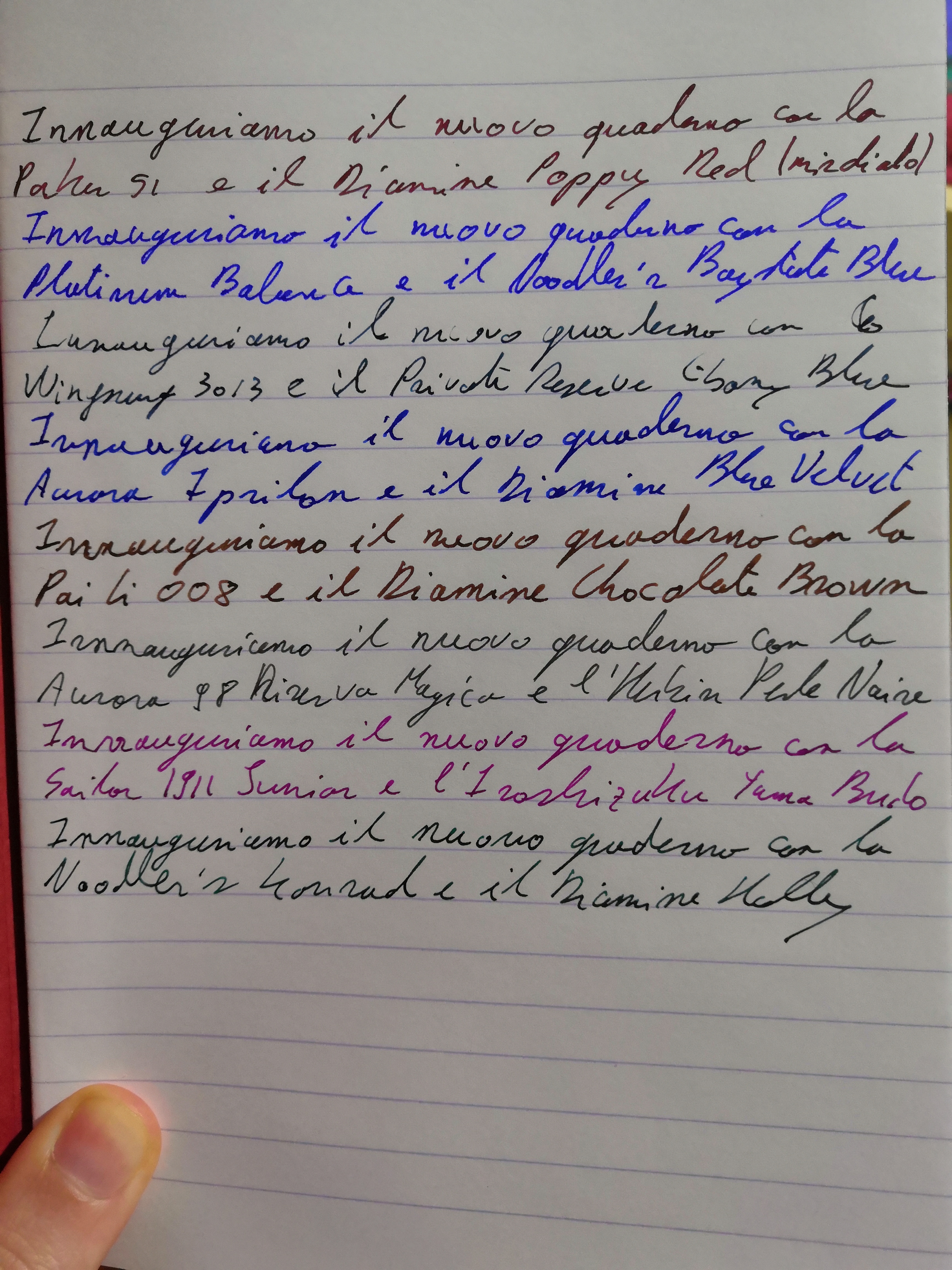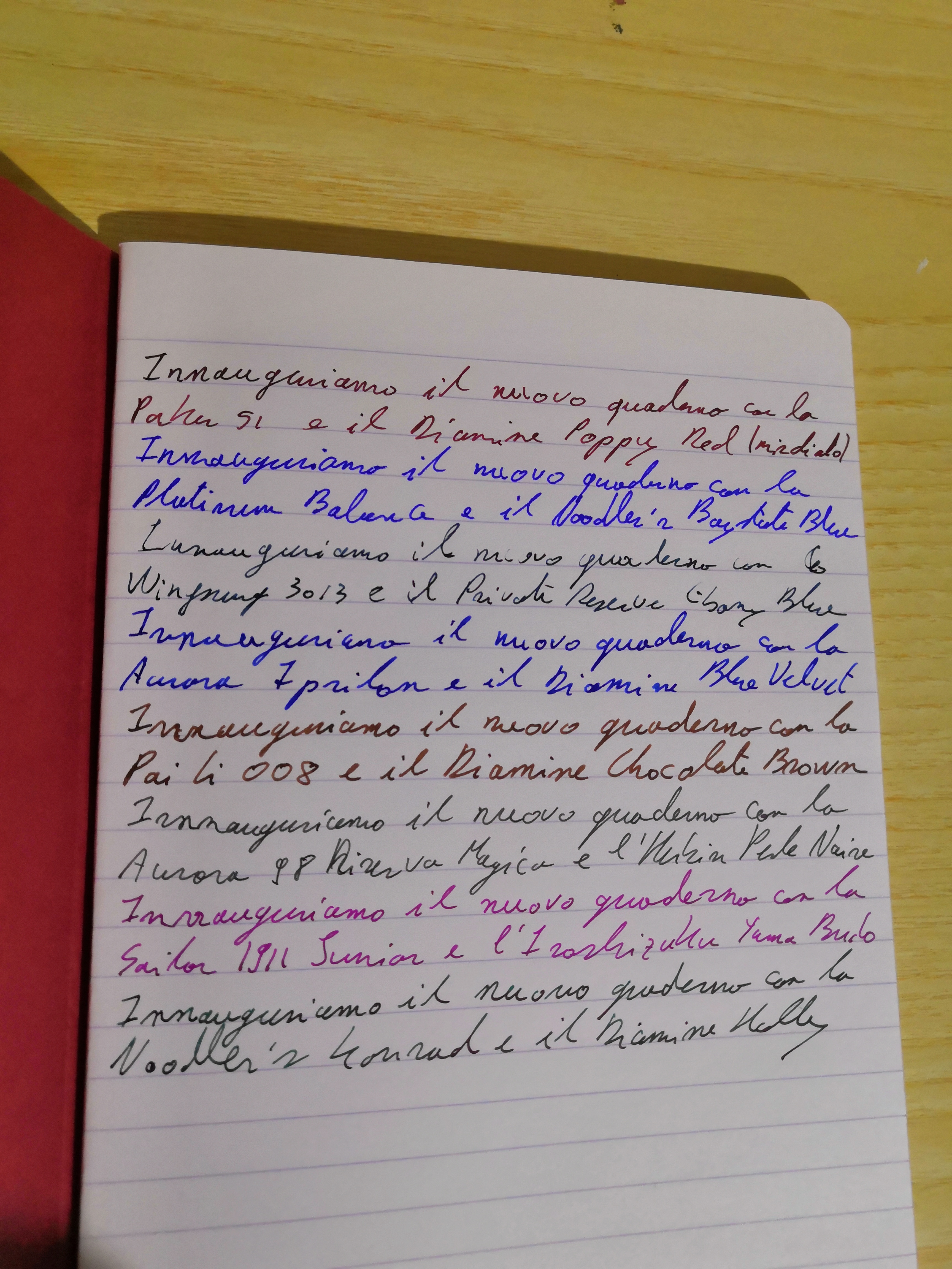 Ecco anche un mio confronto, con una foto non di oggi. I pennini sono tutti fini, tranne quello della Aurora Ipsilon che è un M, quello della Pai Li che è un pennino M Lamy, e la Sailor 1911 Junior che è un M/F, lo stesso pennino della Lecoule. Il quaderno è Clairefontaine