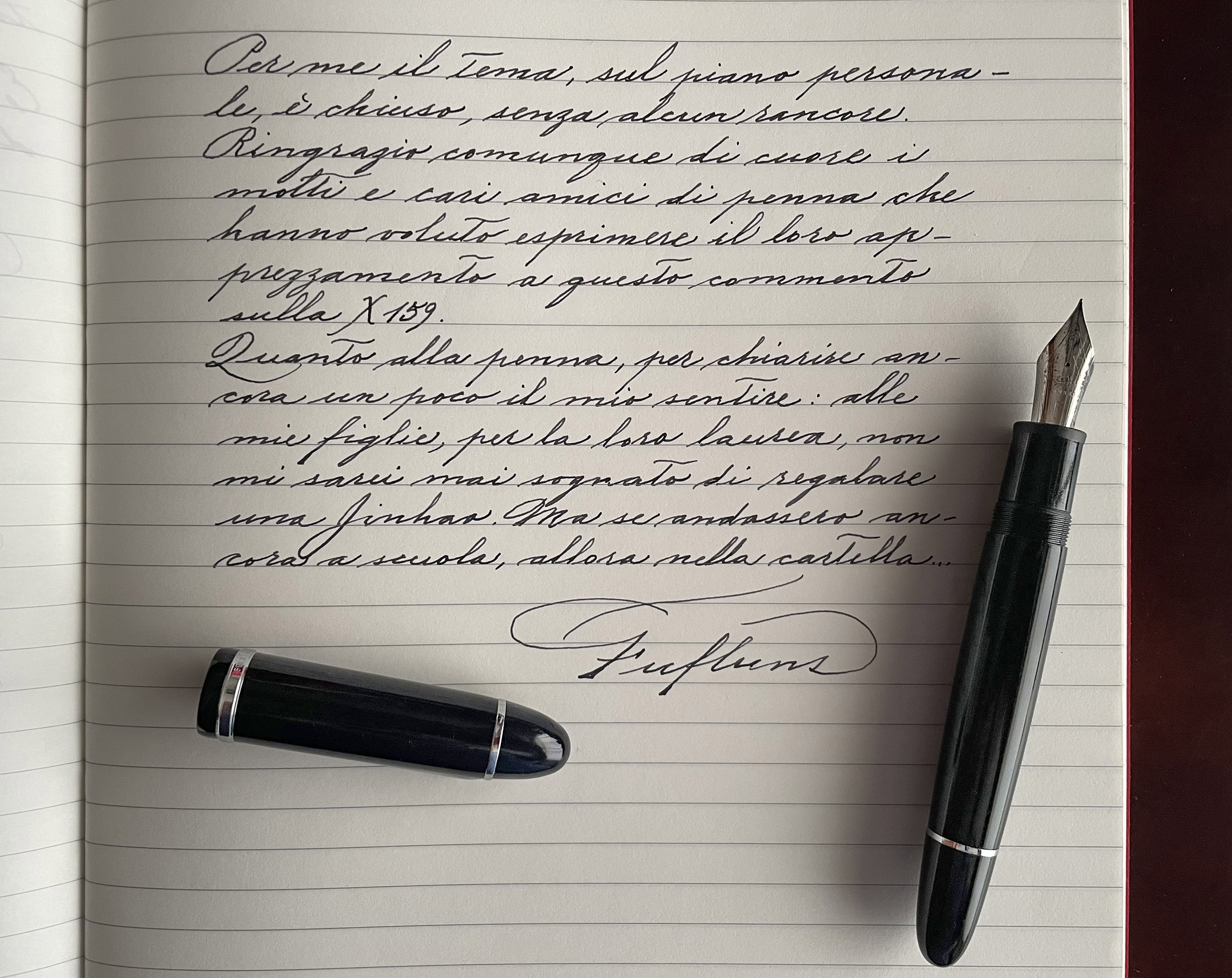 P.S. non ho la X159 e raramente uso la stilografica. Credo che le stilografiche blasonate abbiano quasi sempre prezzi ingiustificabilmente eccessivi e non abbiano quasi mai il fascino e la scrittura delle stilografiche di un secolo addietro.