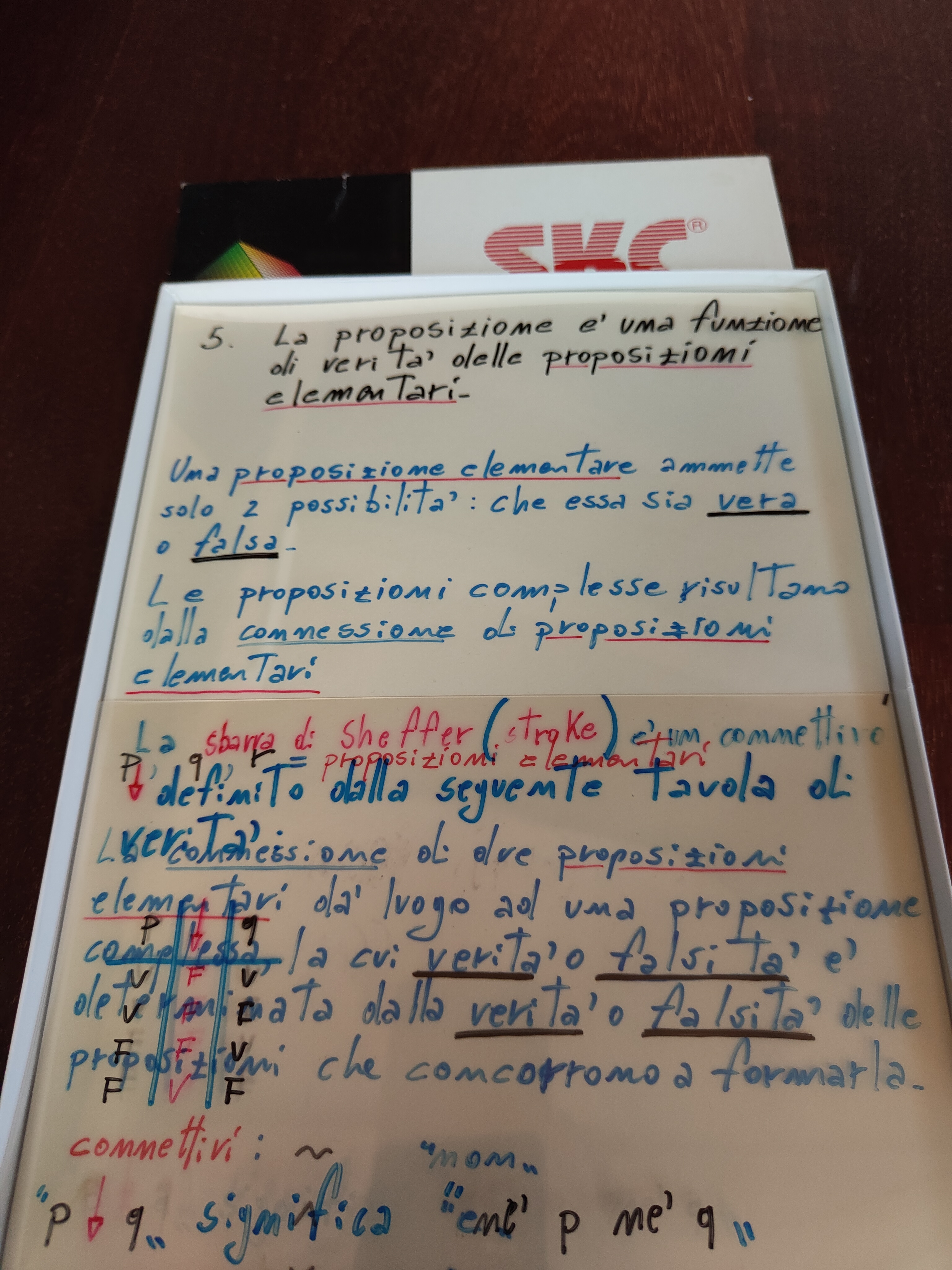 Grazie allo stampatello, me la cavai e mi riuscì di farmi leggere. All' università preparai addirittura dei lucidi per le lezioni introduttive di Logica sulla struttura degli enunciati: Oggi, finalmente, posso permettermi le stilografiche che allora non potevo comprare, e grazie ai pennini stub, italici e obliqui, il mio stampatello si legge abbastanza bene. Le penne "costose" hanno un flusso generoso e continuo, che mi permette di scrivere comodamente e questo mi fa guadagnare in leggibilità. I pennini IB di Pelikan sono perfetti per il mio stampatello, anche se non utilizzabili su tutte le carte. Gli obliqui d'oro di Lamy che ho montato sulle Safari sono comodissimi perché assecondano il modo in cui impugno la penna, lo stesso dicasi della Montblanc OB 146 e della Pelikan M800 OB. Un discorso a parte merita Leonardo a cui ho potuto chiedere dei piccoli accorgimenti sui pennini Cursive Smooth Italic e Architect (entrambi in acciaio): l'Italico l'ho voluto un po' più tagliente, l'Architect con un tratto di base abbastanza largo, gli alimentatori in ABS con un flusso costante su lunghe sessioni, ma non troppo bagnato.