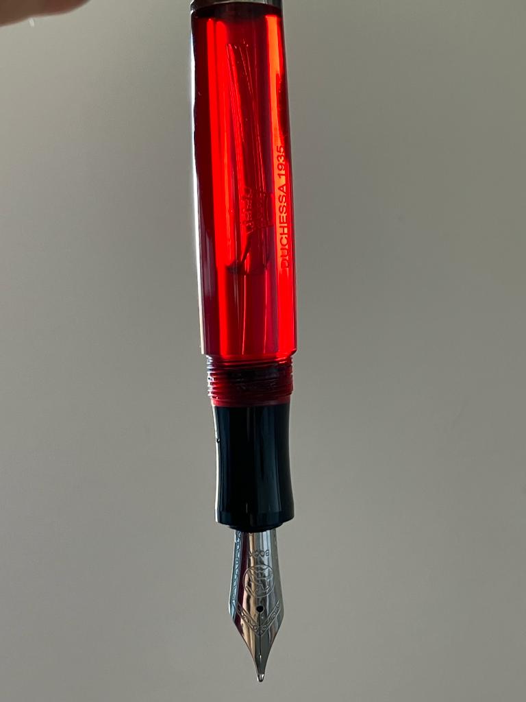 Questo è probabilmente il caricamento massimo in questa conformazione (vuotato il contenuto e raccolto con una siringa si misura 0,8 ml), mi sento di dire, perlomeno a quelli che sono già passati alla sostituzione del collare, alimentatore e pennino, che piuttosto che usarla in eyedropper questa modifica non complessa (tubicino in silicone diametro interno 2mm sul peduncolo del collare facilmente reperibile, e forellino da 1mm nel fondo del collare) permette il funzionamento e riempimento a sfiatatoio come previsto, salvo la possibilità di riempire completamente la penna (ma almeno per due terzi).