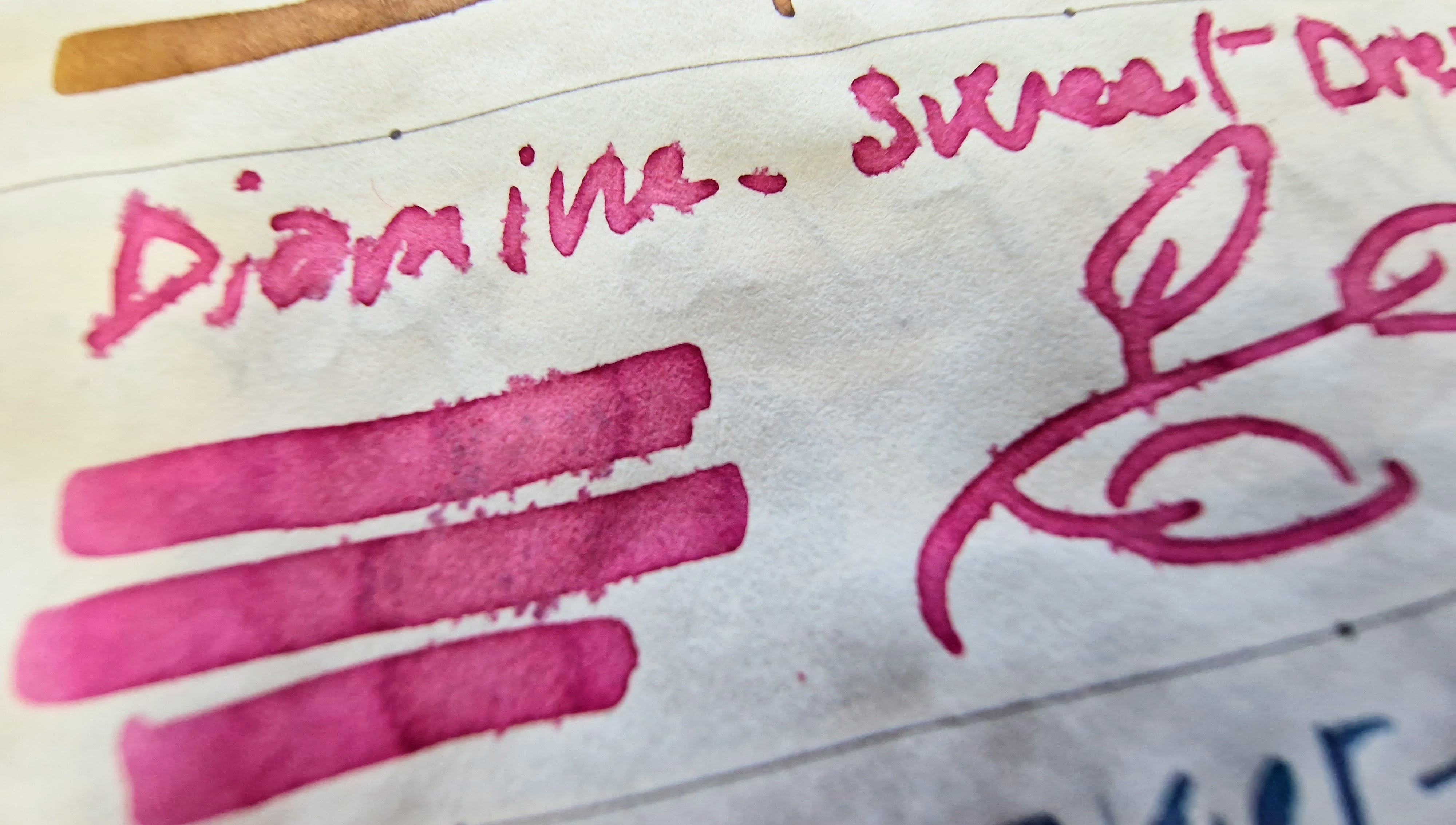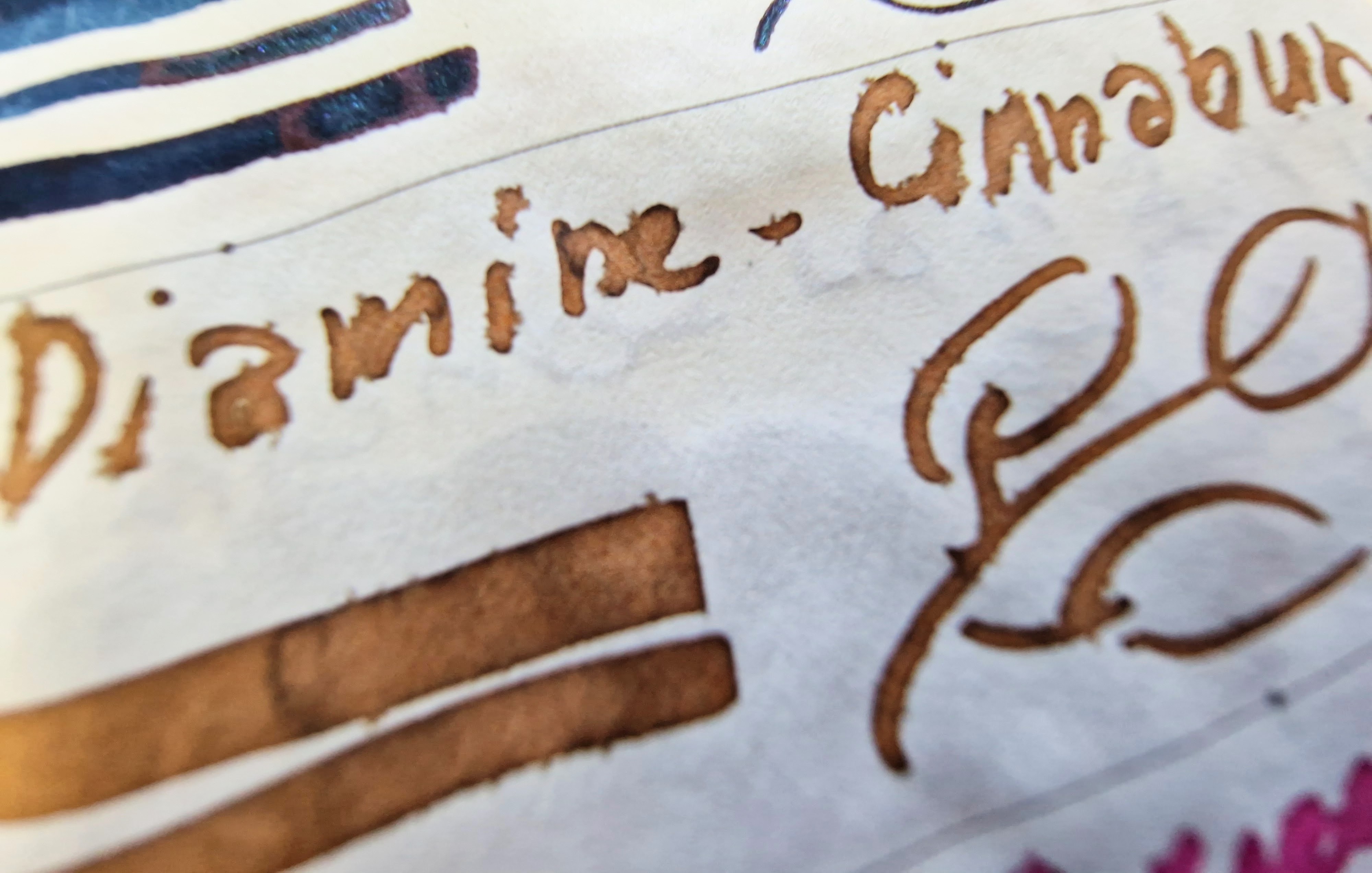 I miei peggiori inchiostri sono, fortunatamente, solo dei sample da 10ml dall'Inkvent Calendar di Diamine: Sweet Dreams e Cinnabun. Sono entrambi inchiostri profumati. E' possibile che il profumo sia a base alcolica e fanno disastri. Riescono a spiumare e a trapassare la carta come se non ci fosse un domani su Tomoe River. Terribili!