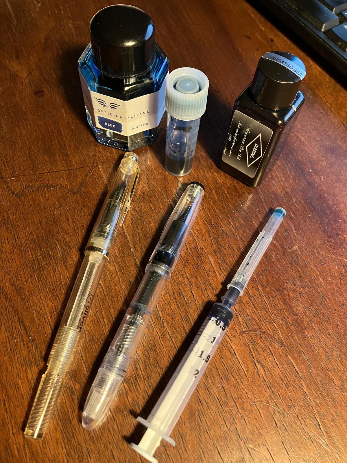 per far le prove, fino ad ottenimento miscela definitiva, spesso uso qualche stilografica molto economica, come la dollar 717i pakistana (se ne prendono 3 con 5 euro...) o la Oliver, penna omaggio indiana.