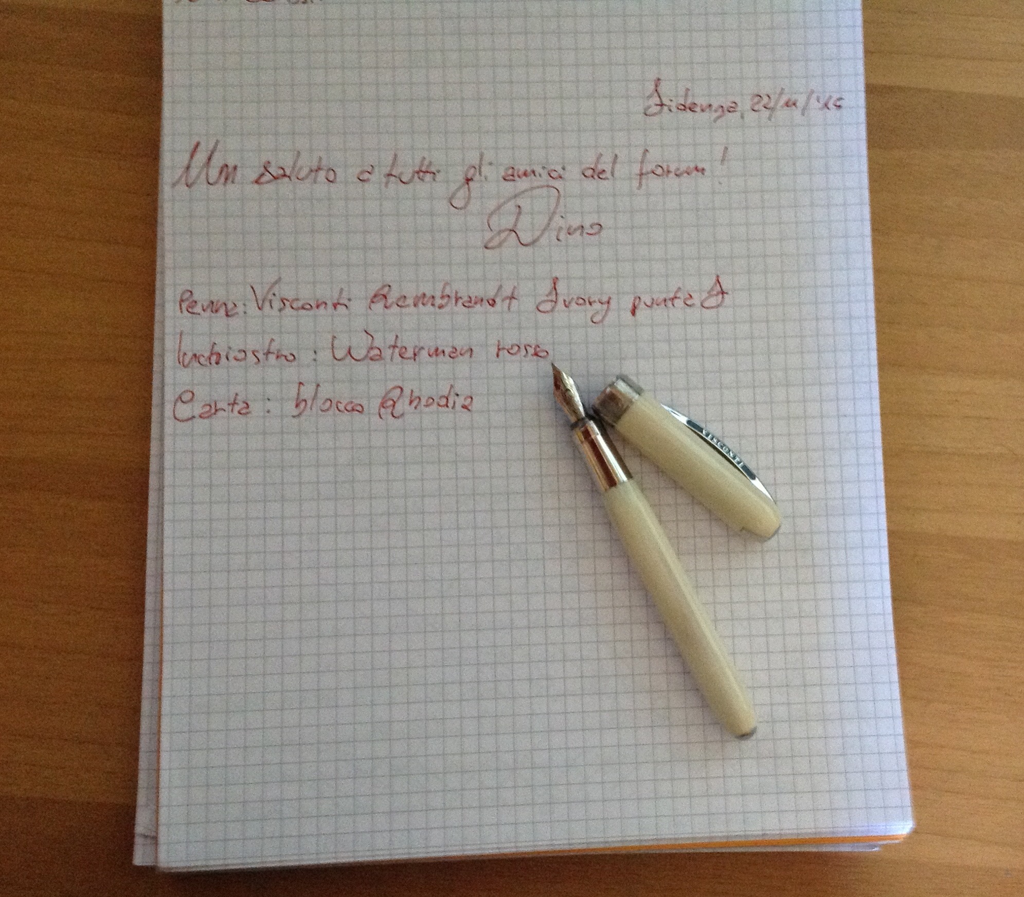 Decido di portare la penna dal rivenditore autorizzato Visconti della mia città, a garanzia scaduta; tale scelta è stata dettata dall'aver ricevuto la penna come regalo di laurea e, pertanto, ho preferito evitare di dover chiedere lo scontrino a chi me ne ha fatto dono. Ecco, quindi, che verso il volgere dell'estate mi presento in negozio spiegando i problemi (false partenze ed interruzioni del tratto) e tutto quanto io abbia fatto per risolvere, compreso il contatto via MP con Dante Del Vecchio; ho spiegato anche la 'questione regalo', ovvero il mio rivolgermi all'assistenza a garanzia scaduta. Vengo avvisato che il costo della riparazione - ossia la sostituzione dell'intero gruppo scrittura - è di circa 60€ e mi chiedono se procedere; io accetto - in quanto la penna in questione ha, per me, un valore che va oltre quello economico - e mi viene chiesto di presentarmi a settembre, dopo il periodo di ferie, affinché si riducessero i tempi di attesa e così ho fatto. A cavallo della metà di settembre porto la penna in negozio e circa una settimana dopo, ricevo una telefonata dal suddetto rivenditore: vengo avvisato che, avendo loro riportato fedelmente il mio racconto in Visconti ed avendo questi verificato la scarsissima usura della punta nonostante i due anni passati in mio possesso, la riparazione verrà effettuata a titolo gratuito e l'unico mio onere sarà costituito dalle spese di spedizione (15€, se ricordo bene). Mi viene anche data la possibilità di scegliere la gradazione della punta: M come in origine (e lasciandomi il mio vecchio pennino) oppure un'altra di mio gradimento (e con la vecchia che rimane in azienda); mi sono preso 24 ore per decidere, in quanto combattuto tra il lasciare il regalo immodificato ed avere una punta con cui 'smanettare', oppure l'avere un tratto di mio gusto, snaturando in parte il regalo. Ebbene, è da allora che la mia Rembrandt con punta F è caricata ed è una delle penne fisse nella mia rotazione....