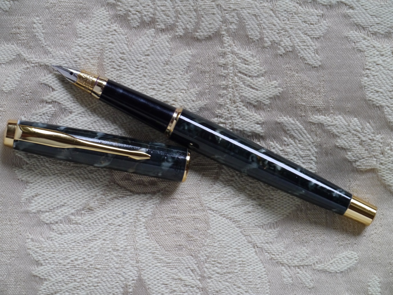 La laccatura marmorizzata è dipinta, la penna è in ottone.