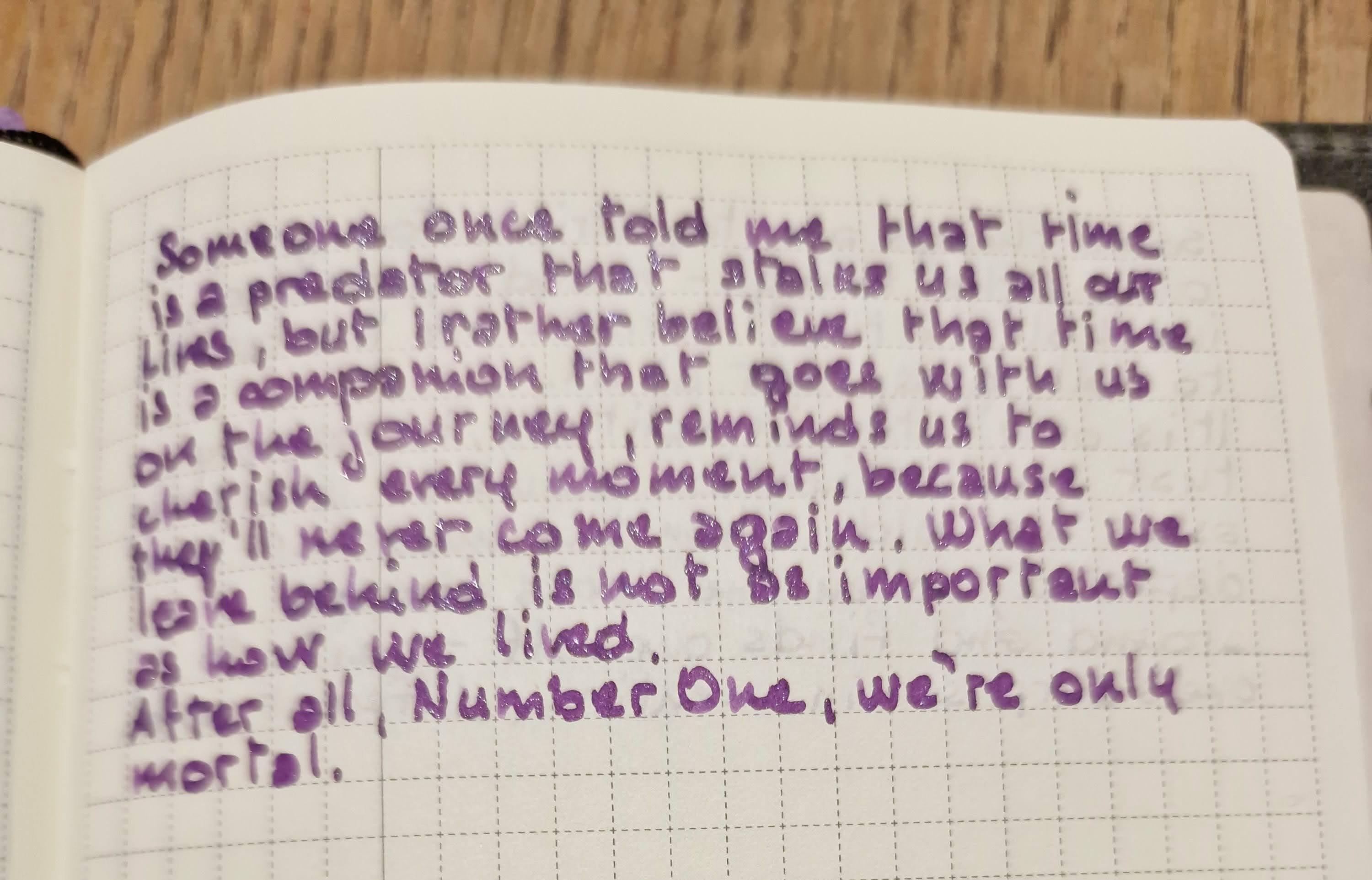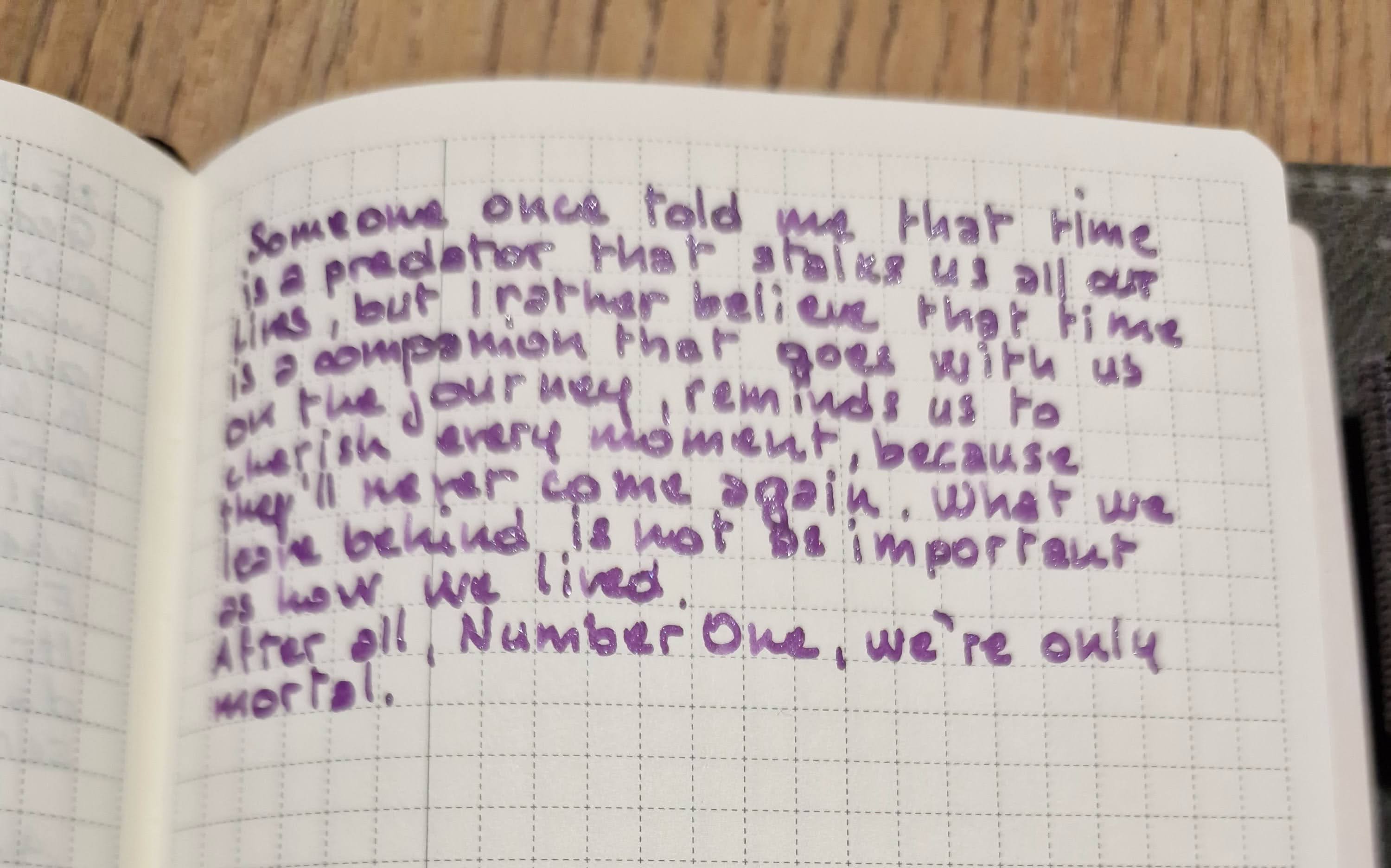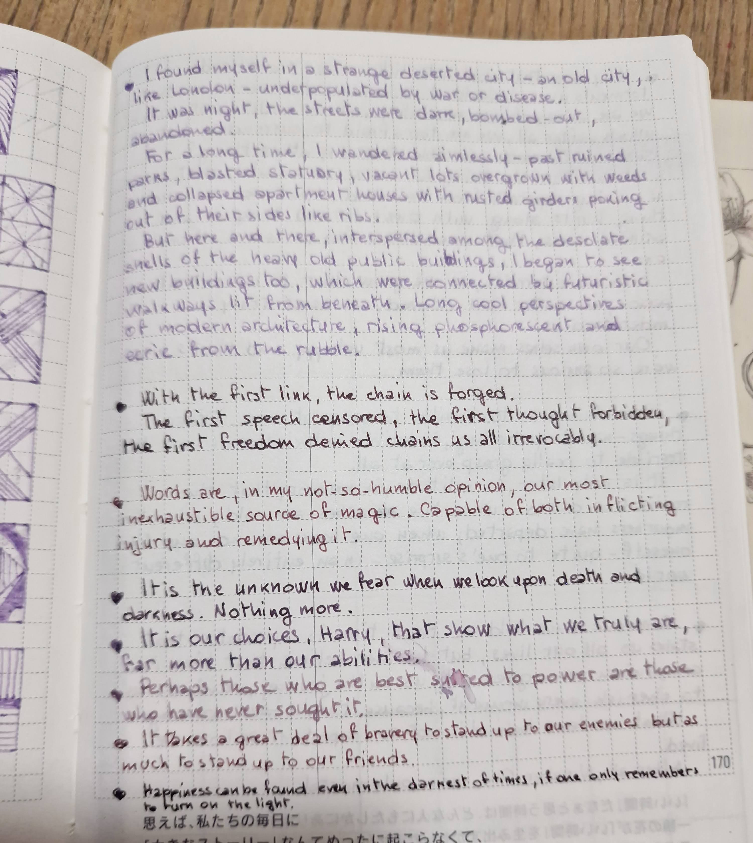 Terza foto: citazioni. Pennini usati extra fini, inchiostri chiari e scuri. Si intuisce che c'è scritto dietro ma non si miscuglia, resta tutto leggibile