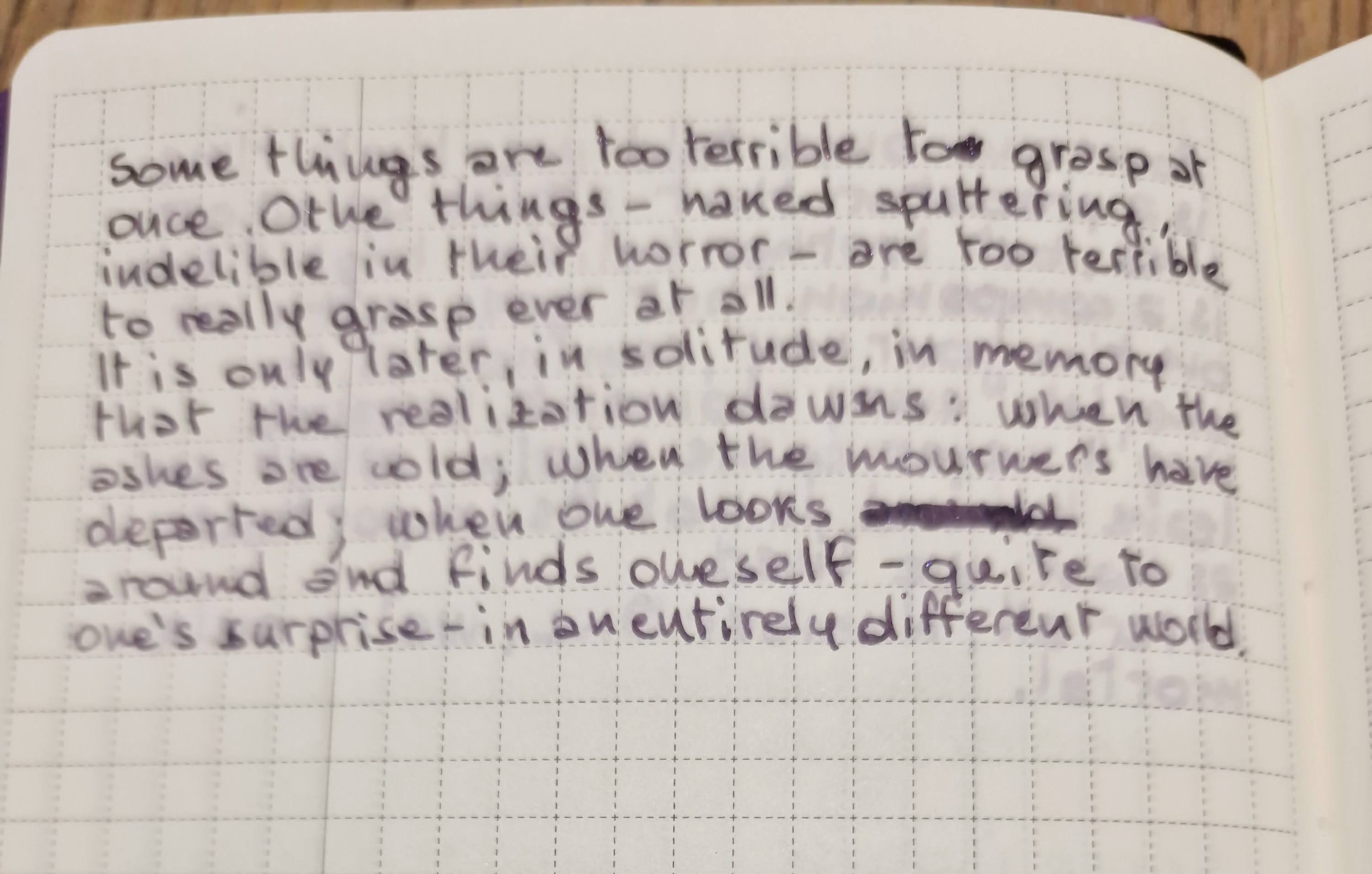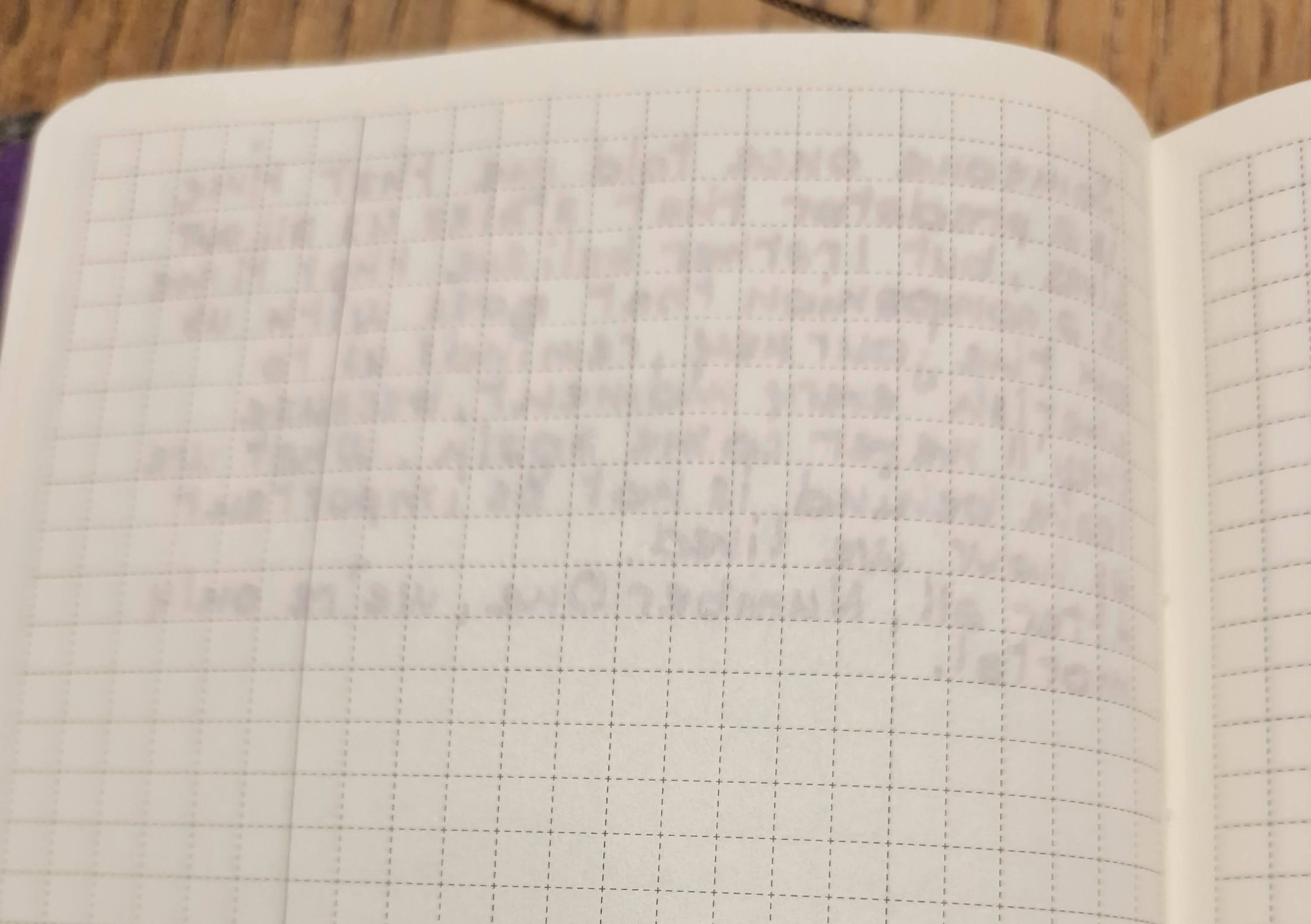 Terza foto: ho scritto con inchiostro scuro con un pennino needlepoint bagnato. Tutto è perfettamente leggibile. La scrittura copre con efficacia il ghosting e non si ha miscuglio alla vista