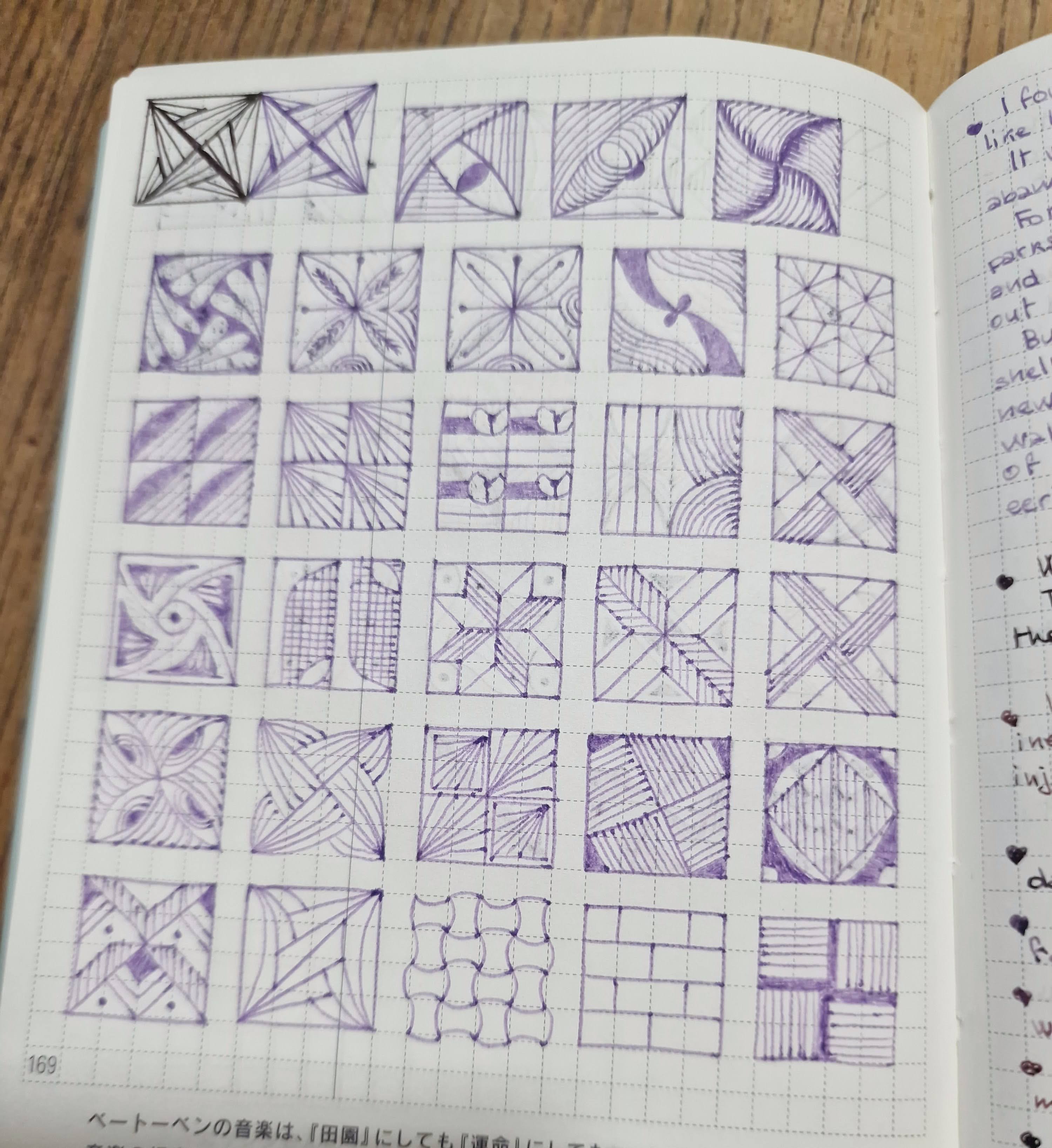 Prima foto: zentangles. Questi disegni sono fatti con pennini EF, inchiostri chiari ma passando più volte sui diversi punti di sovrapposizione. Lo stesso vale per la pagina successiva. Si intuisce qualche puntinatura di inizio bleeding ma passando 5 o 6 volte sullo stesso punto, parecchie carte soccomberebbero :D