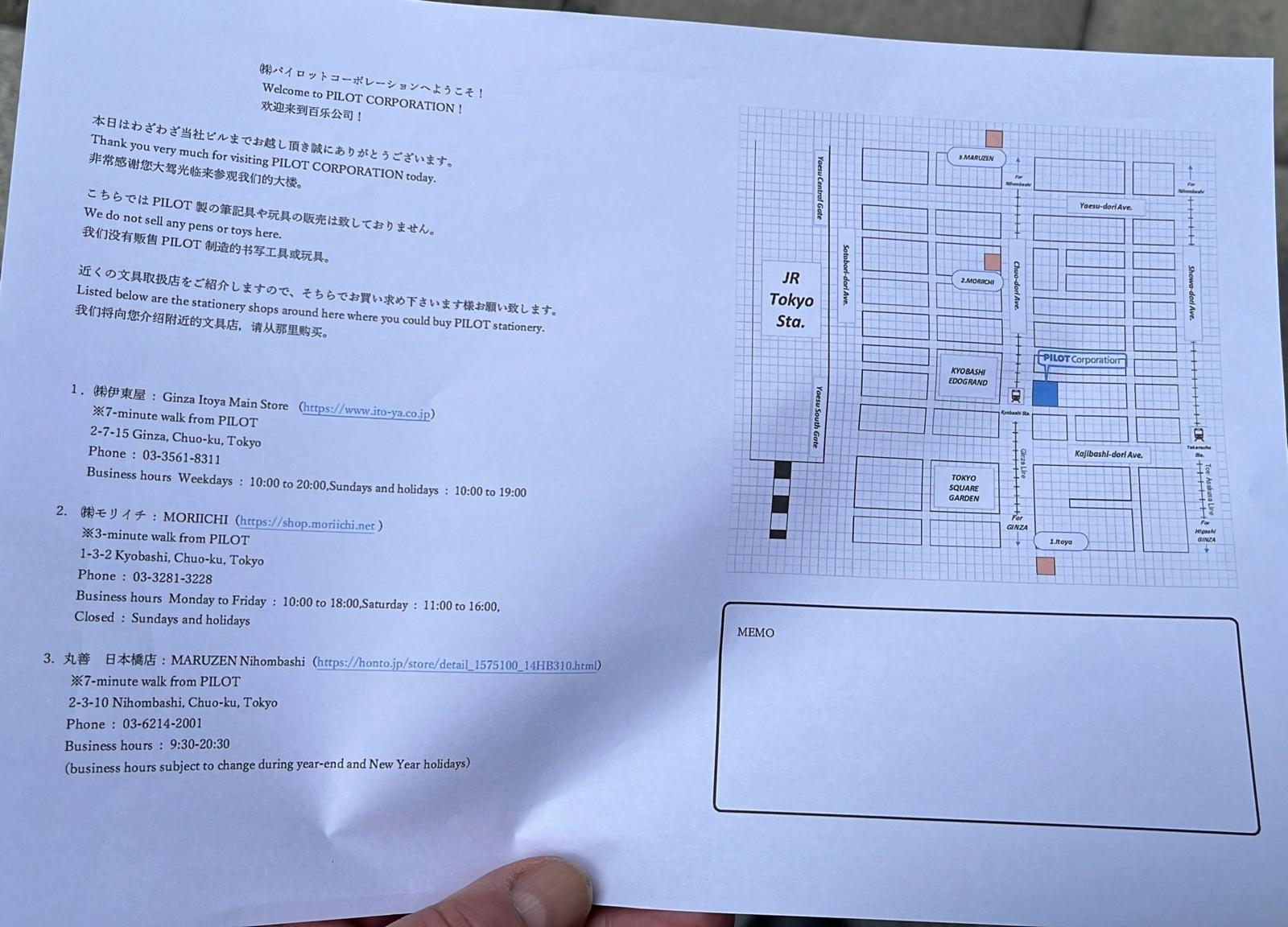 A Tokyo la cosa più semplice è seguire questa mappa che mi han dato all'headquarter di Pilot (non puoi salire, ma al piano terra c'è un piccolo museo) E' zona supercentrale vicino a Tokyo Station, ci si passa di sicuro.