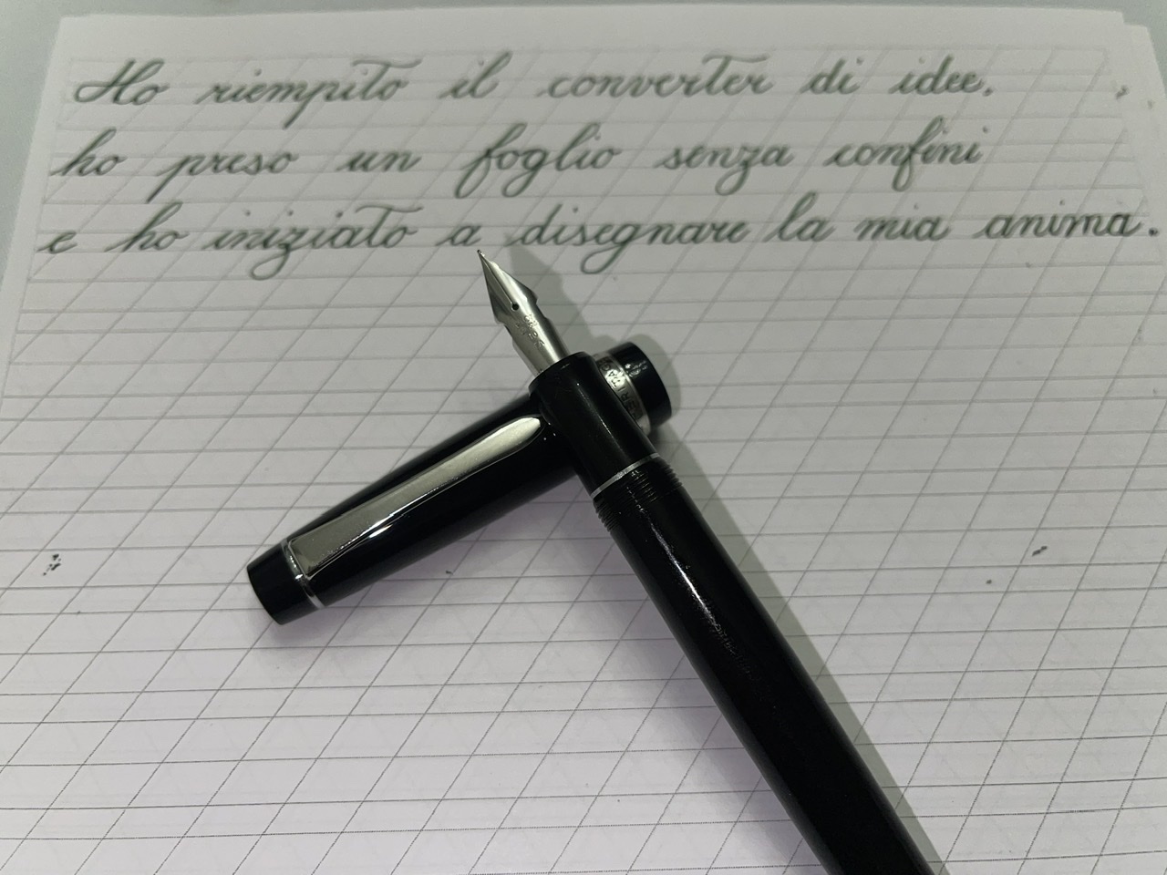 Prova fatta con inchiostro Diamine Black Green (che risulta decisamente troppo stitico per l’alimentatore originale). In arrivo dall’America alimentatore maggiorato