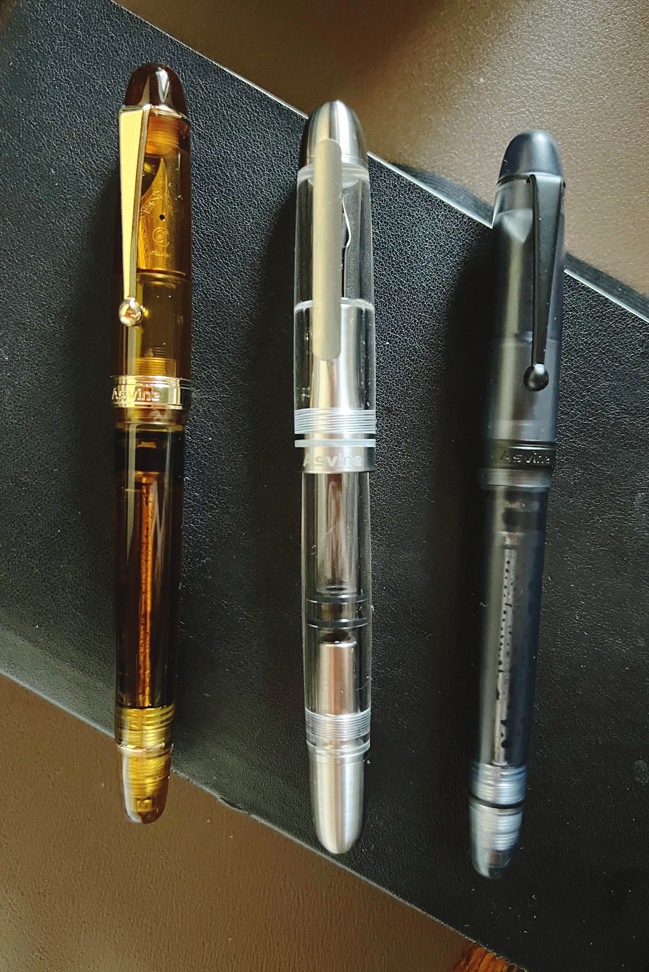 Mi son trovato talmente bene con la V126 di Asvine (quella frosted con dettagli neri sulla destra), che ne ho ordinata un'altra, quella demonstrator color ambra sulla sinistra. Al centro invece una P36, per la quale sto attendendo un inchiostro (robert Oster Fire & Ice) !