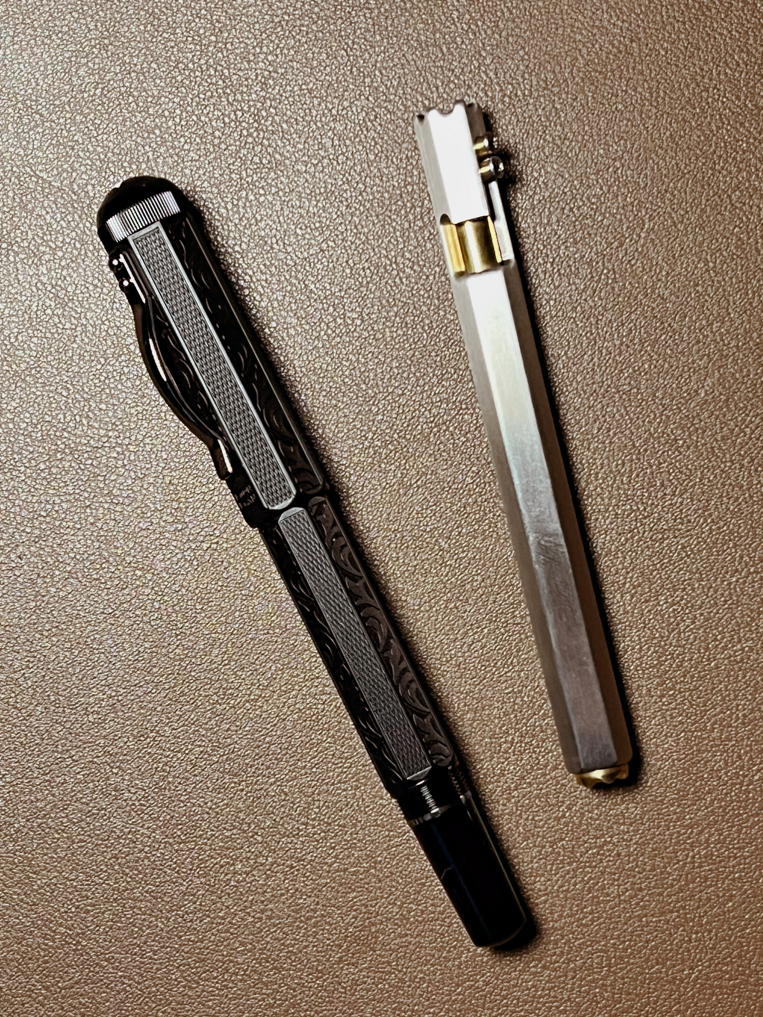 La "nera" è una stilografica, from Ali, Majohn P138, a pistone, con pennino XF. L'altro oggetto è una penna biro, marca Smootherpro (ricariche Parker), da Amazon, tutte in ottone e acciaio, con la particolarità del meccanismo "bolt action" (tipo la leva per scaricare il proiettile dal fucile). Son due bei mattoncini, 45g la stilo, 48 la penna.