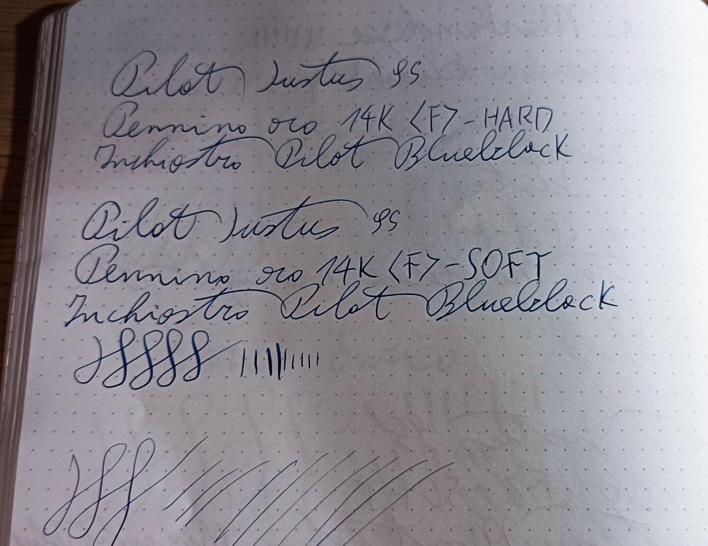 Per quanto riguarda la Justus, la mia è con pennino F; non ho mai avuto una 78G M, ho avuto una Lightive con pennino F, rispetto al pennino in acciaio Pilot questo è leggermente più fine. Poi dipende anche dove si posiziona la ghiera, se si mette su S il tratto a parità di pressione è leggermente più spesso perché c'è più flusso di inchiostro. Ecco una prova di scrittura