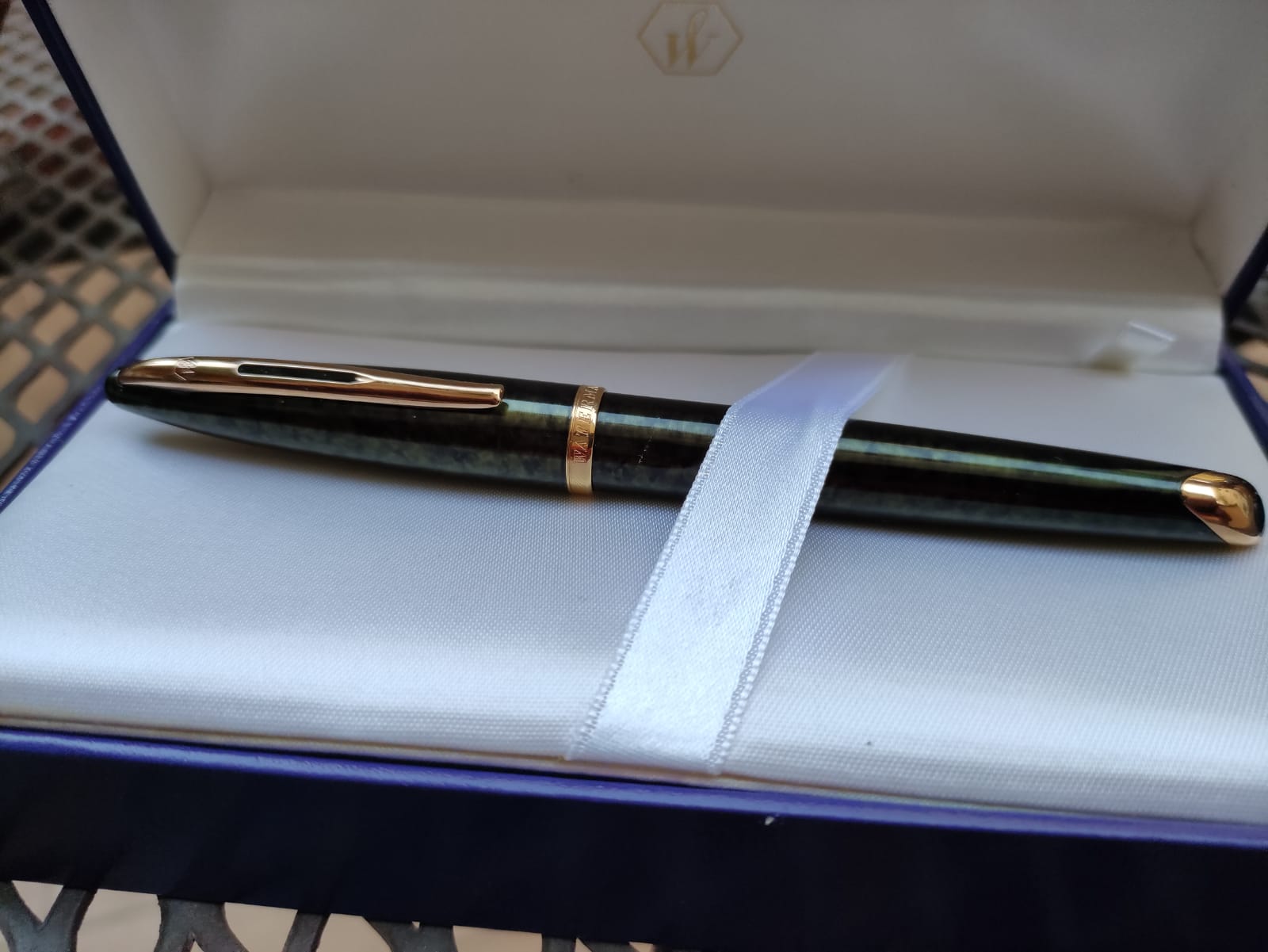 Ecco il mio ultimo arrivo: Una Waterman Carene dalla (per me) inusuale livrea verde screziata. La penna non ha bisogno di presentazioni, essendo stranota agli appassionati.