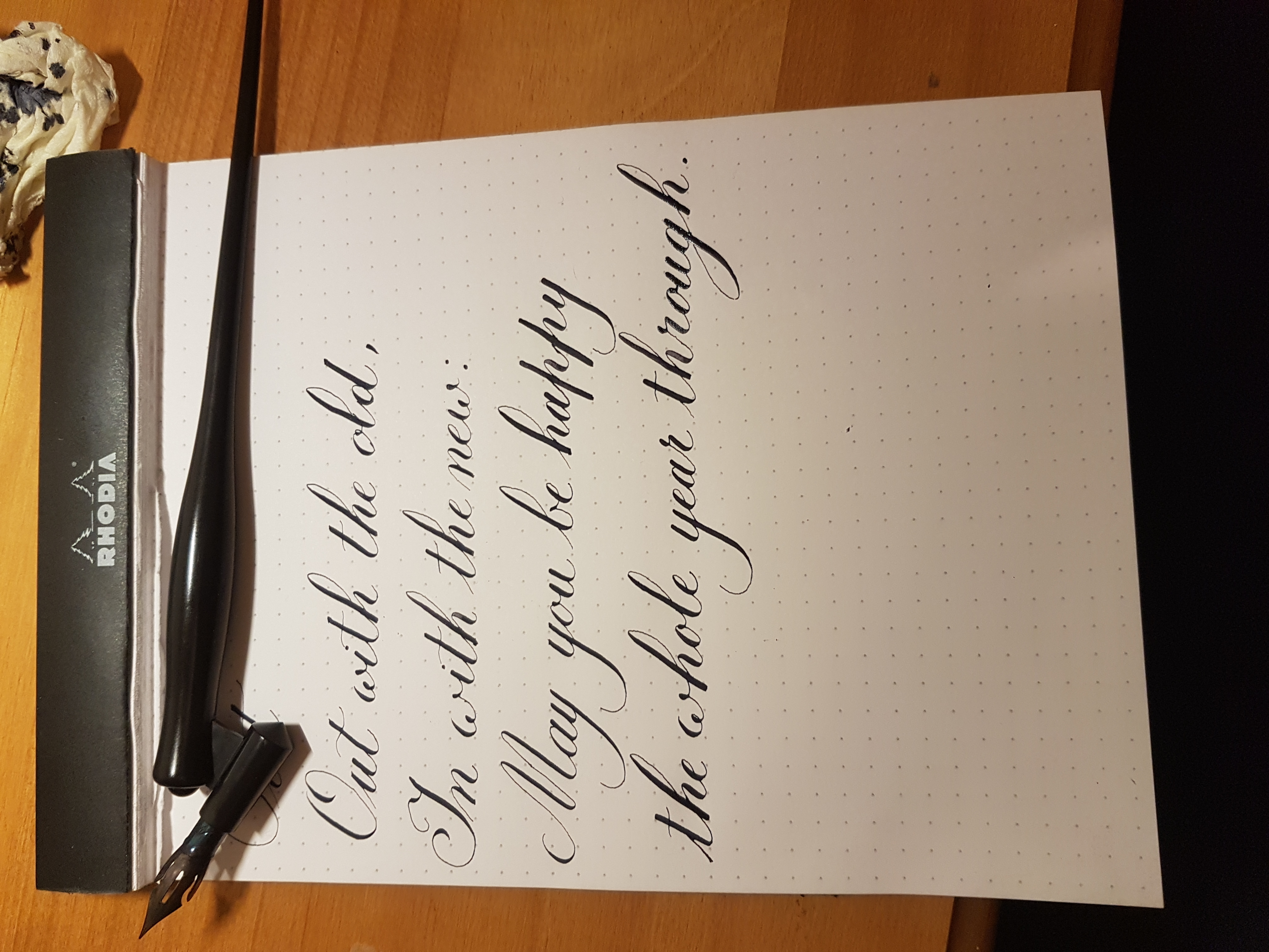 Ho pulito il pennino con l'alcool come suggerito e sto usando quel ferrogallico. La sensazione è molto più che positiva anche se sto tracciando a caso perché ho solo una piccola idea di quali siano i tratti base del copperplate, scrive tutto perfettamente, tratto preciso, il pennino mi segue e l'inchiostro tiene il passo.