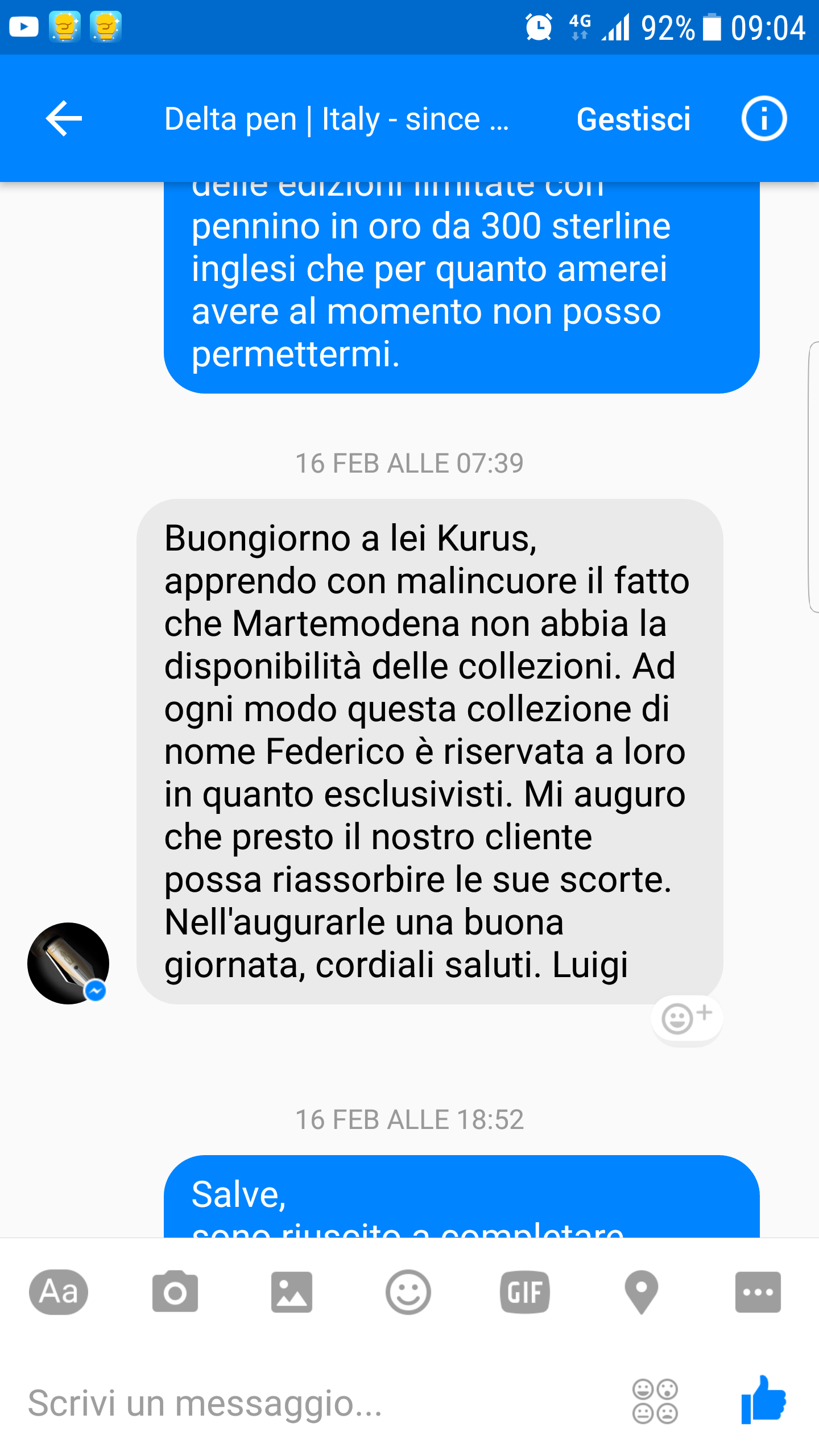 Mah, la Delta credo commercializzi anche Markiaro come accessori di pelletteria.Phormula ha scritto: Per rilevare un marchio devi metterci dei soldi, e chi è disposto a farlo deve come minimo avere una ragionevole certezza che rientrerà dell'investimento fatto, cosa su cui ho molti dubbi. Il mercato delle penne di pregio è limitato, i tempi in cui a lauree, cresime e comunioni si vendevano vagonate di penne ed in cui la penna di pregio era il regalo aziendale per eccellenza sono finiti da tempo. Tanto più che Delta solo quello fa, altri marchi hanno diversificato da tempo, vedi Montblanc, entri in un loro negozio e le penne occupano il 10% dello spazio, il resto sono accessori e pelletteria di pregio.