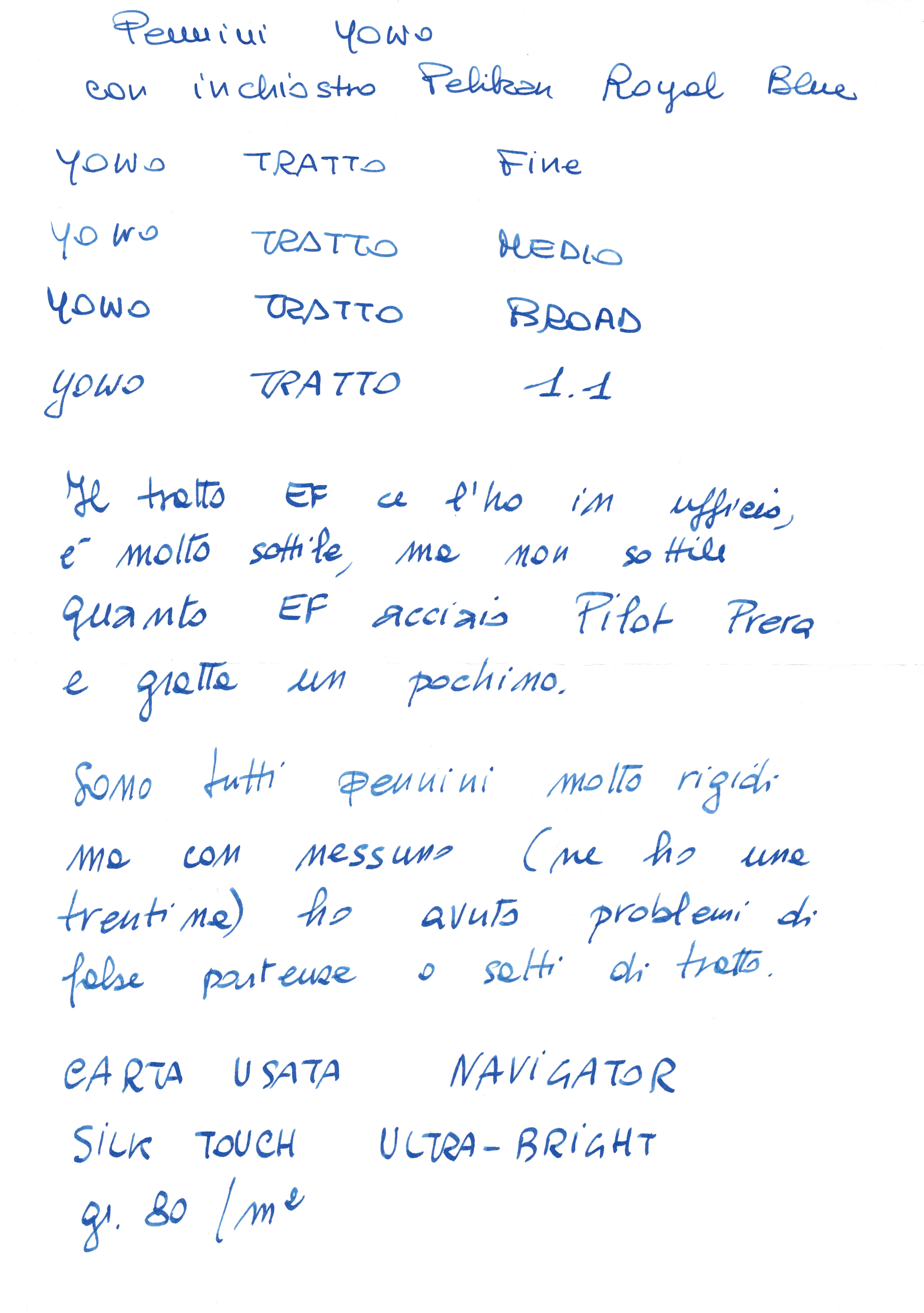 Farei una piccola richiesta a chi ne se occupa, potreste allegare assieme alle colorazioni anche una prova di scrittura con i pennini delle varie dimensioni? Giusto per capire piu' o meno che aspettarsi come tratto, magari con uno tra Waterman blue, un Aurora nero, Un Herbin Perle noir o altri colori abbastanza comuni giusto per fare una comparativa ?