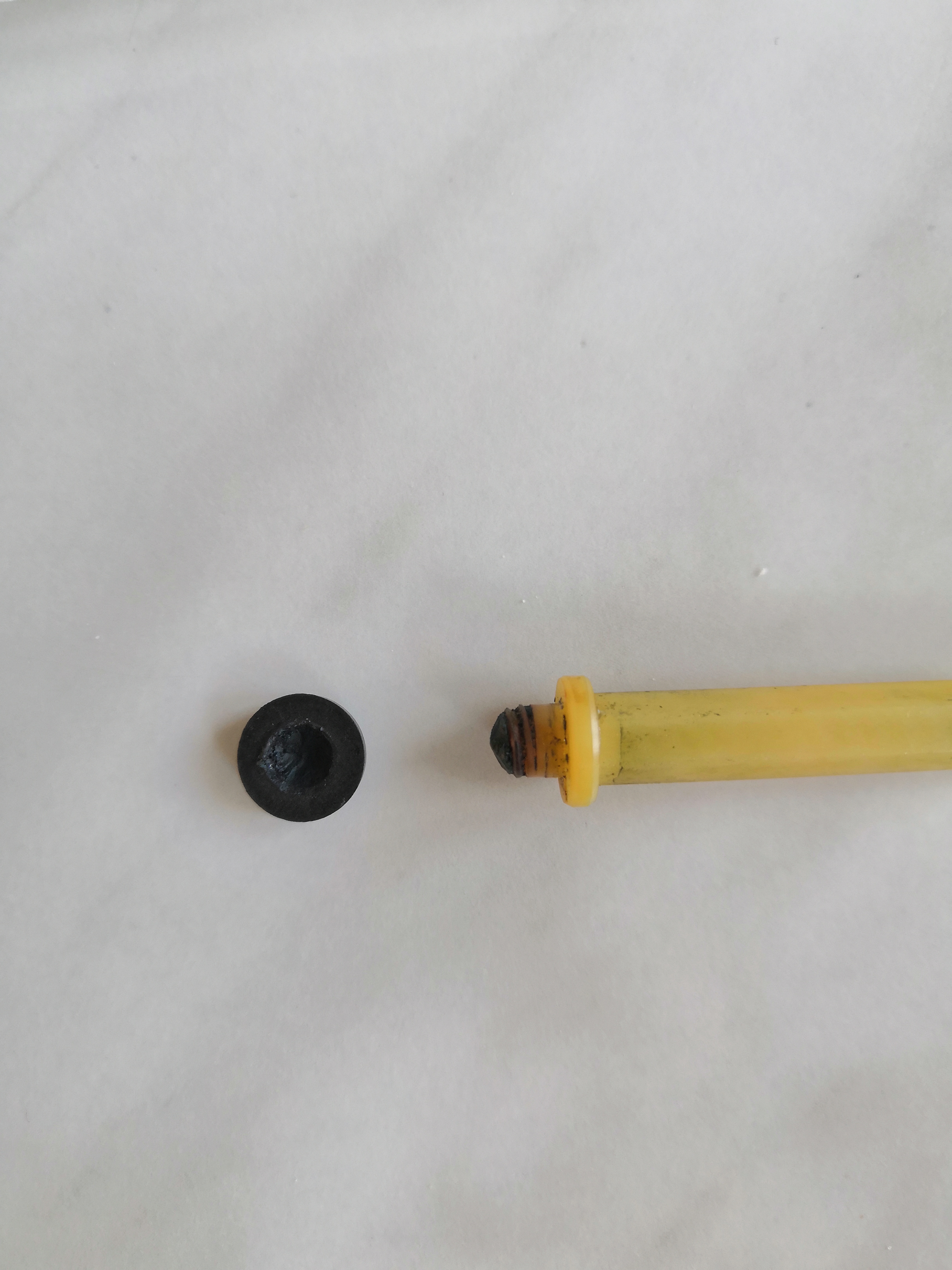 Aggiornamenti: sono riuscito a svitare molto delicatamente la sezione, il problema del caricamento è dovuto al pistone che non aggancia, credo sia rotto un pezzo, come da foto. Spingendo poi l'alimentatore dal retro, ho notato che alcune alette erano staccate, e sono fuoriuscite come fossero pezzi di inchiostro secco. Qualche consiglio su come procedere? Intanto le guarnizioni sono a bagno, e ho ripulito la finestrella, che da nera è ora solo ambrata. Ho usato lo scovolino di un vecchio rimmel, opportunamente pulito. Credo sia rimasto un pezzetto di pistone nella rondella di serraggio guarnizioni. Come lo tolgo? Grazie per la pazienza