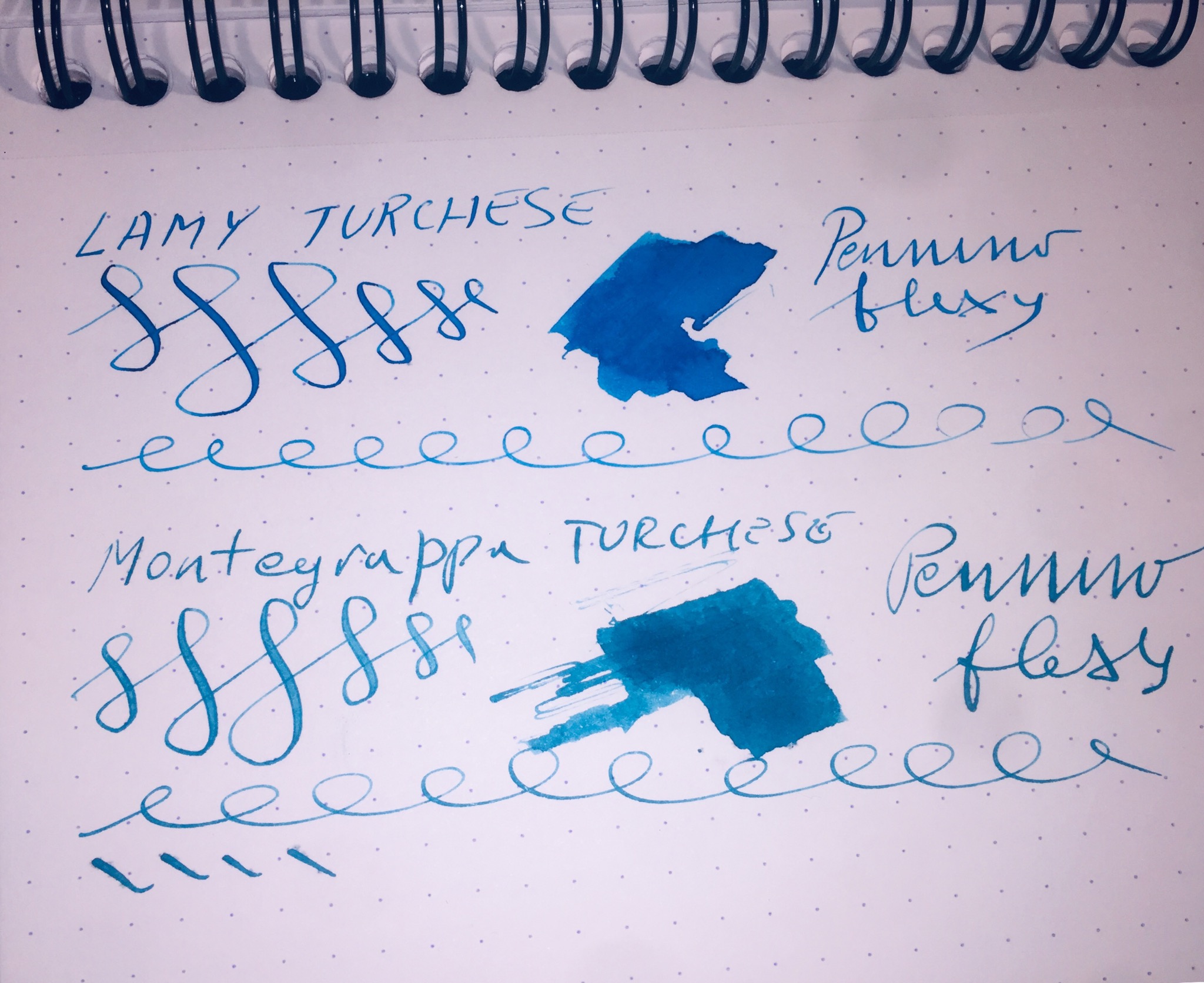 Trovo il Turchese di Montegrappa molto interessante. Altro turchese da suggerire è il Lamy turquoise, provato su una Lamy Al star; bello, ma la soddisfazione maggiore è stata provarlo su un'Ahab. Crea delle bellissime sfumature soprattutto in flessione.