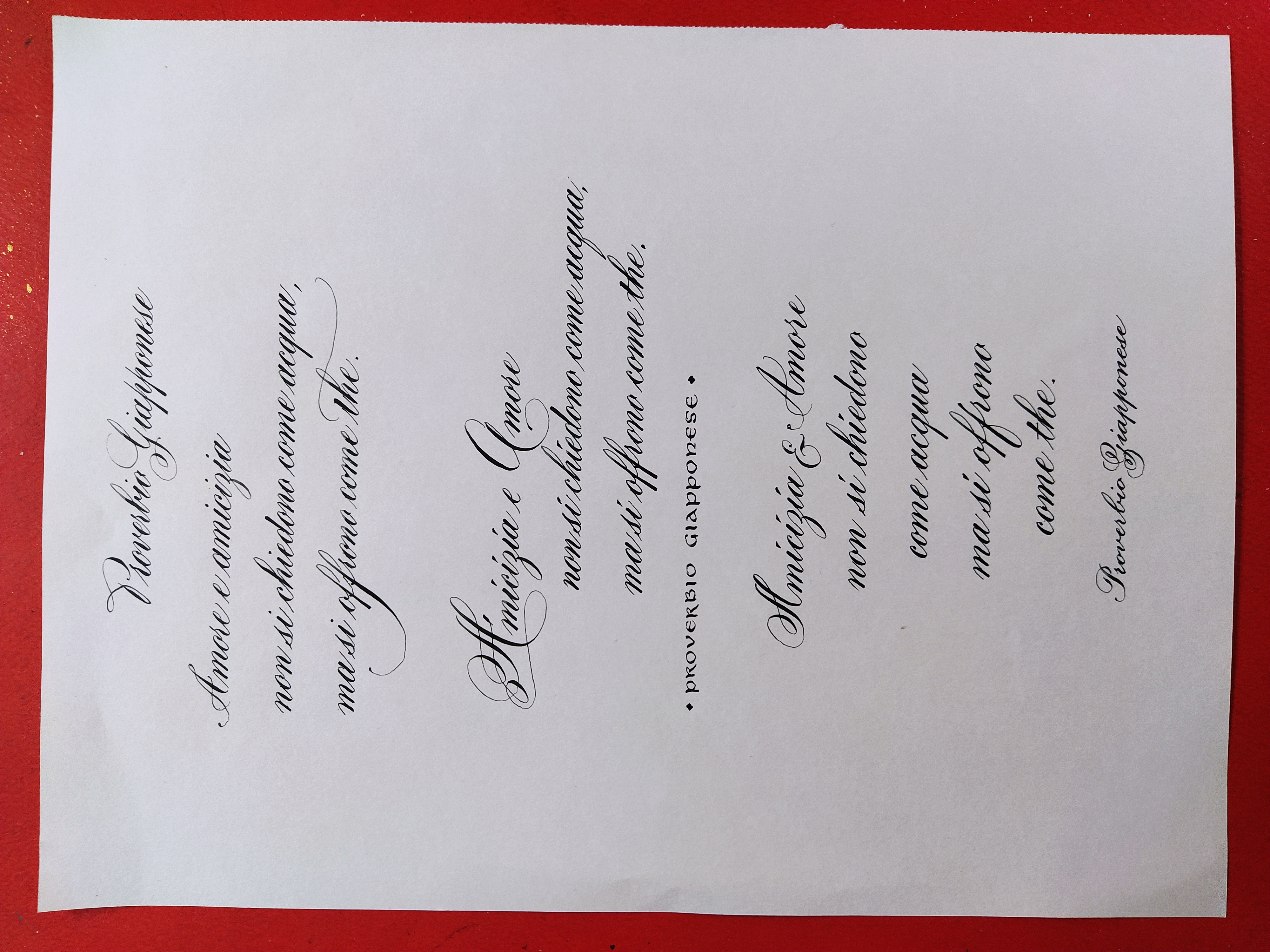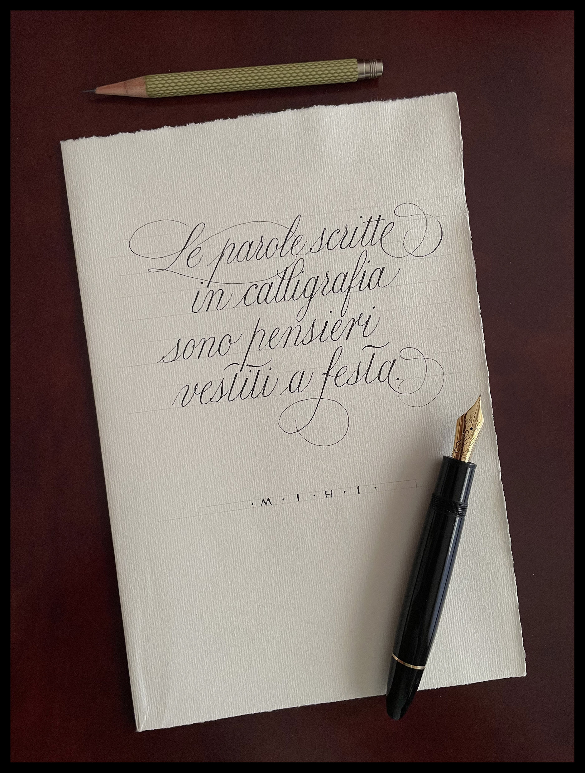 Ringrazio entrambi per le belle parole in cui mi rivedo moltissimo: nonostante siano passati ormai due anni dalla decisione di intraprendere l'apprendimento del corsivo inglese, mantengo l'entusiasmo per l'attività calligrafica. Questo entusiasmo è la parte che mi fa tendere alla vanità, al gioco e spesso scivolare un po' troppo fuori dagli schemi, probabilmente lasciandomi ispirare un po' troppo dai video visti sui social da maestri e professionisti che se lo possono permettere. Sono come un liceale che si avvicina alla poesia, legge Dante e raffazzona una serie di parole con registro aulico, senza curare la metrica con il pretesto del contenuto, ma mi diverto un casino