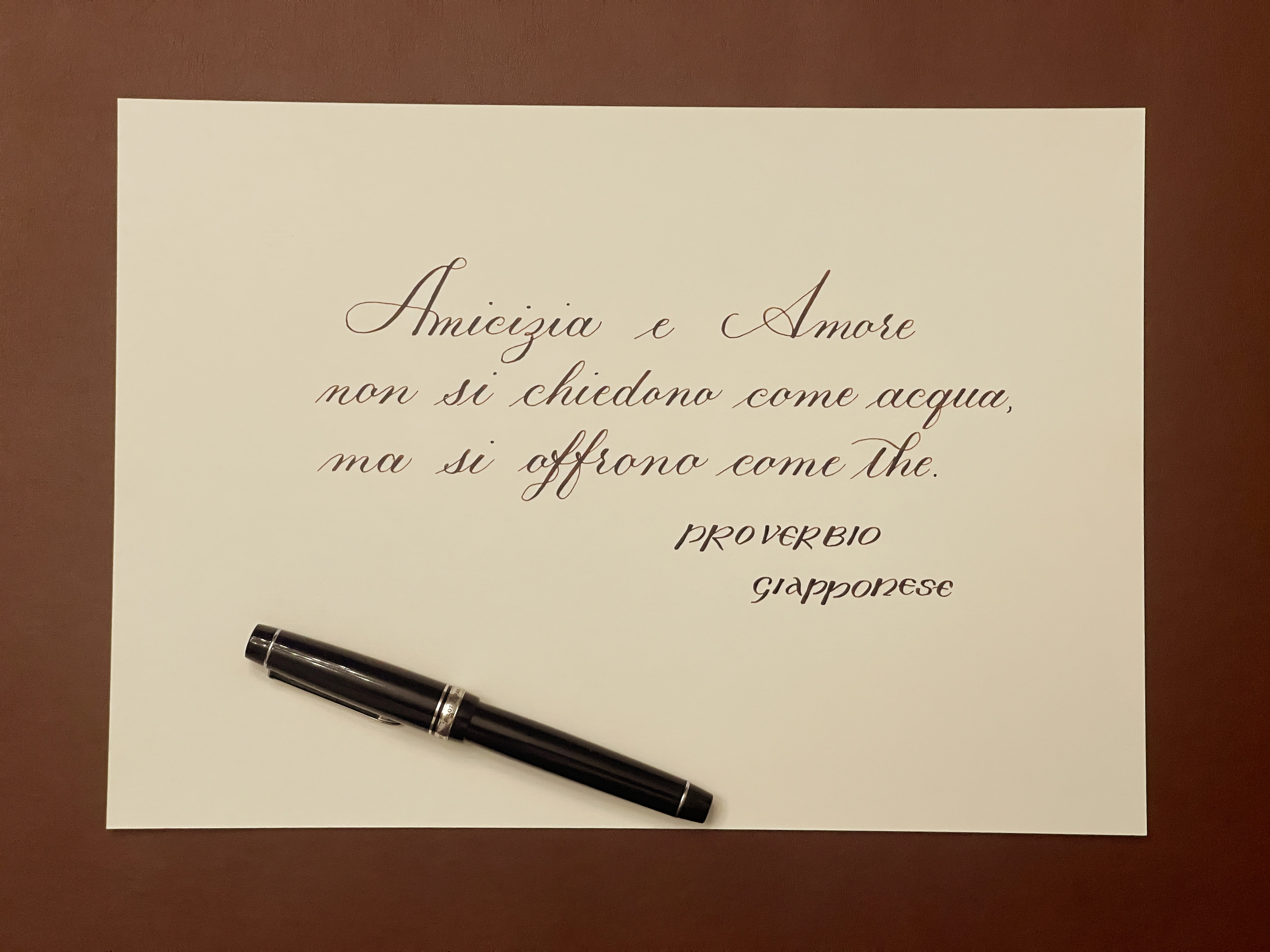 Secondo punto. Apprezzo moltissimo, a titolo personale, il tuo “approccio” ala calligrafia, perché é vivo e non pedissequo e perché - questa é la mia impressione - non sacrifica il divertimento sull’altare della perfezione. Le tue opere sono allegre e vivaci, personali, spesso un po’ fuori dalle regole, simpaticamente vanitose, e appassionate. Mi riconosco in questo approccio, che mi deriva dal gusto di usare le penne stilografiche e di metterle a fare qualche cosa di utile per me e per il mio piccolo mondo domestico: un po’ meno dalla disciplina di ripetere e ripetere gli esercizi…. Leggendo e vedendo le tue pagine nel forum, trovo che nel tuo fare e nel modo di condividerlo ci siano tutti gli ingredienti perché la calligrafia si trasformi, nelle tue mani, in una passione non transitoria, ma duratura e piena di soddisfazioni.