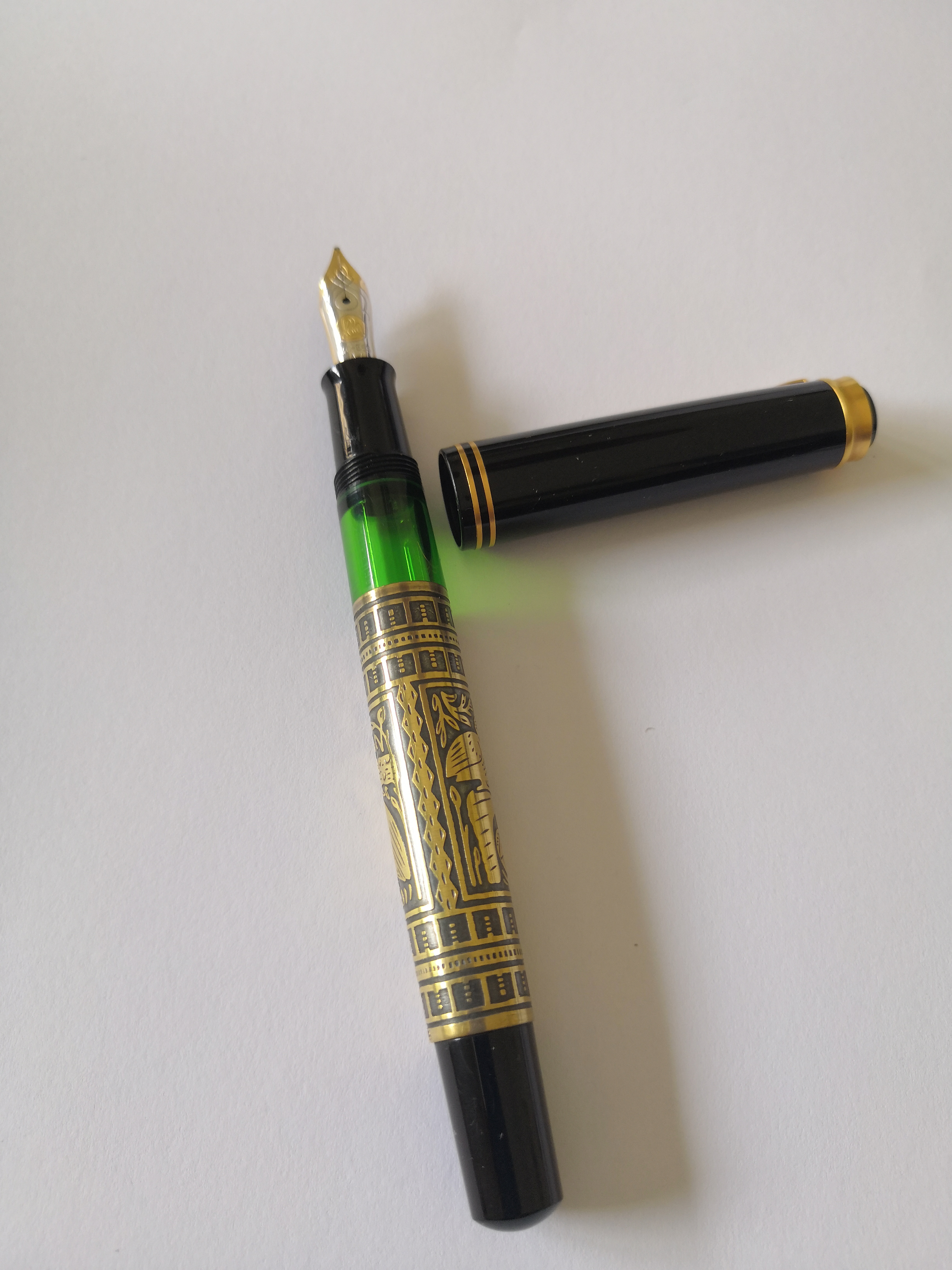È una penna che carica talmente tanto inchiostro che vien voglia di maledirla (perché rallenta in modo atroce la turnazione delle altre penne), ha un pennino 14kt di generose dimensioni, quindi bello da vedere (ma anche da usare) e...ecc. ecc. ecc.