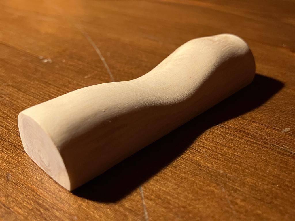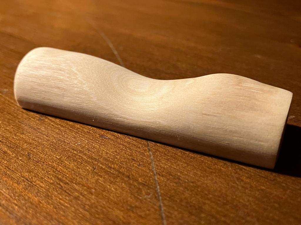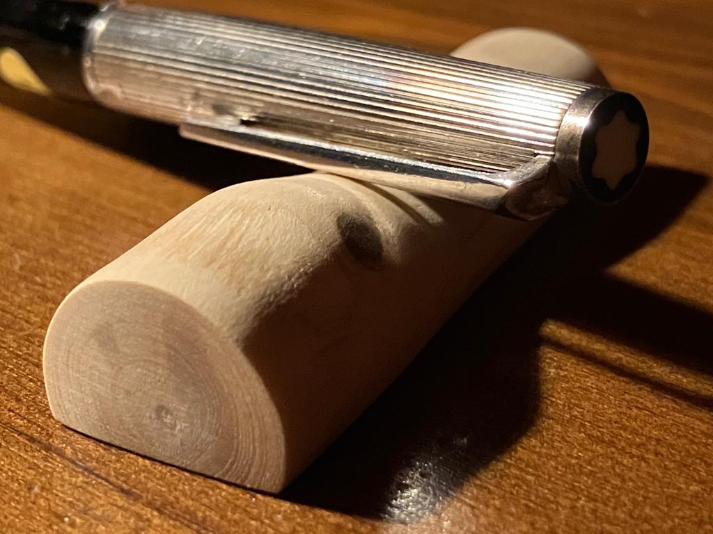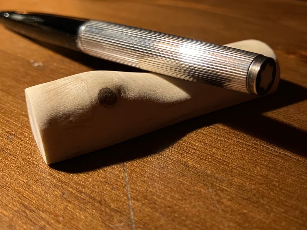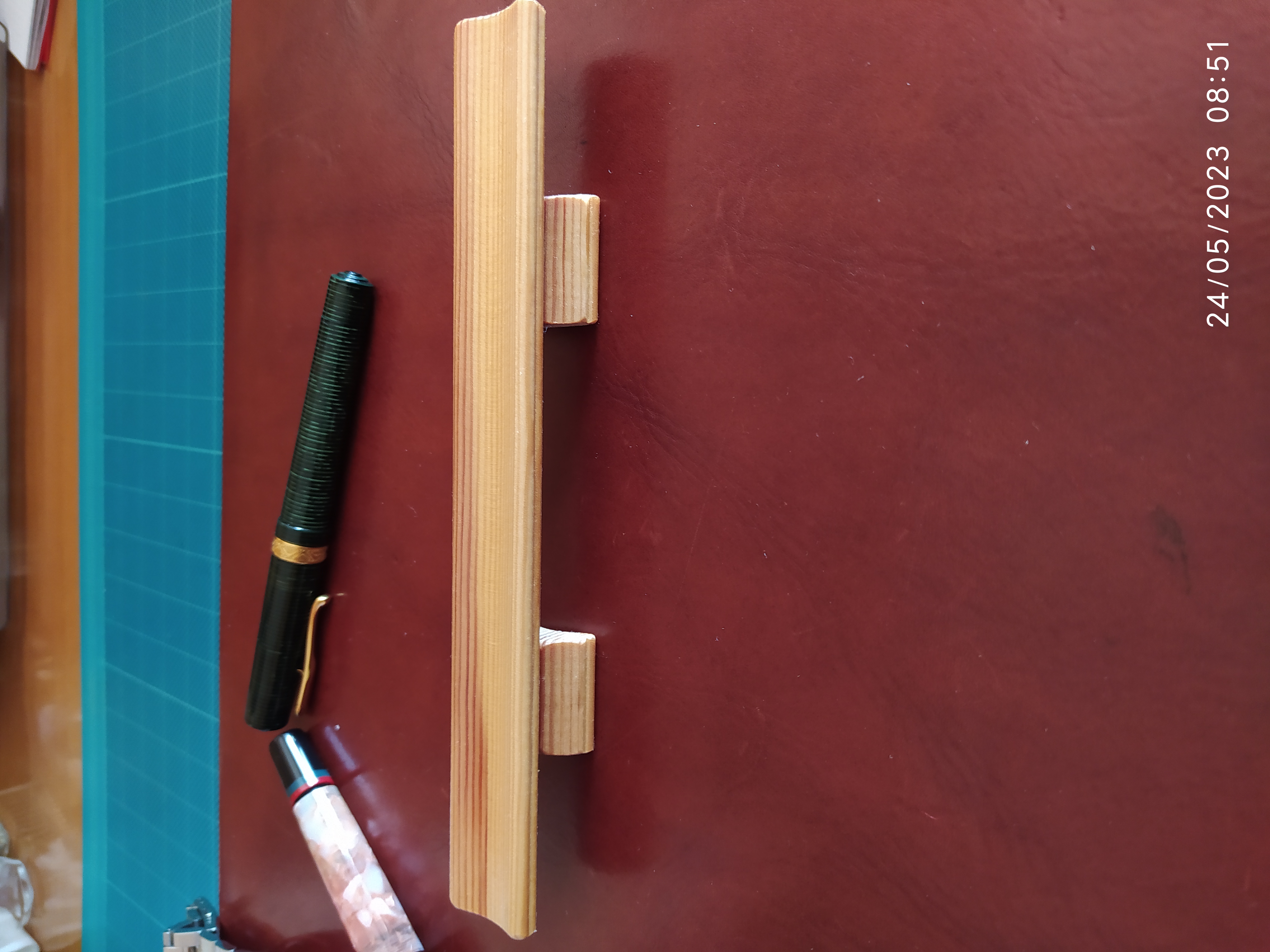 ecco nuovamente il poggia penne, versione frassino, ulteriormente affinato da notare che la sezione si è ridotta (limato sotto), quindi il profilo adesso è più basso, e la penna tende a scivolare molto meno di prima