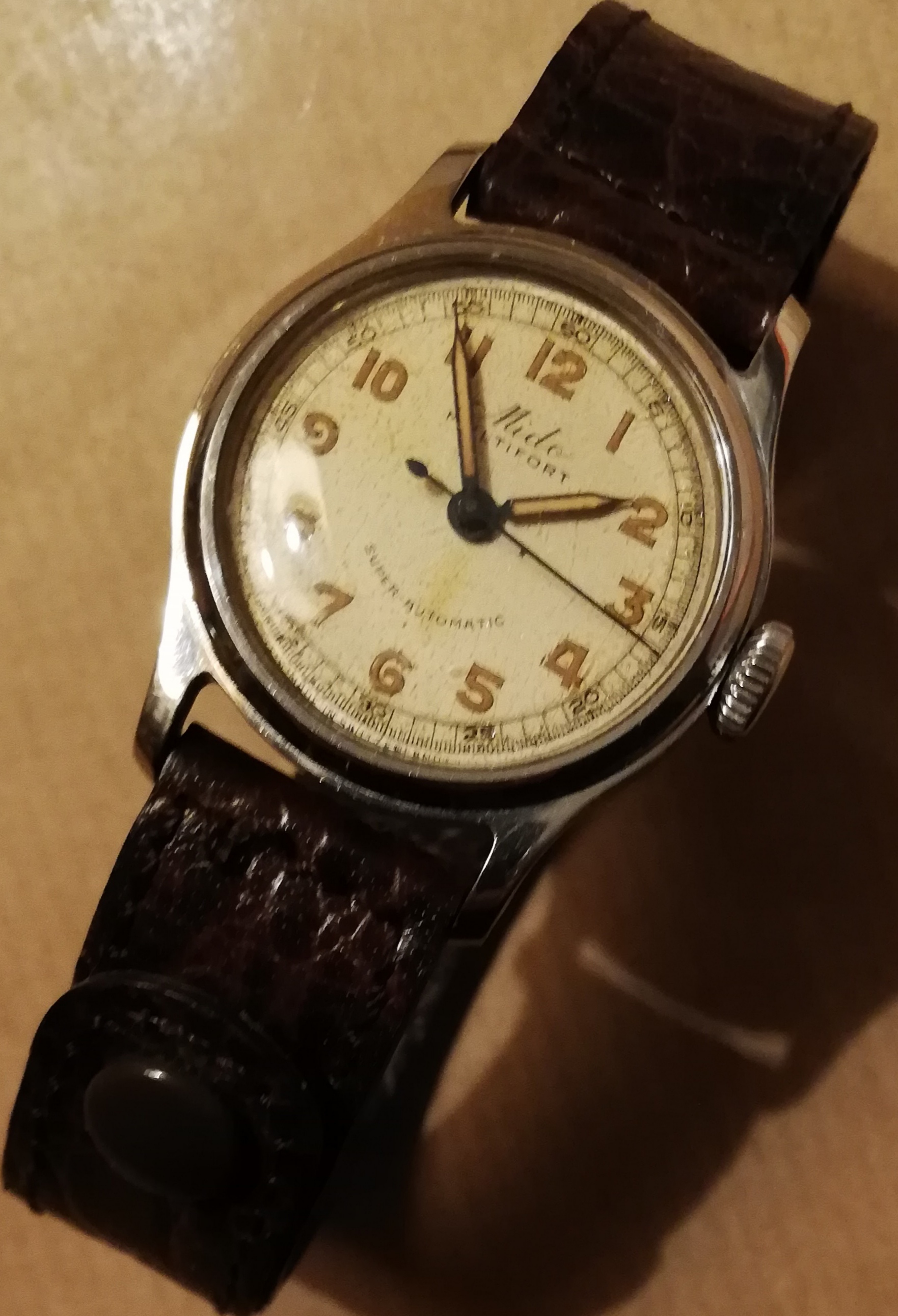 Oggi userò questo Mido automatico a martelletto della seconda metà degli anni '40, nato come orologio sportivo con discrete caratteristiche di robustezza ed impermeabilità, misura 28 mm. di diametro.