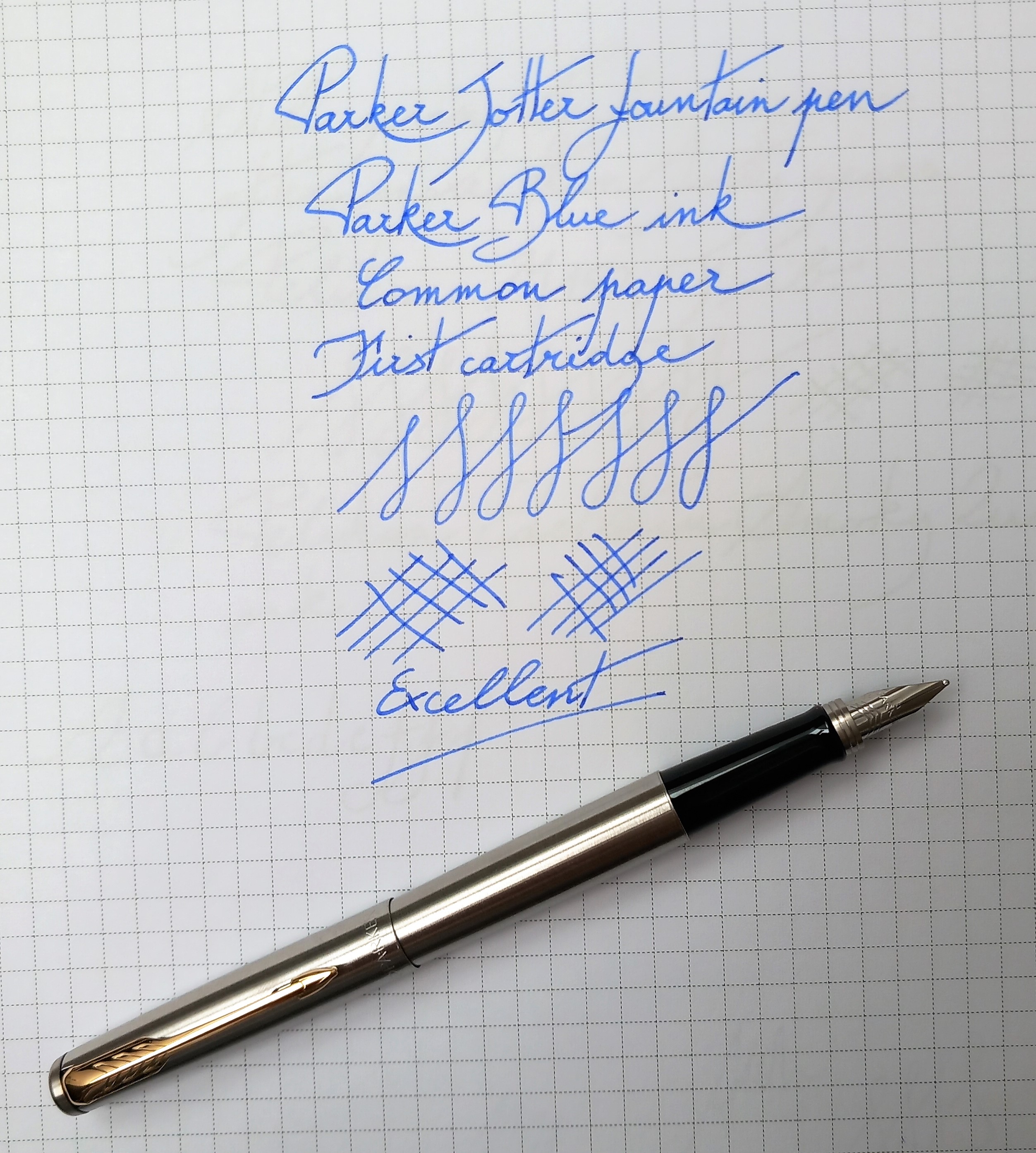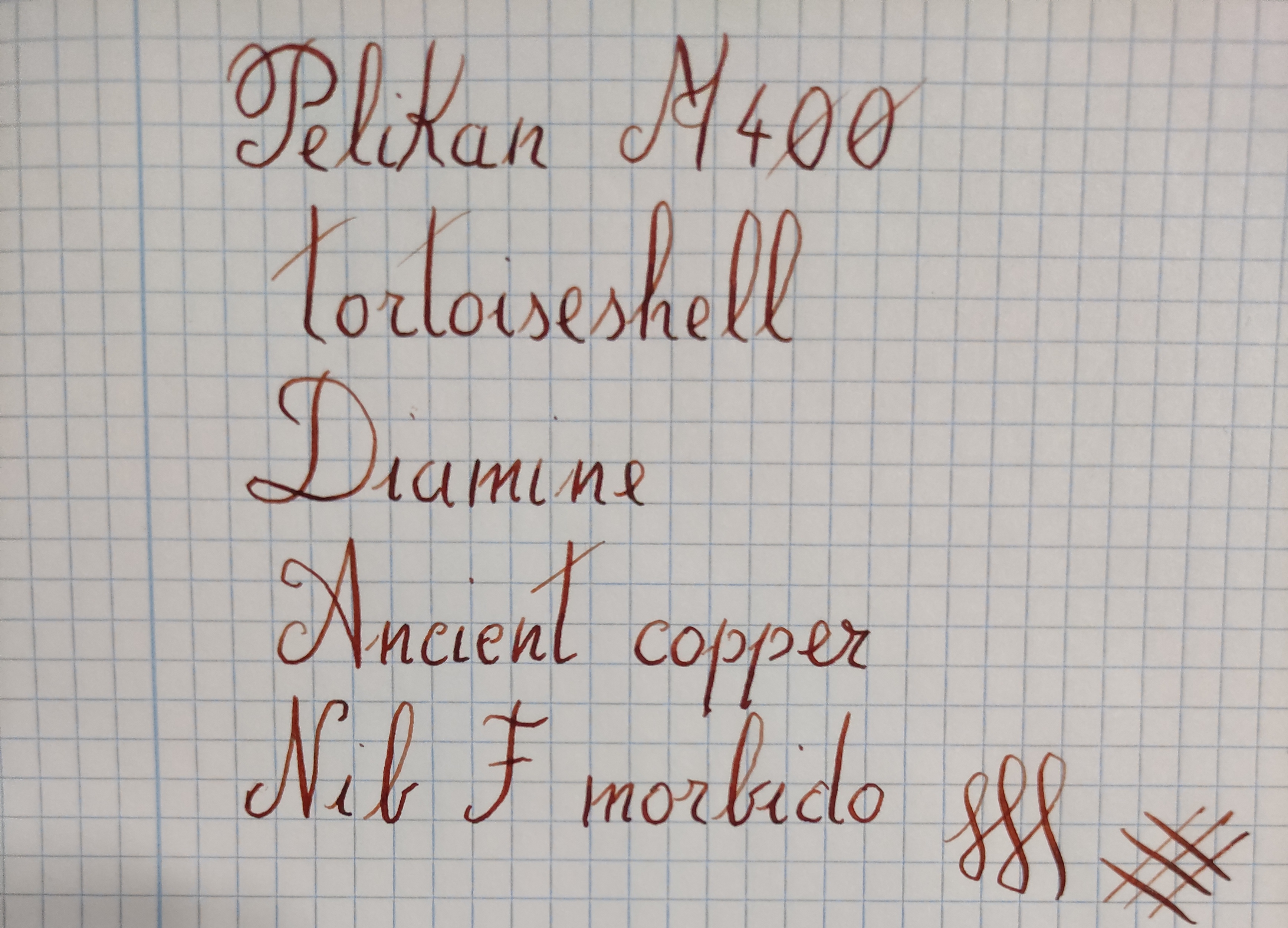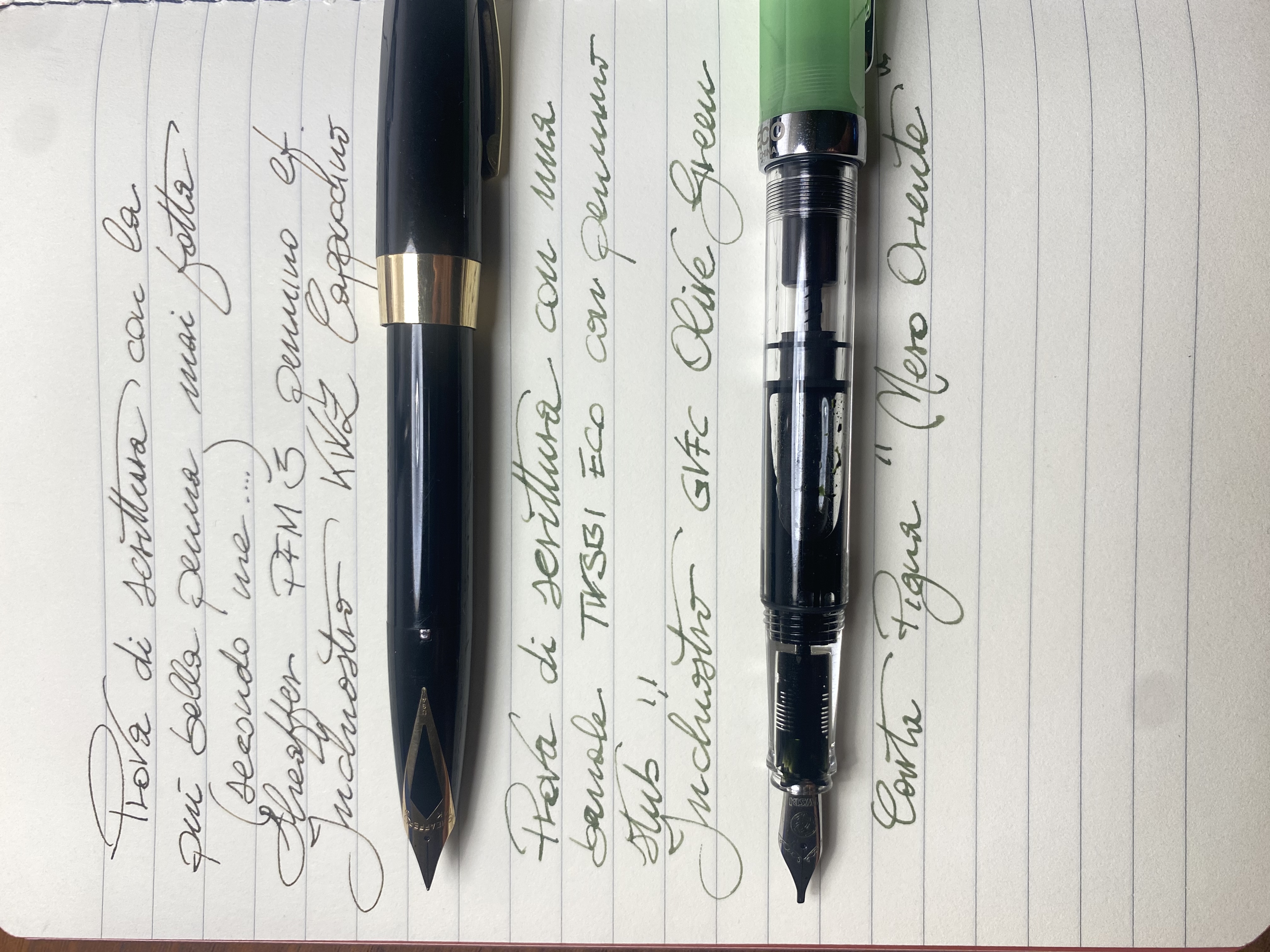 Pennino rigido, con feedback "evidente " da penna vintage, ma non fastidioso, flusso abbondante ma larghezza del tratto in linea con quanto stampigliato sul pennino (è un F e scrive da F).