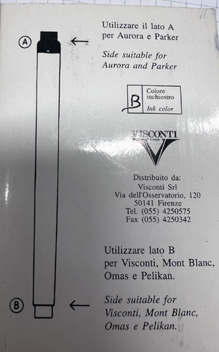 Annie306 ha scritto: domenica 18 agosto 2024, 12:38 Ho appena acquistato una scatola di cartucce prodotte da Visconti non so quando, sul retro è scritto lato a : Aurora e Parker, lato b: Visconti, Mont blanc Omas e Pelikan.