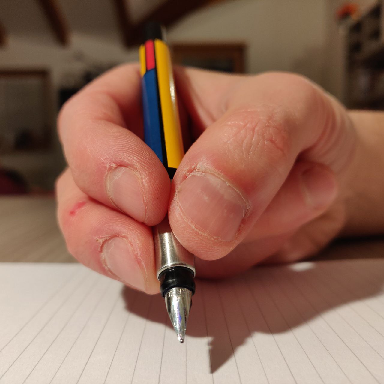 Mi sono messa a controllare anche io come impugno la penna. Tripode dinamica, pare, con una strana tendenza a tenere il mignolo un po’ in avanti, come stabilizzatore per avere maggiore controllo. Ricordo bene che un millennio fa non lo tenevo così, quel dito, poi un giorno per istinto l’ho spostato in fuori anziché tenerlo chiuso verdo il palmo e.. non riesco più a riportarcelo. È un po’ meno comodo tenerlo rigido ma controllo bene la scrittura. Non so se sono solo io oppure è comune