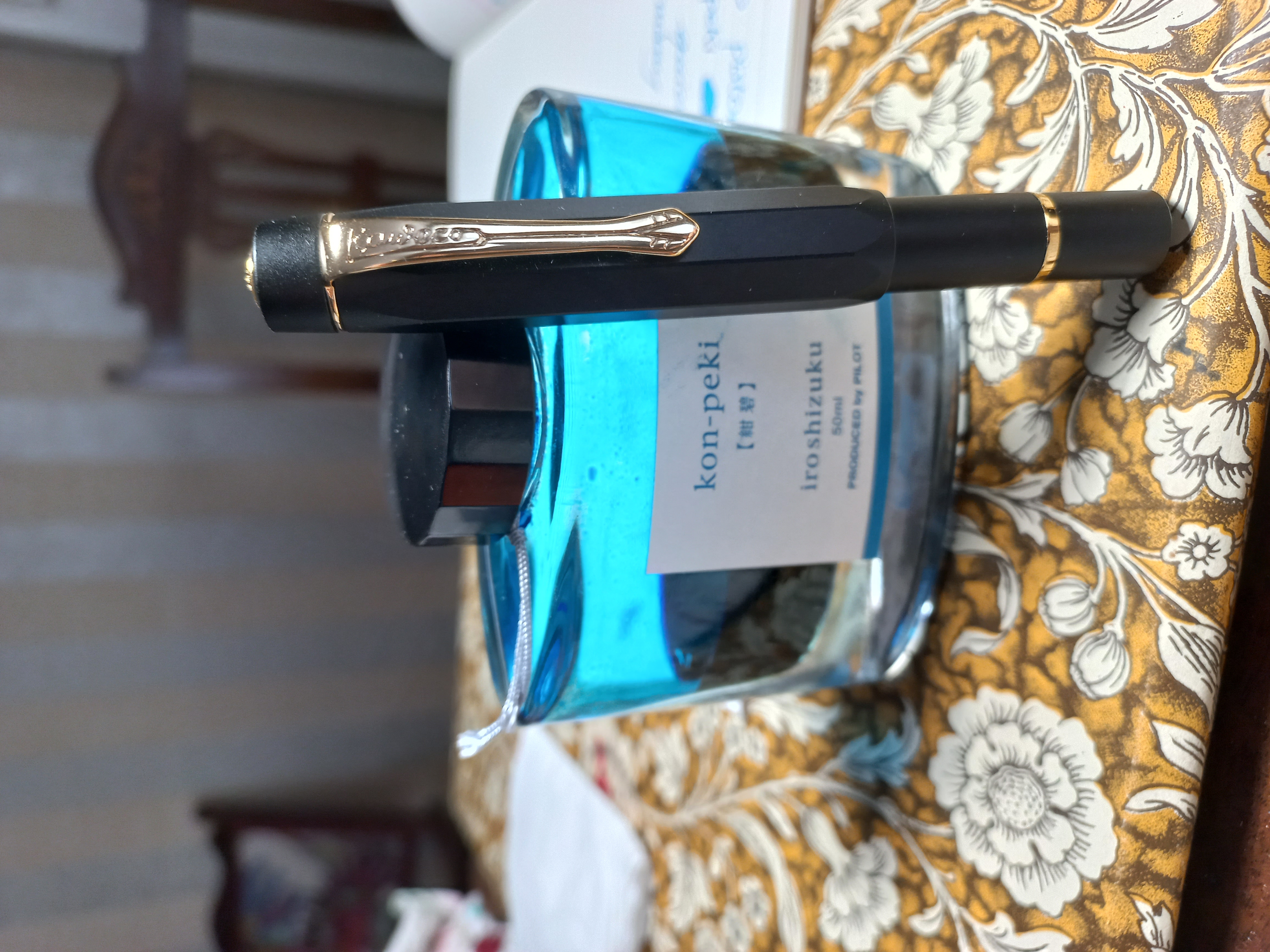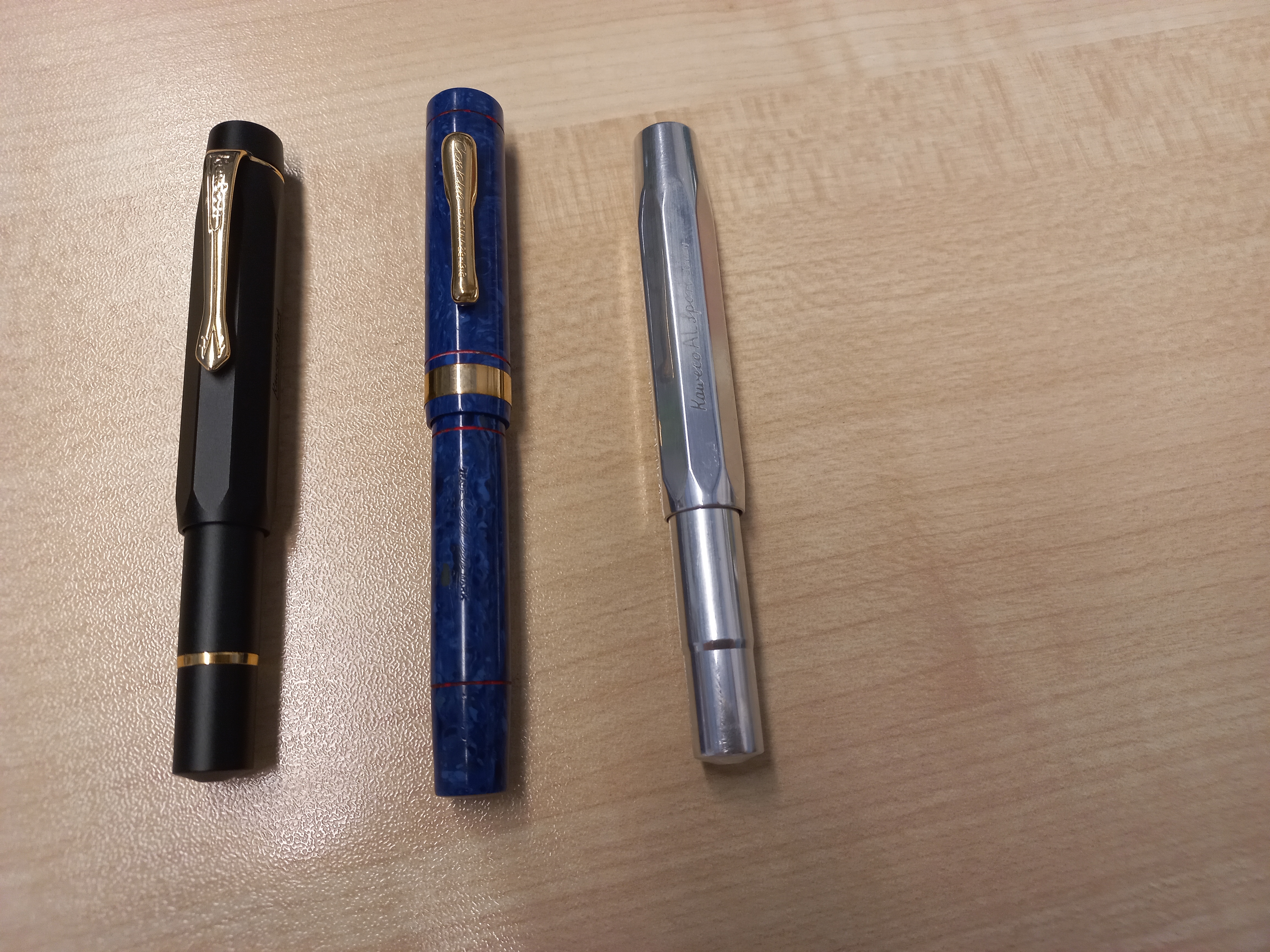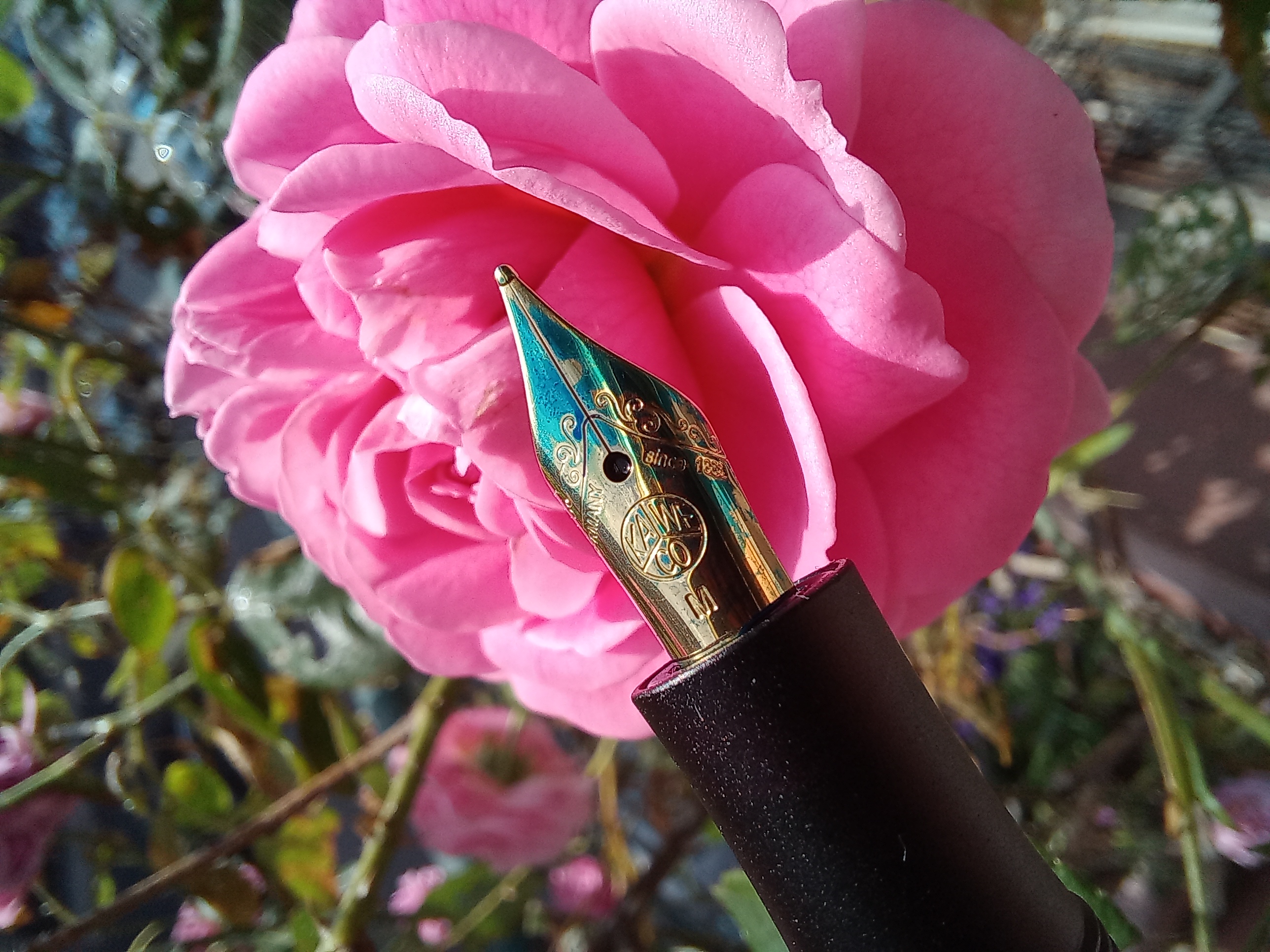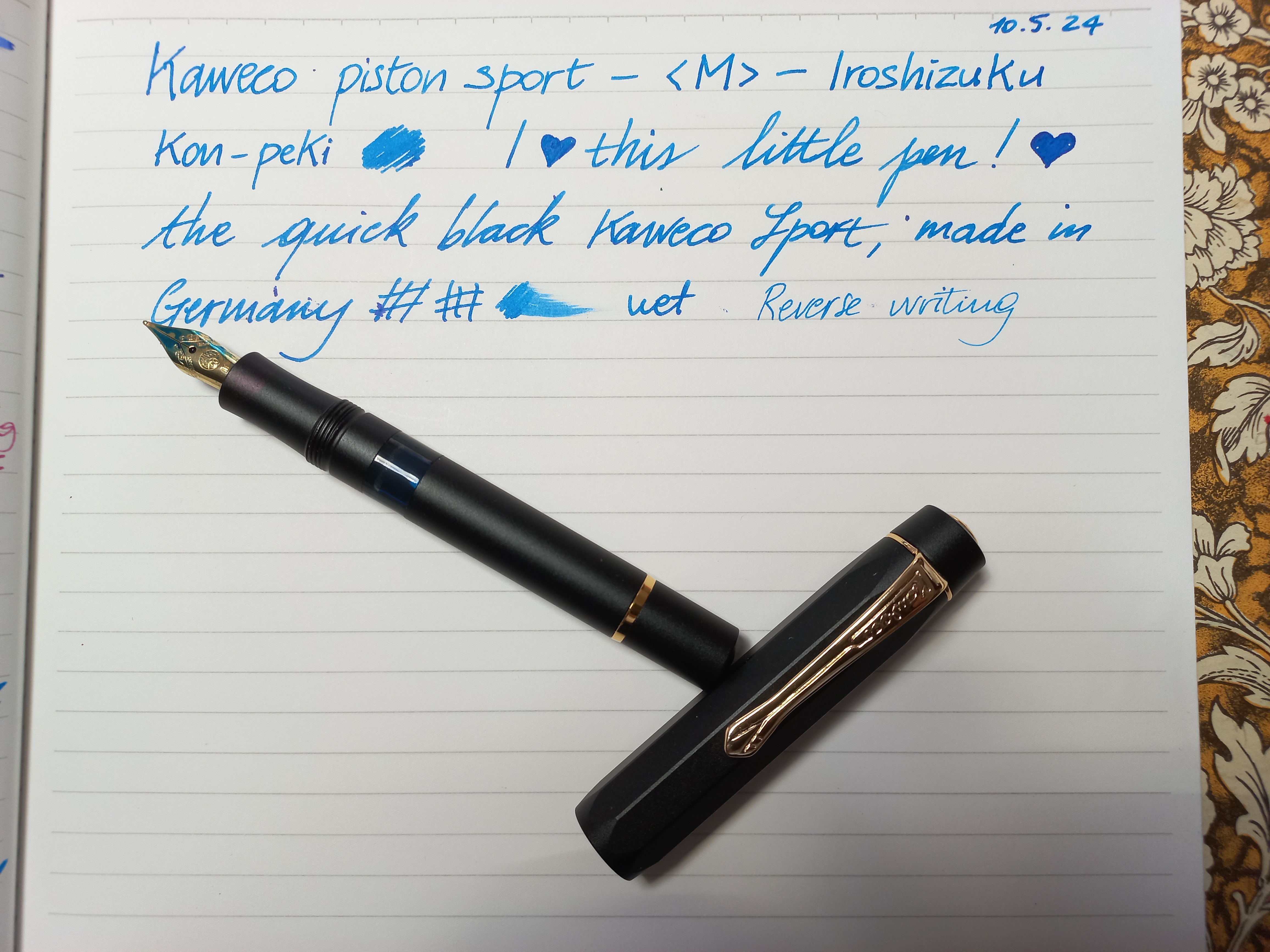 Anche questa penna l'ho equipaggiata con una EF. Sulla tomoe del mio taccuino scorre liscia come la Z52 della Lamy. Lo spessore del tratto con i miei inchiostri soliti (Diamine Indigo e Jet Black) è più un F. Non so a cosa sia dovuto, ma, mentre con le altre Al Sport (montate con pennini EF, F, e DB e mini converter) l'inchiostro Jet Black secca in punta anche solo dopo 1 minuto che la penna è senza cappuccio, con questa sono arrivato a 10 minuti senza false partenze subito dopo.
