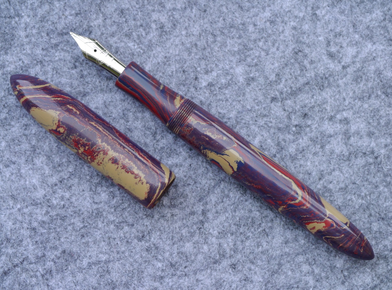 L'ebanite usata su questa penna è una premium, denominata pink, blue, pale yellow (soffermandomi una attimo su questa denominazione, si tratta di una tipica pragmatica "furbizia" Ranga. I coloranti originali usati per creare questa ebanite sono il blu, il rosso e il bianco, tuttavia durante la miscelazione e la cottura (vulcanizzazione) i colori cambiano. Mischiandosi, il blu e il rosso formano un colore rosato, il blu diventa quasi viola, e il bianco si sporca e ingiallisce. Dato che qualche "testa di legno" in passato si era lamentata che la penna non fosse "davvero" blu, rossa e bianca, ecco che Ranga gli ha cambiato nome! ora WYSIWYG