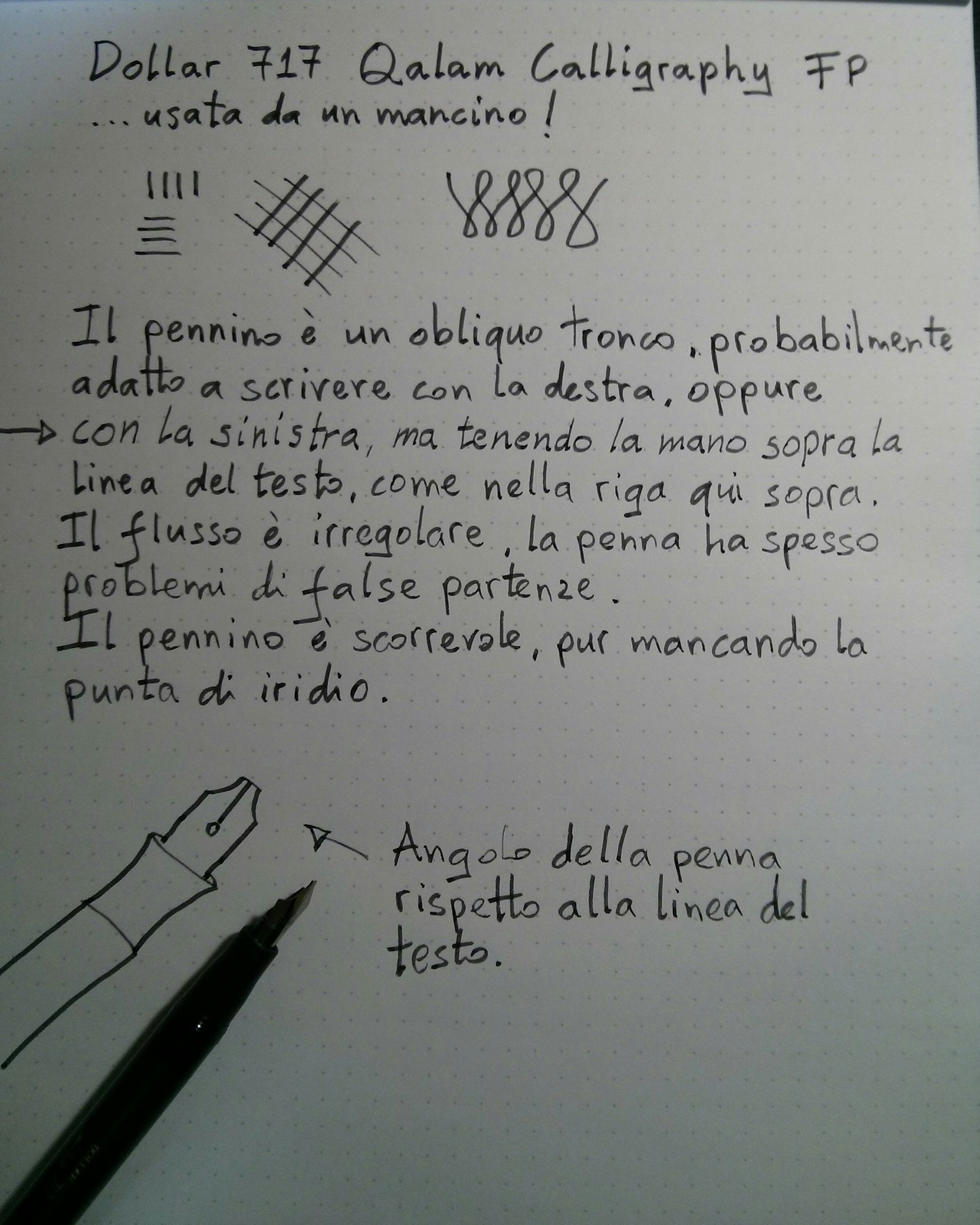 courthand ha scritto:Neppure io conosco il pennino "da architetto" ma se è uguale a quelli per scritture arabe et similia in commercio c'è la Dollar 717 Calligraphic che monta un pennino di quel tipo: la trovi in rete a pochi euro e potrebbe essere un'ottimo strumento per sperimentare la cosa prima di passare a qualcosa di più impegnativo; ne possiedo una e devo dire che, aldilà della non eccessiva differenza fra tratto fine e grosso (parlando di forma calligrafica e non di scrittura corrente) il pennino scorre veramente bene e l'esperienza di scrittura è gradevole, anche scrivendo con la destra.