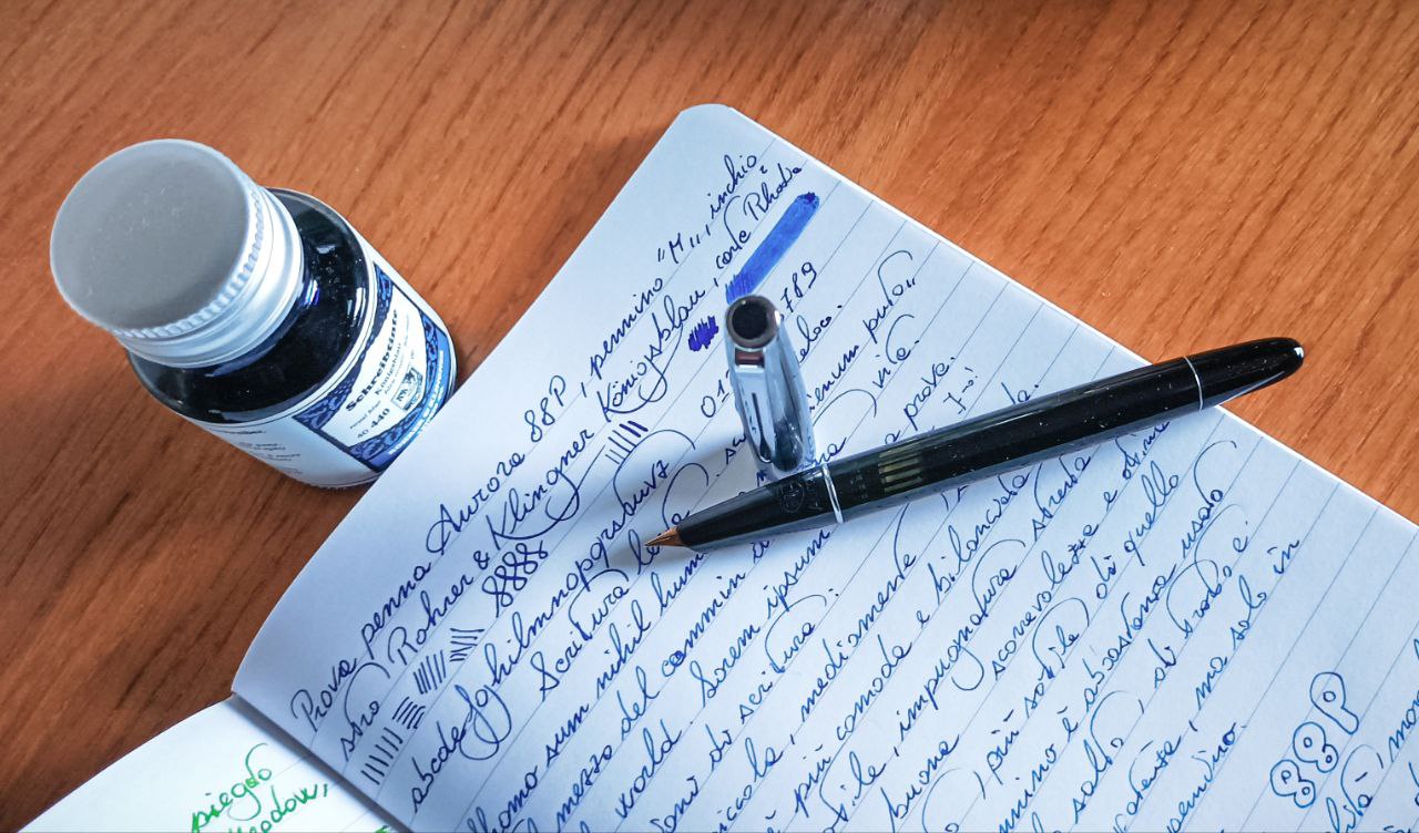 Le ho messe a bagno a spurgar inchiostro, oggi finalmente ho potuto provare la prima (l'unica che abbia smesso di macchiare l'acqua), non prima di aver anche riallineato i rebbi del pennino.