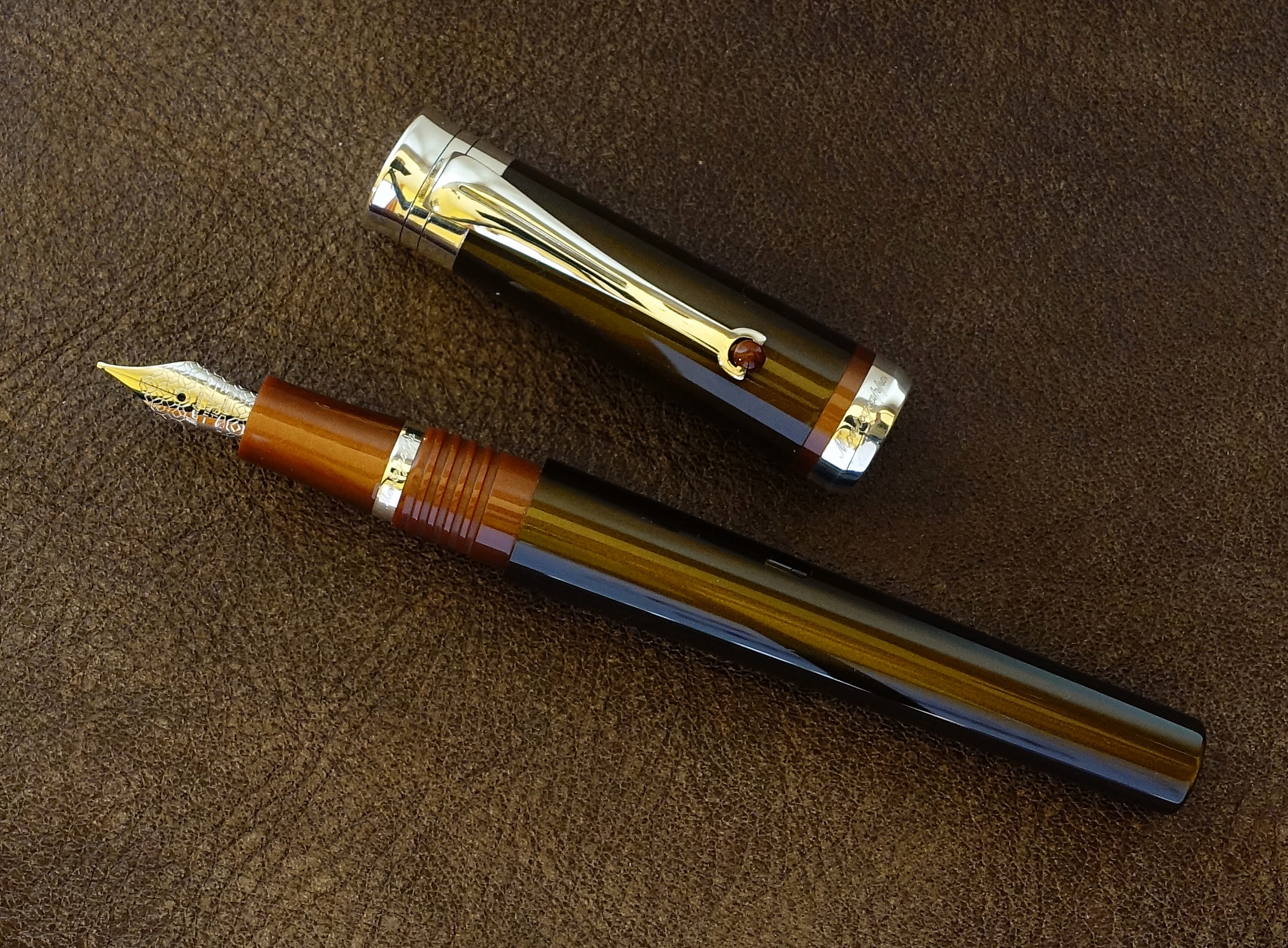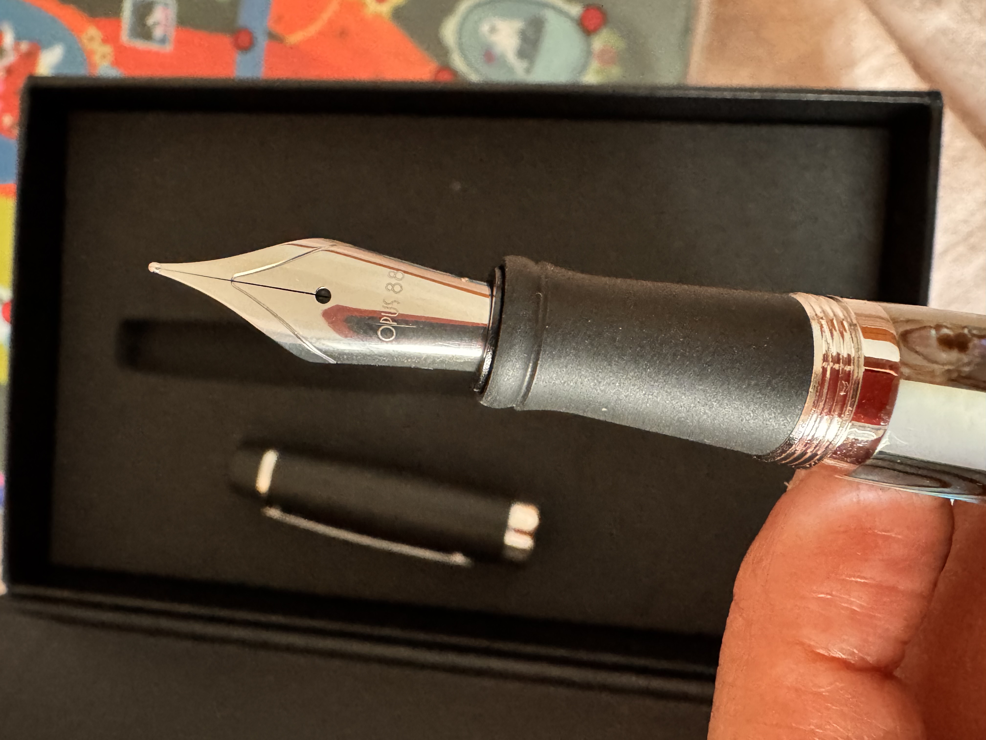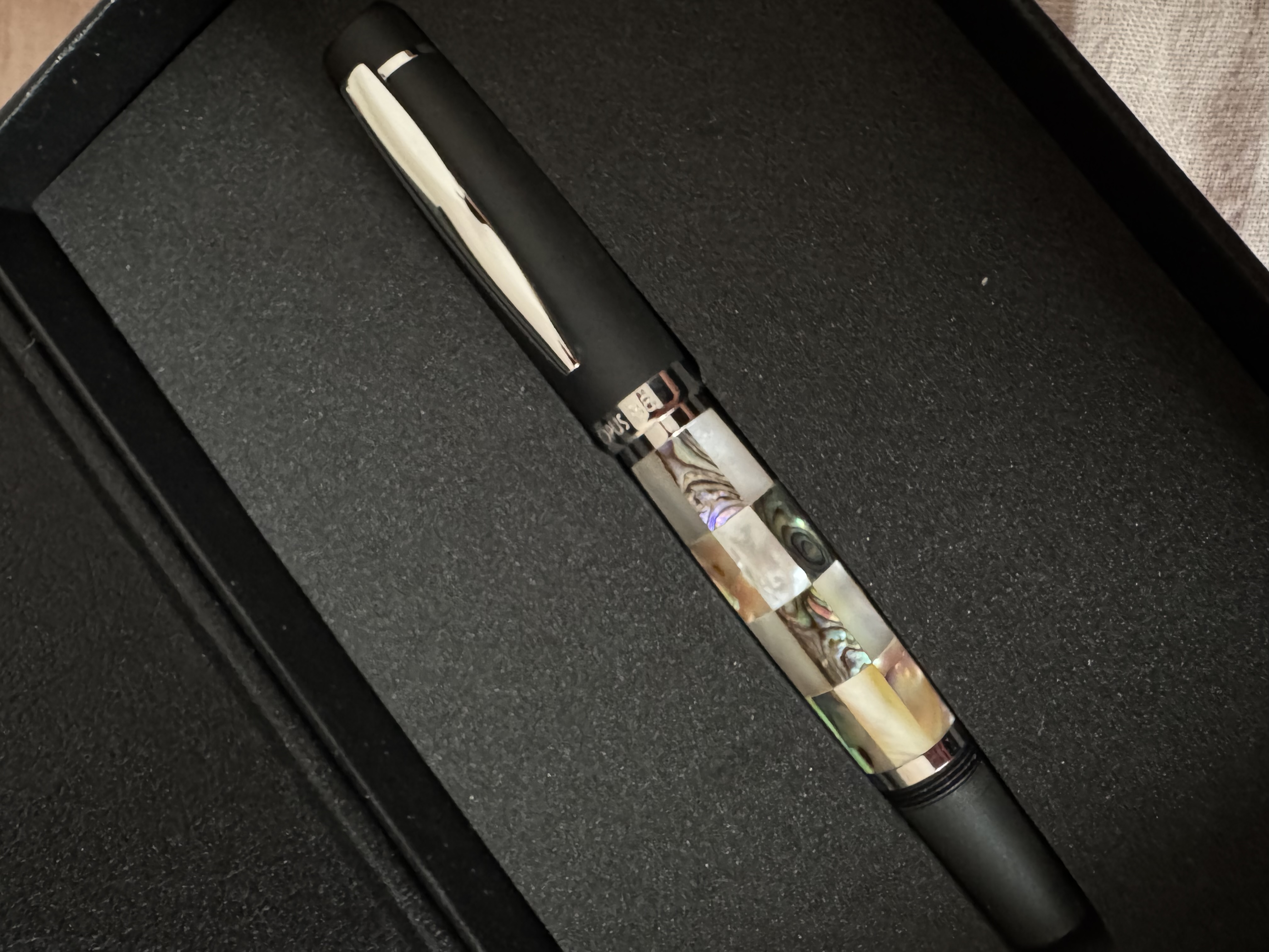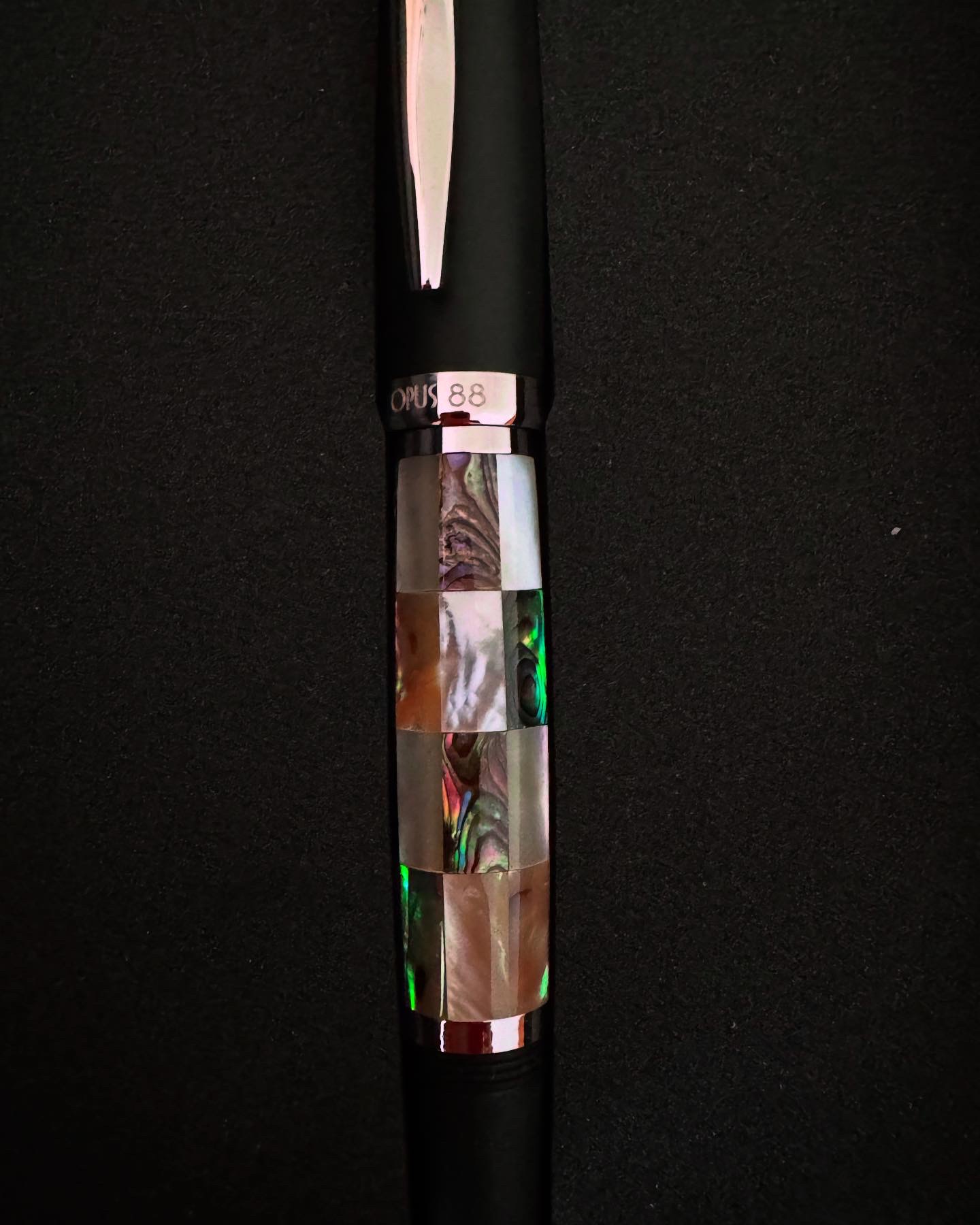 Mi sono lasciata tentare dalla madreperla, grazie a un vecchio amore per i bottoni, e la costruzione a scacchiera che dona un certo brio a questa Opus88 - Checked Shell Pen. Pennino rodiato <F>. Quando l’ho presa in mano il primo pensiero è stato: E’ sbilanciata, è troppo “zigalona” (kitch), non so se mi piace… etc. etc.