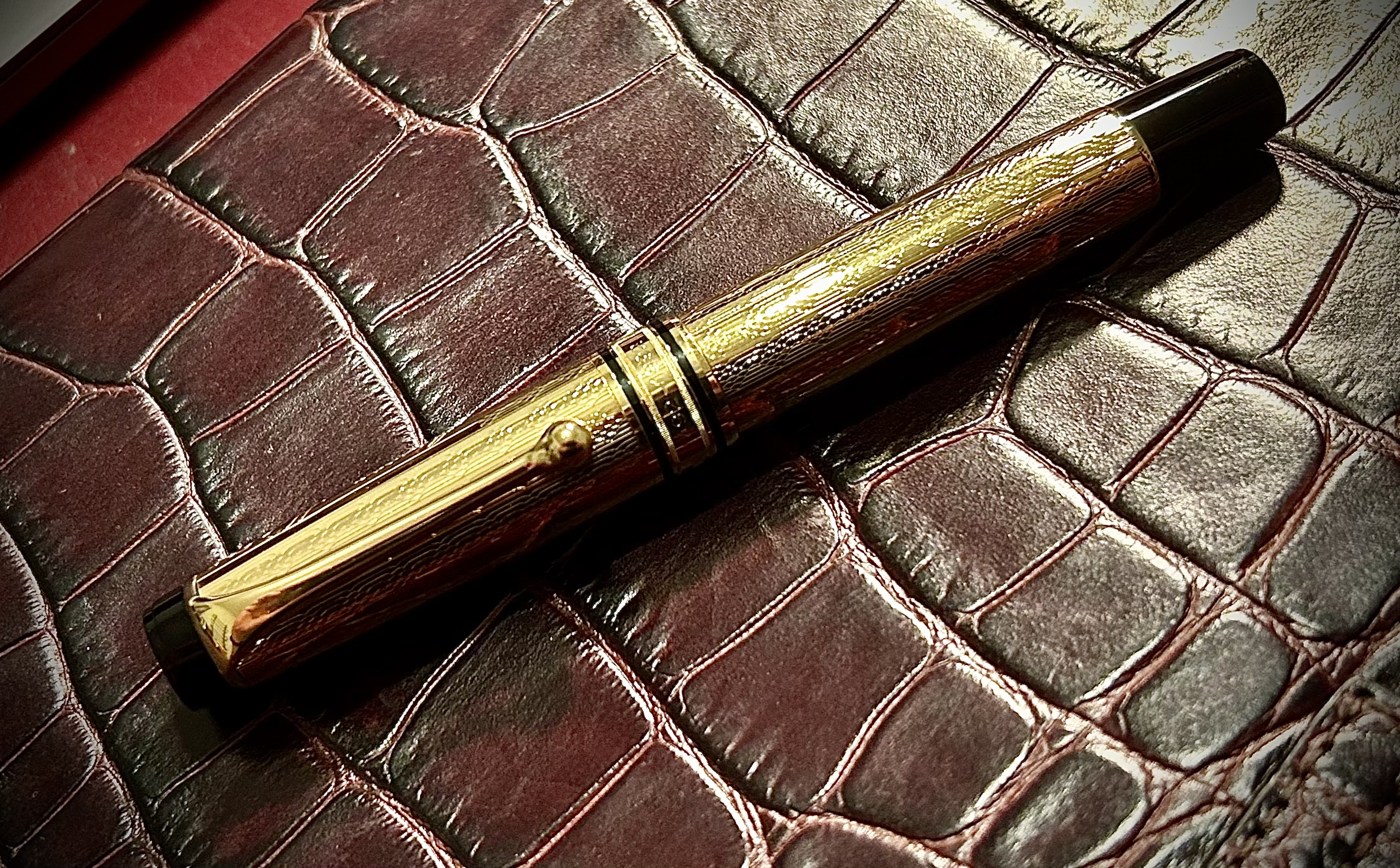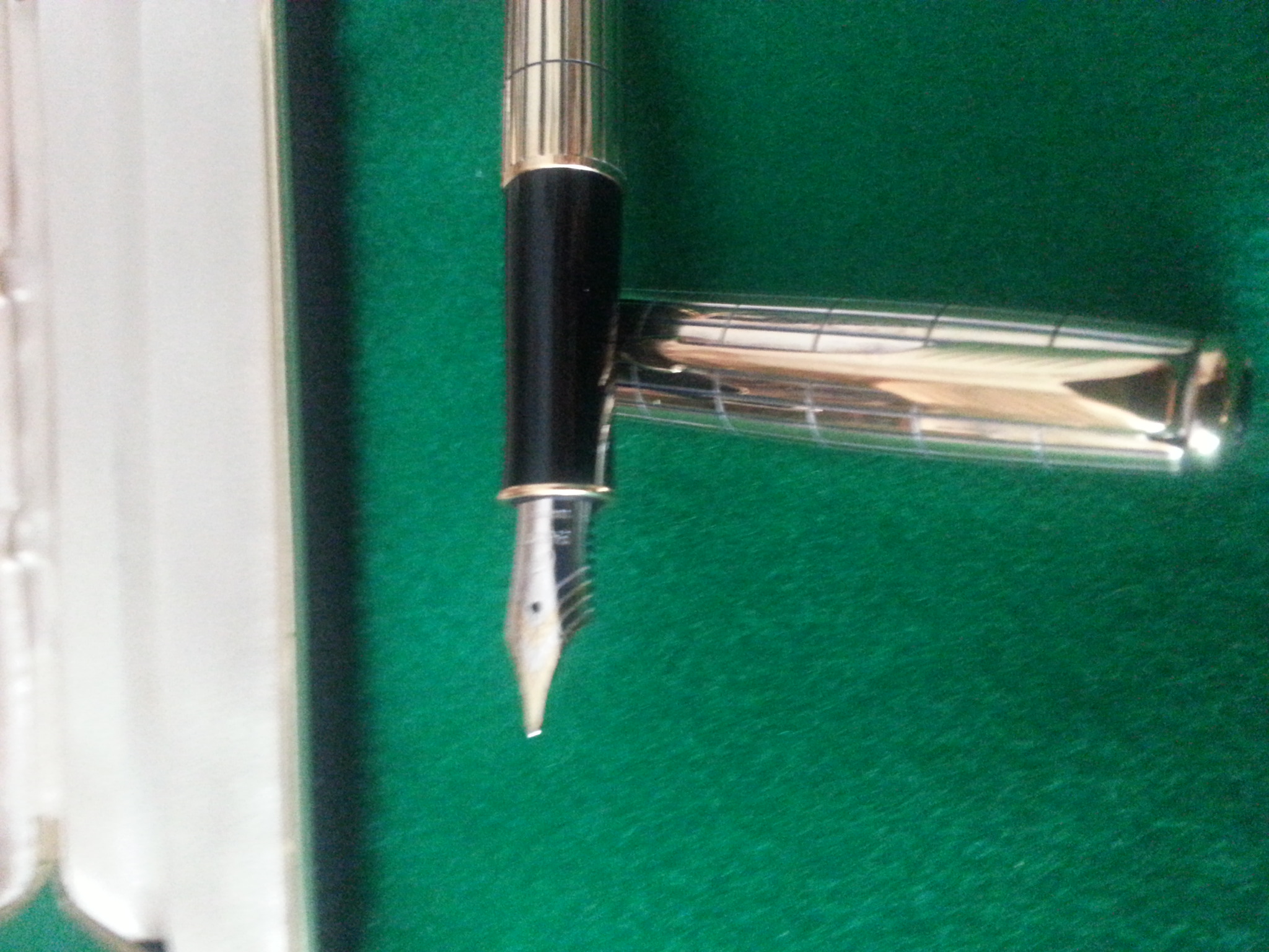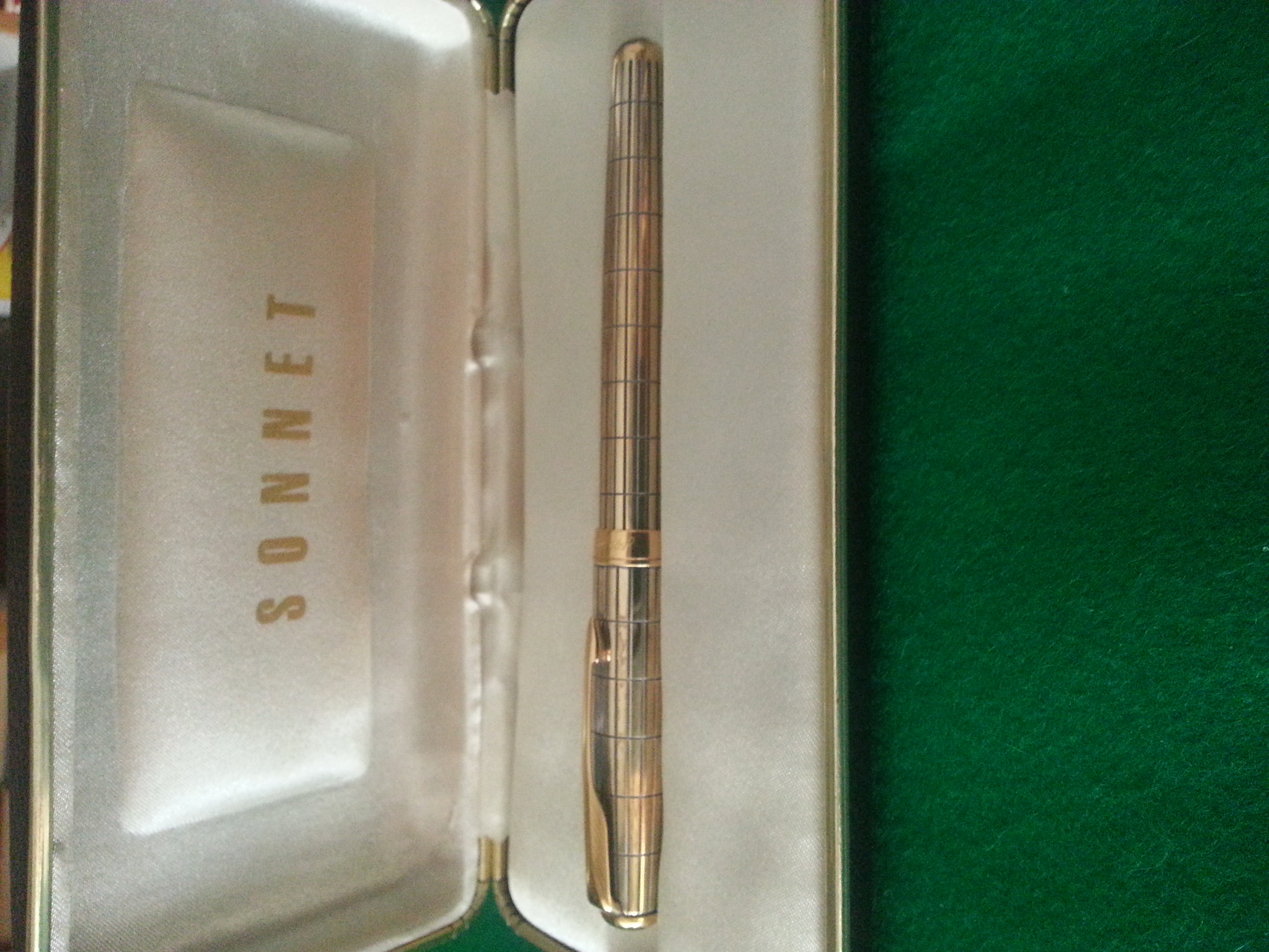 Io continuo ad essere in piena fase Parker, e l'ultima arrivata non poteva che essere una Sonnet assai inconsueta. E una edizione speciale uscita una ventina d'anni or sono ed è l'unica Sonnet in vermeil (argento sterling con placcatura oro). La livrea ricorda molto le scaglie di un coccodrillo.