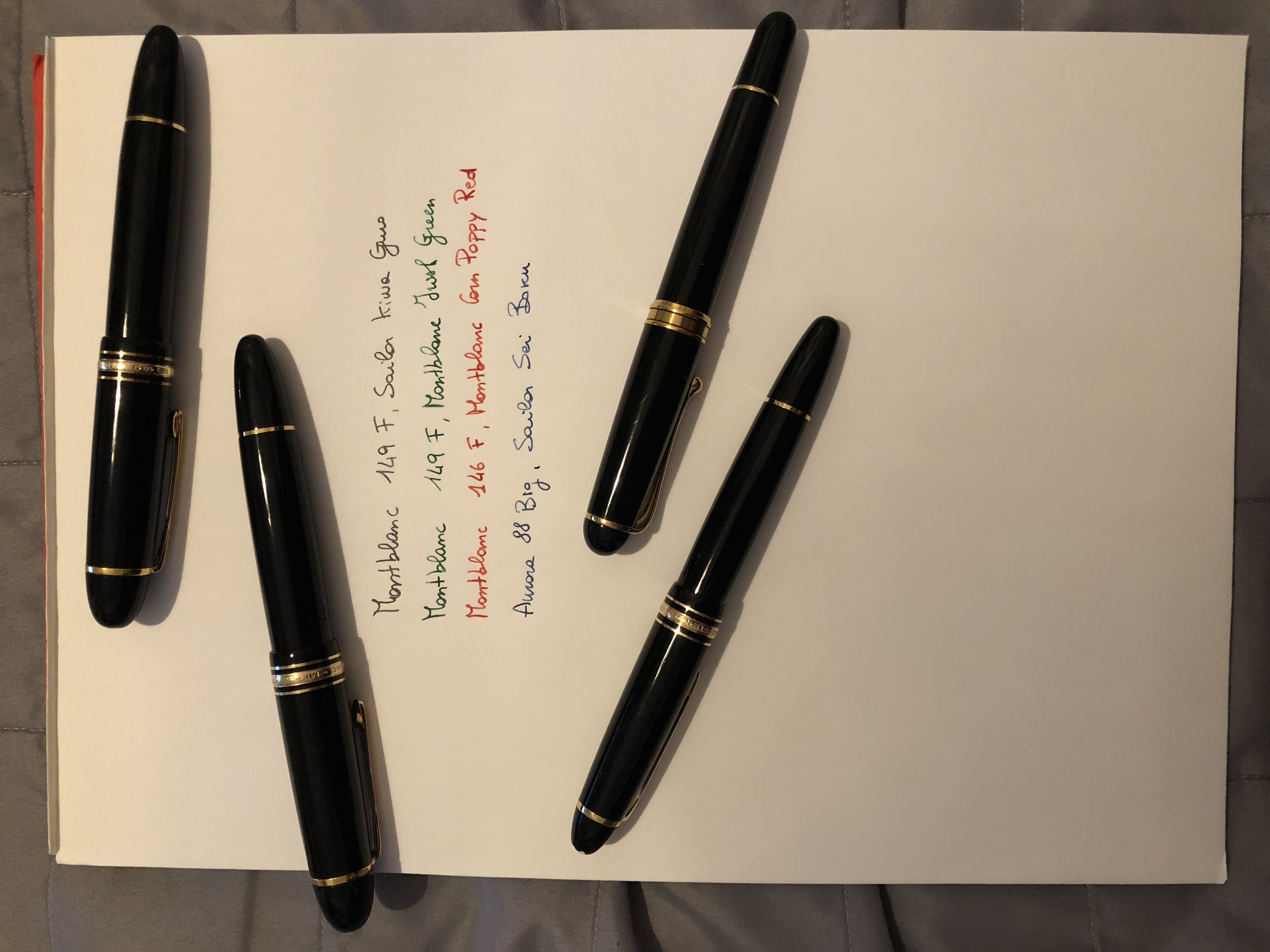 ink: Aurora*Delta*Diamine*J.Herbin*Montblanc*Noodler's*Leonardo*Omas*Pelikan*Pilot Iroshizuku*Sailor*Visconti*Waterman