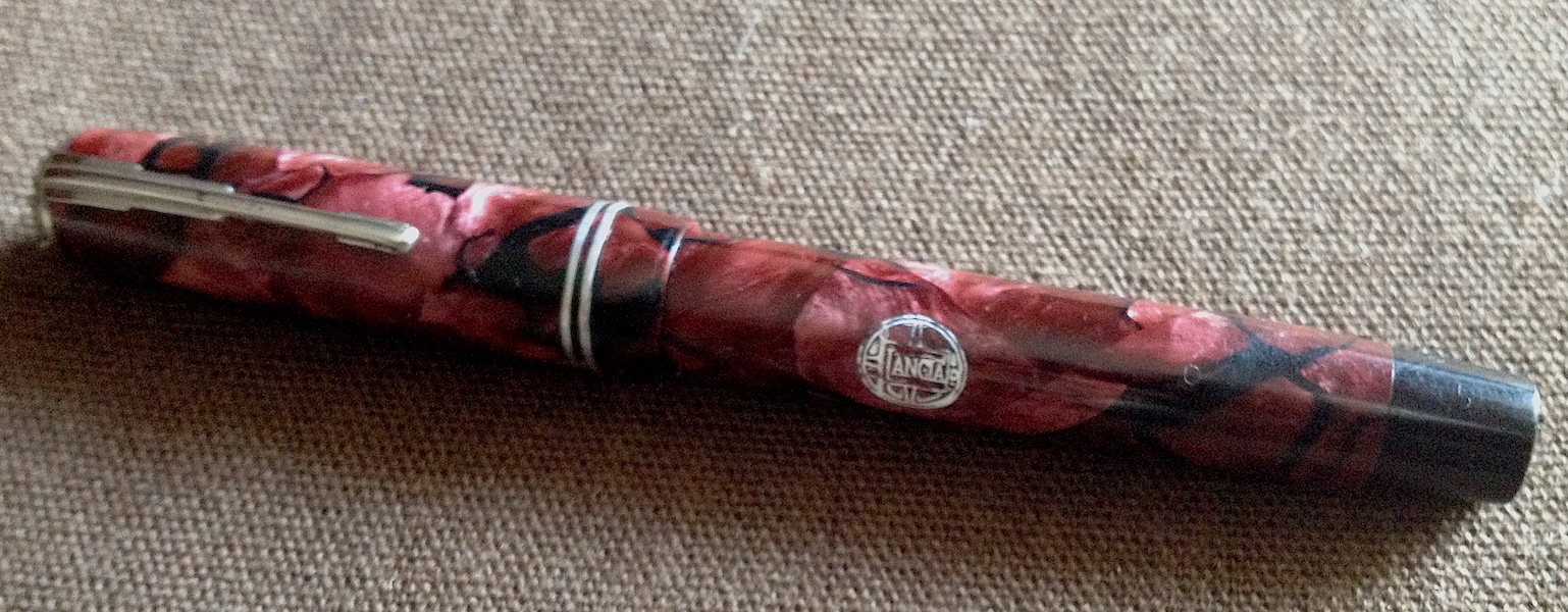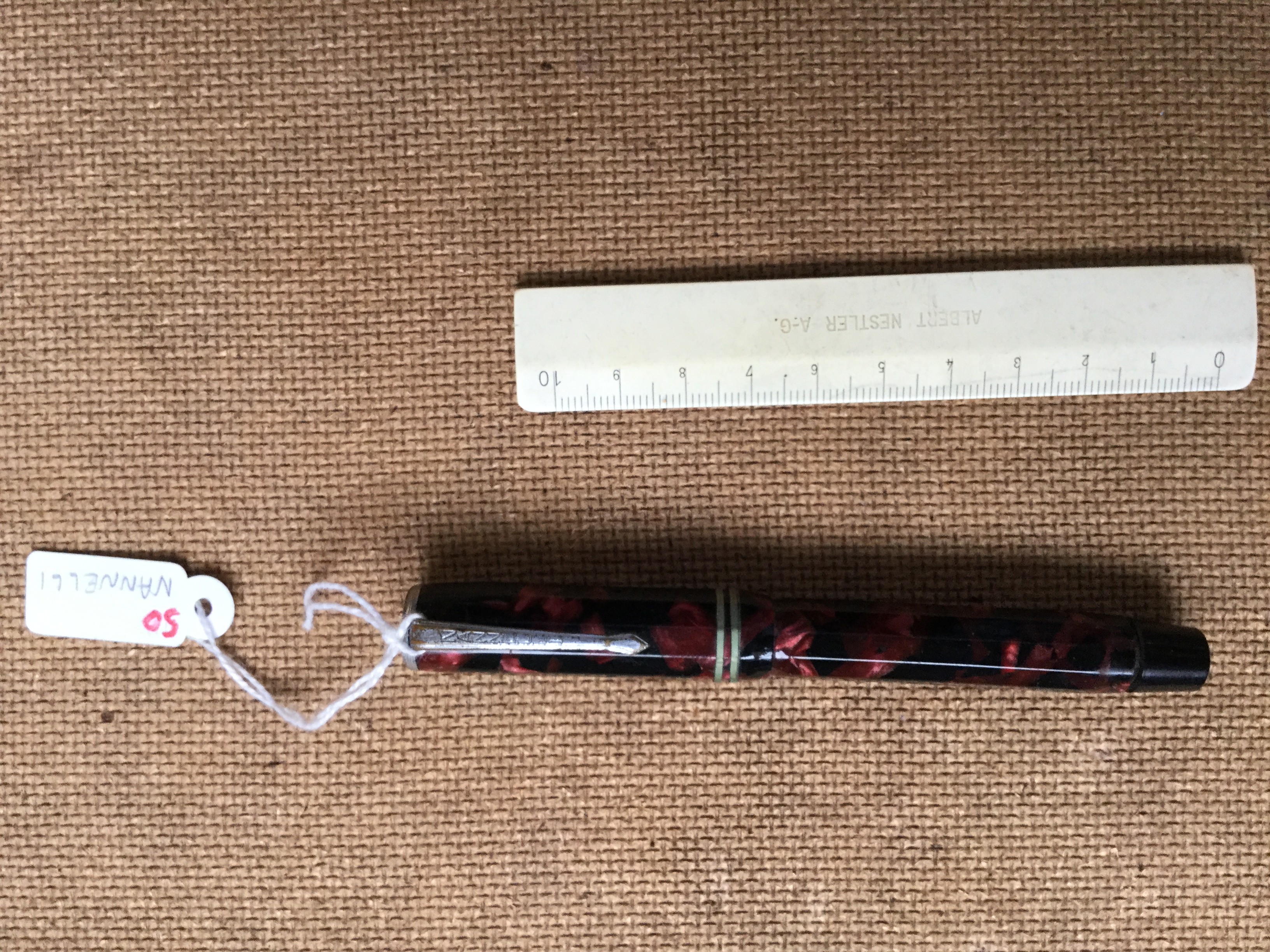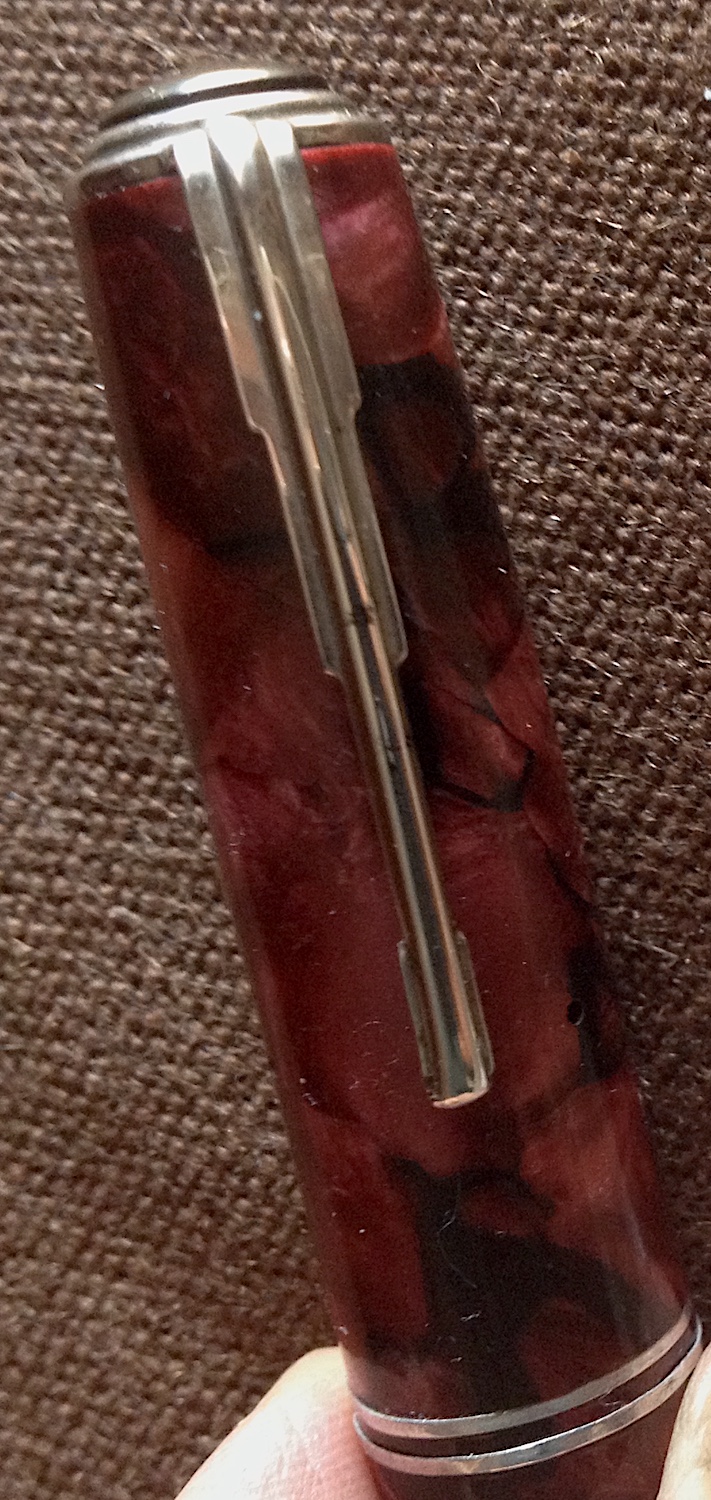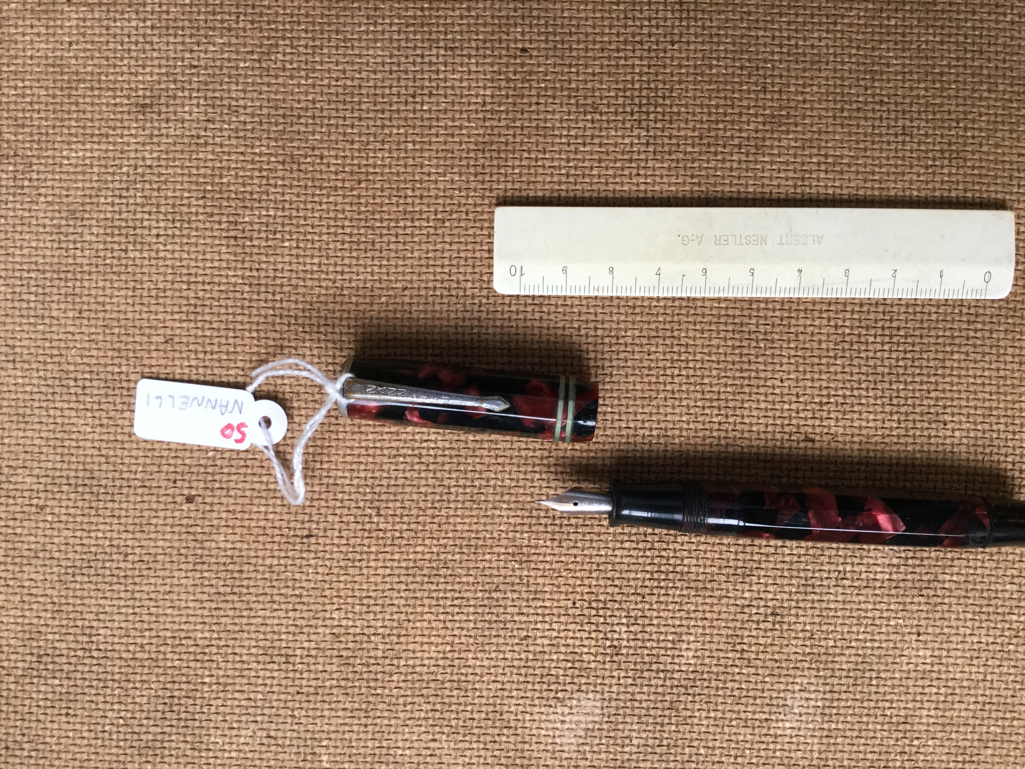 E parlando del noto forumista torinese, questa Atena l'ho presa da lui. Come dite voi è un pennone: lunga 13,5 cm, il fusto ha un diametro di 13mm, il suo pennino, n°6, ha i rebbi lunghissimi e flessibili. Inusuale il colore, rosso vino ed il marchio Lancia (ebbene sì sono un lancista, portate pazienza). Qui l'uni-Posca ha un pò sbavato, ma correggerò. Essendo stata prodotta dall'Aurora nel periodo bellico, circa 1941-42, ha la clip e le verette "scarsine". Un ex-concessionario Lancia mi ha raccontato che il nonno, concessionario di Torino, ne aveva ritirate 3/4 all' ufficio commerciale per assegnarle ai direttori vendite. Anche lui ne ha una (verde).