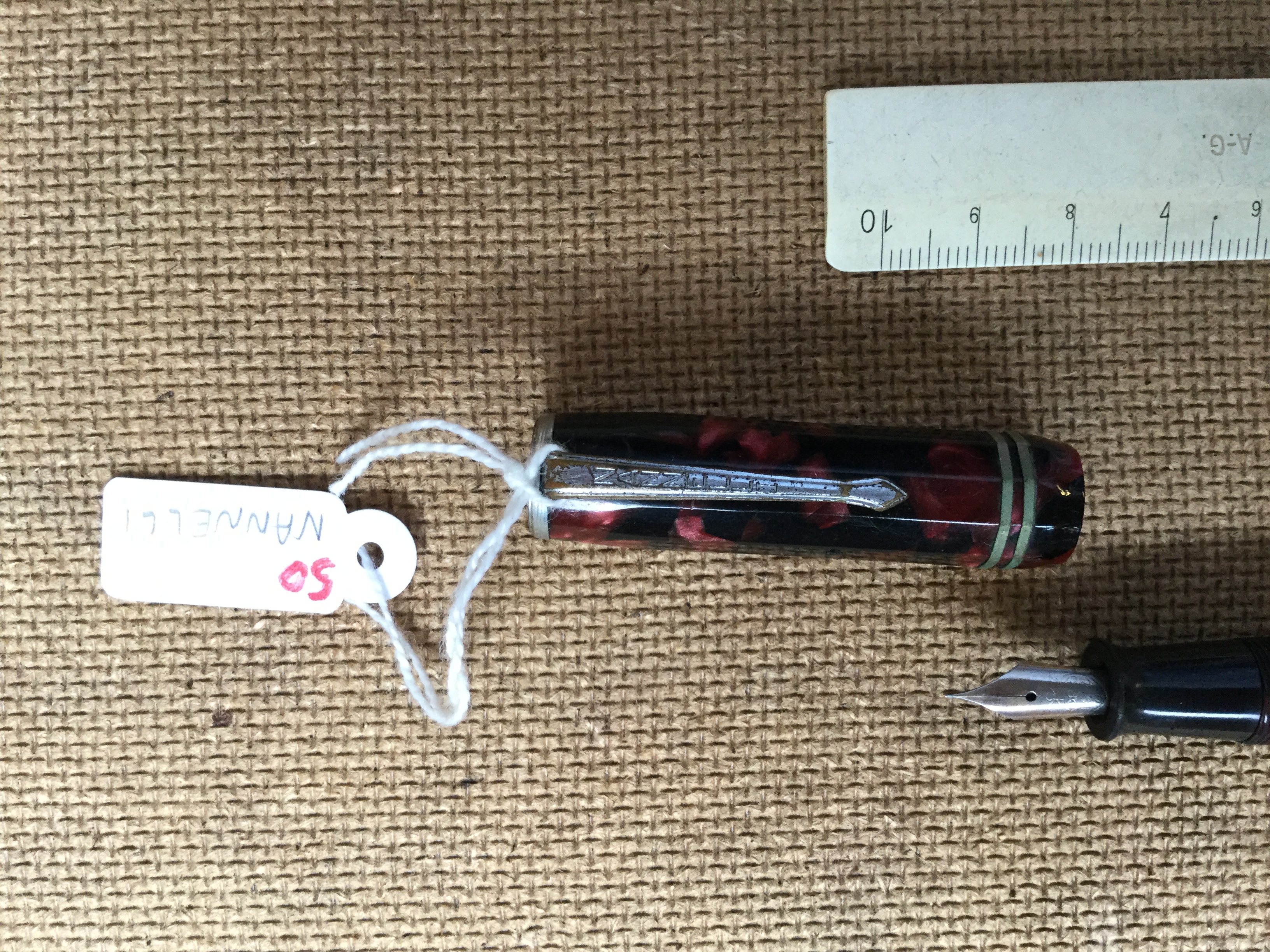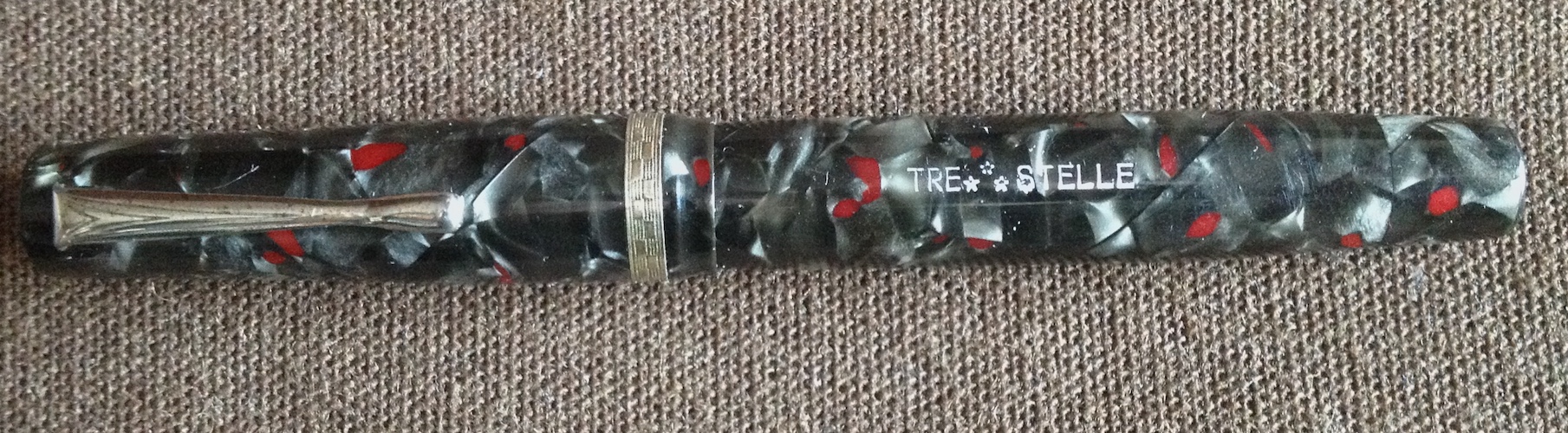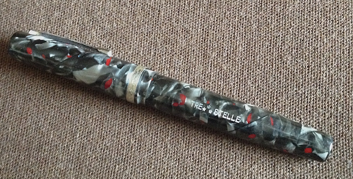 Dunque questa penna è un'acquisto recente sulla "baia". Si tratta di una Tre stelle, prodotta dalla Giacomazzi di Settimo Torinese per la cartoleria Massari di via Roma 16 a Torino. E' lunga 12,5 cm ed ha un fusto del calibro di 14mm. Il pennino e' un Rapid 14K. A meno che non sia in oro bianco.... è chiaramente una bufala e secondo me è un rimpiazzo successivo. Studierò qualcosa di meglio. Invece mi piace molto la veretta, che è inusuale. E' stata lucidata a mano con la pasta Iosso, come mi avete insegnato qui, mentre la scritta è riapparsa grazie all'uni Posca bianco, come mi ha insegnato un noto forumista torinese, collezionista di Aurora ed incredibilmente competente oltre che simpatico.